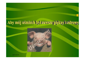 2007-04-09 1 Paweł Gut Mateusz Ziółkowski 2007-04-09 2 • Rozdział pierwszy - Informacje o próchnicy. • Rozdział drugi - Informacje o zębie i jego budowie. • Rozdział trzeci - ABC higieny jamy ustnej. • Rozdział czwarty - Choroby jamy ustnej. • Rozdział piąty - Pojęcia ze stomatologii. 2007-04-09 3 2007-04-09 4 2007-04-09 5 2007-04-09 6 Próchnica zębów to choroba bakteryjna zębów powodująca uszkodzenie tkanek zęba. W konsekwencji może prowadzić do utraty zęba lub zapalenia otaczających go tkanek. W ekstremalnych przypadkach może być źródłem zakażenia odległych narządów (typowym przykładem jest zapalenie tęczówki oka). 2007-04-09 7 • Przyczyny Aby doszło do rozwoju próchnicy muszą jednocześnie zaistnieć cztery czynniki: 1. bakterie 2. cukry 3. podatność zębów 4. czas • Każdy z nich jest czynnikiem koniecznym, lecz niewystarczającym, do powstania próchnicy. 2007-04-09 8 • Głównymi bakteriami odpowiedzialnymi za rozwój próchnicy są streptokoki. Bakterie te są zdolne do wytwarzania kwasów w wyniku metabolizowania cukrów (głównie kwas mlekowy). Zakwaszone środowisko sprzyja demineralizacji szkliwa. W ten sposób ząb zostaje pozbawiony swojej najważniejszej ochrony przed środowiskiem zewnętrznym a bakterie mogą penetrować w jego głąb. 2007-04-09 9 Ponadto bakterie te uczestniczą w powstawaniu płytki nazębnej. Stanowi ona doskonałe środowisko dla rozwoju bakterii pierwotnie tlenowych a z czasem względnie beztlenowych 2007-04-09 • 10 Cukry są podstawą metabolizmu bakterii. ¾ Znajdują się w różnych pokarmach w różnych ilościach. ¾ Cukry występujące naturalnie w pokarmach mają niewielkie znaczenie dla rozwoju próchnicy. Większą rolę odgrywają rafinowane cukry sztucznie dodawane do pokarmów. ¾ Cukry różnią się swoim działaniem próchnicotwórczym. 2007-04-09 11 Najbardziej do rozwoju próchnicy predysponują glukoza, sacharoza i fruktoza! Skrobia ma znikomy wpływ na rozwój próchnicy. Sztuczny środek słodzący - słodzik jest to otrzymywany syntetycznie związek chemiczny mający słodki smak i zastępujący cukier jadalny (substytut cukru). 2007-04-09 12 • Podatność na próchnicę jest cechą osobniczą. Zapadalność na próchnicę jest różna u różnych osób. Wynika to zarówno z predyspozycji genetycznych jak i z warunków socjalnych, w których rozwijał się i przebywa człowiek. Dostarczanie wapnia i fluoru w okresie płodowym jak i w okresie wzrostu ma bardzo duży wpływ na podatność zębów na próchnicę. 2007-04-09 13 Aby doszło do powstania próchnicy trzy powyższe czynniki muszą zaistnieć jednocześnie odpowiednio długo w czasie. Nawet wysokie spożycie cukru przy podatnych na próchnicę zębach nie musi prowadzić do rozwoju tej choroby! Warunkiem jest jednak dokładne i częste oczyszczanie zębów z pozostałości pokarmowych! 2007-04-09 14 2007-04-09 15 2007-04-09 16 Ząb – złożony twardy twór anatomiczny zlokalizowany u zwierząt kręgowych w jamie ustnej, służący głównie do rozdrabniania pożywienia, a ponadto u niektórych zwierząt również do ataku (drapieżniki) i obrony. Zęby występują w jamie gębowej większości kręgowców, jednak najbardziej zróżnicowane są u ssaków. U człowieka rozwojowo rozróżniamy: zęby mleczne i zęby stałe. Różnią się one między sobą budową. 2007-04-09 17 Ząb składa się z korony, szyjki i jednego lub więcej korzeni. W zależności od przyjętego podziału korona i korzeń są różnie definiowane. Według podziału zwanego anatomicznym, korona jest częścią zęba pokrytą szkliwem, według podziału klinicznego jest to ta część zęba, która znajduje się ponad dziąsłem. 2007-04-09 18 • Szkliwo - tkanka pokrywająca zębinę w obrębie korony zęba. Zbudowane jest w 96-98% z materii nieorganicznej w postaci kryształów dwuhydroksyapatytu, czego efektem jest niezwykła twardość. Pozostałe 2-4% szkliwa stanowią związki organiczne i woda. Jako jedyna część zęba powstaje z komórek nabłonkowych – ameloblastów. Szkliwo jest najtwardszą tkanką organizmu. 2007-04-09 19 Zębina - tkanka leżąca pod szkliwem w obrębie korony zęba i pod cementem w obrębie szyjki i korzenia zęba. Zbudowana jest w 69% z części nieorganicznej w postaci kryształów dwuhydroksyapatytu i w 20% z materii organicznej w postaci kolagenu, protein, lipidów i mukopolisacharydów oraz wody. Zębina jest wytworem cementoblastów. W porównaniu ze szkliwem jest słabszą tkanką i jej odporność na zgniatanie wynosi 250-350 MPA. Funkcja zębiny to: ¾ ochrania miazgę przed wpływem szkodliwych czynników ¾ jest bardzo wrażliwa na bodźce, na temperaturę reaguje bólem ¾ z czasem reakcja na bodźce się zmniejsza bo kanaliki się zamykają ¾ bierze udział w metabolizmie szkliwa i2007-04-09 cementu 20 • Formuła zębowa: Dorosły człowiek ma 32 zęby – 16 w szczęce i 16 w żuchwie: • • • • 4 siekacze 2 kły 4 zęby przedtrzonowe 6 trzonowych Dziecko o uzębieniu mlecznym ma w każdym łuku: • 4 siekacze • 2 kły • 4 trzonowce Siekacze służą do odgryzania kęsów, kły do rozrywania pokarmu, zęby trzonowe i przedtrzonowe do jego rozcierania. 2007-04-09 21 2007-04-09 22 2007-04-09 23 • Jak dbać o zęby małego dziecka? Przekazanie dziecku właściwych przyzwyczajeń w utrzymywaniu higieny jamy ustnej to jedna z najważniejszych rzeczy, jakich możesz je nauczyć w zakresie troski o własne zdrowie. 9 9 9 9 Polega to na: pomocy w szczotkowaniu zębów rano i wieczorem pokazaniu prawidłowego sposobu stosowania nici dentystycznej ograniczaniu podjadania pomiędzy posiłkami odbywaniu regularnych wizyt u stomatologa 2007-04-09 24 >Nałóż na szczoteczkę odrobinę (tj. porcję wielkości ziarnka grochu) fluorkowej pasty do zębów. >Uważaj, aby dziecko nie połykało pasty. >Przy pomocy szczoteczki o miękkich włóknach najpierw szczotkuj wewnętrzne powierzch
