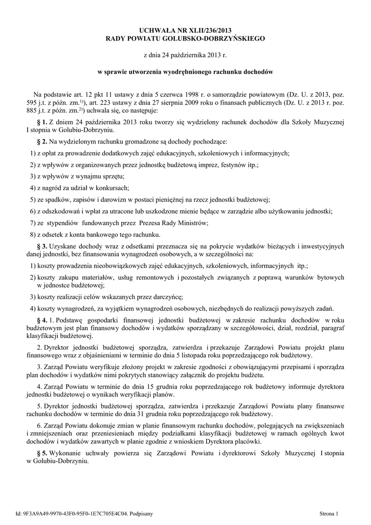 UCHWAŁA NR XLII/236/2013 RADY POWIATU GOLUBSKO-DOBRZYŃSKIEGO z dnia 24 października 2013 r. w sprawie utworzenia wyodrębnionego rachunku dochodów Na podstawie art. 12 pkt 11 ustawy z dnia 5 czerwca 1998 r. o samorządzie powiatowym (Dz. U. z 2013, poz. 595 j.t. z późn. zm.1)), art. 223 ustawy z dnia 27 sierpnia 2009 roku o finansach publicznych (Dz. U. z 2013 r. poz. 885 j.t. z późn. zm.2)) uchwala się, co następuje: § 1. Z dniem 24 października 2013 roku tworzy się wydzielony rachunek dochodów dla Szkoły Muzycznej I stopnia w Golubiu-Dobrzyniu. § 2. Na wydzielonym rachunku gromadzone są dochody pochodzące: 1) z opłat za prowadzenie dodatkowych zajęć edukacyjnych, szkoleniowych i informacyjnych; 2) z wpływów z organizowanych przez jednostkę budżetową imprez, festynów itp.; 3) z wpływów z wynajmu sprzętu; 4) z nagród za udział w konkursach; 5) ze spadków, zapisów i darowizn w postaci pieniężnej na rzecz jednostki budżetowej; 6) z odszkodowań i wpłat za utracone lub uszkodzone mienie będące w zarządzie albo użytkowaniu jednostki; 7) ze stypendiów fundowanych przez Prezesa Rady Ministrów; 8) z odsetek z konta bankowego tego rachunku. § 3. Uzyskane dochody wraz z odsetkami przeznacza się na pokrycie wydatków bieżących i inwestycyjnych danej jednostki, bez finansowania wynagrodzeń osobowych, a w szczególności na: 1) koszty prowadzenia nieobowiązkowych zajęć edukacyjnych, szkoleniowych, informacyjnych itp.; 2) koszty zakupu materiałów, usług remontowych i pozostałych związanych z poprawą warunków bytowych w jednostce budżetowej; 3) koszty realizacji celów wskazanych przez darczyńcę; 4) koszty wynagrodzeń, za wyjątkiem wynagrodzeń osobowych, niezbędnych do realizacji powyższych zadań. § 4. 1. Podstawę gospodarki finansowej jednostki budżetowej w zakresie rachunku dochodów w roku budżetowym jest plan finansowy dochodów i wydatków sporządzany w szczegółowości, dział, rozdział, paragraf klasyfikacji budżetowej. 2. Dyrektor jednostki budżetowej sporządza, zatwierdza i przekazuje Zarządowi Powiatu projekt planu finansowego wraz z objaśnieniami w terminie do dnia 5 listopada roku poprzedzającego rok budżetowy. 3. Zarząd Powiatu weryfikuje złożony projekt w zakresie zgodności z obowiązującymi przepisami i sporządza plan dochodów i wydatków nimi pokrytych stanowiący załącznik do projektu budżetu. 4. Zarząd Powiatu w terminie do dnia 15 grudnia roku poprzedzającego rok budżetowy informuje dyrektora jednostki budżetowej o wynikach weryfikacji planów. 5. Dyrektor jednostki budżetowej sporządza, zatwierdza i przekazuje Zarządowi Powiatu plany finansowe rachunku dochodów w terminie do dnia 31 grudnia roku poprzedzającego rok budżetowy. 6. Zarząd Powiatu dokonuje zmian w planie finansowym rachunku dochodów, polegających na zwiększeniach i zmniejszeniach oraz przeniesieniach między podziałkami klasyfikacji budżetowej w ramach ogólnych kwot dochodów i wydatków zawartych w planie zgodnie z wnioskiem Dyrektora placówki. § 5. Wykonanie uchwały powierza się Zarządowi Powiatu i dyrektorowi Szkoły Muzycznej I stopnia w Golubiu-Dobrzyniu. Id: 9F3A9A49-9970-43F0-95F0-1E7C705E4C04. Podpisany Strona 1 § 6. Uchwała wchodzi w życie z dniem podjęcia i podlega ogłoszeniu na tablicy ogłoszeń Starostwa Powiatowego. Przewodniczący Rady Powiatu Golubsko - Dobrzyńskiego Jacek Foksiński 1) Zmiana 2) Zmiana wymienionej ustawy została ogłoszona w Dz. U. z 2013 r., poz.645. wymienionej ustawy została ogłoszona w Dz. U. z 2013 r., poz. 938. Id: 9F3A9A49-9970-43F0-95F0-1E7C705E4C04. Podpisany Strona 2 Uzasadnienie Placówki oświatowe prowadzone przez Powiat posiadają rachunki dochodów. Szkoła Muzyczna I stopnia jest jednostką nową i po roku działalności zaistniała potrzeba utworzenia rachunku bankowego do pozyskiwania środków ze źródeł jak określono w § 2 uchwały. Wniosek w sprawie utworzenia konta złożył Dyrektor Szkoły Muzycznej I stopnia. Id: 9F3A9A49-9970-43F0-95F0-1E7C705E4C04. Podpisany Strona 1