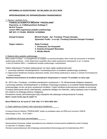 INFORMACJA DODATKOWA DO BILANSU ZA 2012 ROK WPROWADZENIE DO SPRAWOZDANIA FINANSOWEGO 1. Nazwa i siedziba firmy FUNDACJA DOBRYCH MEDIÓW "PRZESŁANIE" Paprotnia, ul. O.Maksymiliana Kolbego 5 96-515 Teresin numer KRS organizacji pożytku publicznego NIP 837-17-79-826 REGON 141929904 Zarząd fundacji: Michał Chylak - dyr. Fundacji, Prezes Zarządu Sylwester Pudło - z-ca dyr. Fundacji,Członek Zarządu Fundacji Organ nadzoru: Rada Fundacji 1. Oniszczuk Jan Krzysztof 2. Kotarba Krzysztof Stanisław 3. Wódka Marek 2. Zadania sfery pożytku publicznego Sfera zadań Fundacji – w szczególności ze względu na szeroką tematykę, która może być poruszana w środkach społecznego przekazu - może obejmować wszystkie sfery zadań publicznych wskazanych w art. 4 ustawie z dnia 24 kwietnia 2003 r. o działalności pożytku publicznego i wolontariacie. Celem statutowym Fundacji realizowanym na rzecz ogółu społeczności jest: 1. promocja wartości chrześcijańskich i humanistycznych w środkach społecznego przekazu, 2. ins[pirowanie działalności służącej ulepszaniu świata, komunikacji społecznej w oparciu o wartości humanistyczne i polską tradycję Działania finansoweane ze środków pieniężnych otrzymanych w ramach 1% podatku na rzecz opp: W 2012 roku, Fundacja, z środków pieniężnych uzyskanych z 1% sfinansowała działania związane z promocją wartości chrześcijańskich w środkach masowego przekazu tj na antenie Radia Niepokalanów przeznaczając na ten cel gros uzyskanych środków. Część środków przeznaczona została na promocję Fundacji (stworzenie śtrony internetowej, uzyskanie dostępu do internetu, zakup laptopa) oraz w niewielkim stopniu na obsługę prawną i księgową. Poniesione koszty administracyjne były niezbędne dla dalszego funkcjonowania Fundacji Bank i numer konta opp do wpłat 1% Bank PEKAO S.A. Nr konta 47 1240 1822 1111 0010 2800 3921 3. Organ rejestrowy fundacji i data rozpoczęcia działalności Fundacja Dobrych Mediów "PRZESŁANIE" działa na podstawie wpisu do KRS pod numerem 332816 dokonanego w dniu 16.07.2009 r. 4. Dodatkowe informacje wprowadzające Sprawozdanie finansowe zostało sporządzone przy założeniu kontynuowania działalności przez fundację co najmniej 12 miesięcy i dłużej. Okresem sprawozdawczym dla niniejszego sprawozdania finansowego jest rok kalendarzowy 2012 W skład spółki nie wchodzą inne jednostki organizacyjne. Przyjęte zasady rachunkowości stosuje się w sposób ciągły, dokonując w kolejnych latach obrotowych jednakowego grupowania operacji gospodarczych, jednakowej wyceny aktywów i pasywów, ustalania wyniku finansowego i sporządza sprawozdanie finansowe tak aby za kolejne lata informacje z nich wynikające były porównywalne. 5. Przyjęte przez fundację zasady rachunkowości, metody wyceny aktywów i pasywów, pomiaru wyniku finansowego oraz sposób sporządzenia sprawozdania finansowego. Sprawozdanie finansowe składa się z: 1) bilansu 2) rachunku zysków i strat 3) informacji dodatkowej i zawiera informacje przewidziane dla jednostek niebędących spółkami handlowymi, nieprowadzących działalności gospodarczej zgodnie z Rozp. Min.Fin. Z dnia 15 listopada 2001 r (Dz.U.z dnia 30 listopada 2001r) DODATKOWE INFORMACJE I OBJAŚNIENIA 1.FUNDUSZE WŁASNE - poz.A.I i II.bilansu Nazwa I II III Fundusz statutowy Fundusz z aktualizacji wyceny Wynik finansowy Wartość 4 309,66 0,00 2. Nadwyżka kosztów nad przychodami (wielkość ujemna) 0,00 -658,58 Razem fundusze własne 3 651,08 1. Nadwyżka przychodów nad kosztami(wielkość dodatnia) Uwagi 2. ŹRÓDŁA ZWIĘKSZENIA I WYKORZYSTANIE FUNDUSZU STATUTOWEGO Wyszczególnienie 1. Stan na początek roku obrotowego a. zwiększenia - z zysku za rok 2010 - inne b. Zmniejszenia - pokrycie straty - inne 2. Stan na koniec okresu obrotowego Statutowy 2 000,00 FUNDUSZ z aktualizacji wyceny 0,00 2 309,66 0,00 0,00 0,00 0,00 0,00 4 309,66 0,00 0,00 0,00 3. ROZLICZENIE WYNIKU NA DZIAŁALNOŚCI STATUTOWEJ Wynik na działalności statutowej -658,58 w tym: nadwyżka kosztów nad przychodami z 2011 r nadwyżka przychodów nad kosztami wynikająca -3 790,00 3 131,42 z działań podjetych w 2012r. 4. ZOBOWIĄZANIA ZWIĄZANE Z DZIAŁNOŚCIĄ STATUTOWĄ Nazwa stan na poczatek roku obrot. 1 gwarancje 2 poręczenia 0,00 0,00 koniec roku obrot. 0,00 0,00 . 3 kaucje i wadia 4 inne zobowiazania Razem 0,00 0,00 0,00 0,00 0,00 0,00 5. ZOBOWIĄZANIA DŁUGOTERMINOWE Z TYTUŁU KREDYTU I POŻYCZEK - poz.B I. bilansu nie występują 6. STOSOWANE METODY WYCENY AKTYWÓW I PASYWÓW a. Wyszczególnienie b. Zmiany stosowanych metod wyceny aktywów i pasywów- przyczyny i wynik Wyszczególnienie zmiany Przyczyny zmiany Przyjęte metody wyceny w zasadach (polityce) rachunkowości Kwota wyniku finansowego spowodowana zmianami 0,00 0,00 0,00 c. Informacja o zdarzeniach gospodarczych po dacie bilansu niujęte w księgach handlowych Wyszczególnienie zdarzeń Kwota Nie uwzględniono w w złotych Bilansie 0,00 0,00 0,00 7. AKTYWA TRWAŁE Rachunku wyników - poz. A. bilansu a) Rzeczowe aktywa trwałe i wartości niematerialne i prawne 1 1 2 3 4 5 Nazwa inne wartości niemat.i prawne Nazwa grunty(prawo w.użytk.gruntu) konto wartość brutto 0,00 umorzenie konto wartość brutto 0,00 0,00 0,00 0,00 0,00 0,00 umorzenie budynki,lokale,obiekty iżynierii lądowej i wodnej urządzenia techniczne i maszyny środki transportu inne środki trwałe Razem 010 wartość netto 0,00 0,00 0,00 0,00 0,00 0,00 0,00 wartość netto 0,00 0,00 0,00 0,00 0,00 0,00 ZESTAWIENIE ZMIAN WARTOŚCI GRUP RODZAJOWYCH ŚRODKÓW TRWAŁYCH Nazwa stan brutto grunty(prawo w.użytk.gruntu) budynki,lokale,obiekty iżynierii lądowej i wodnej urządzenia techniczne i maszyny środki transportu inne środki trwałe Razem sprzedaż 0,00 0,00 0,00 0,00 0,00 modernizacja 0,00 0,00 0,00 0,00 0,00 0,00 0,00 na poczatek roku 1 2 3 4 5 zakup stan brutto likwidacja 0,00 0,00 0,00 0,00 0,00 na koniec roku 0,00 0,00 0,00 0,00 0,00 0,00