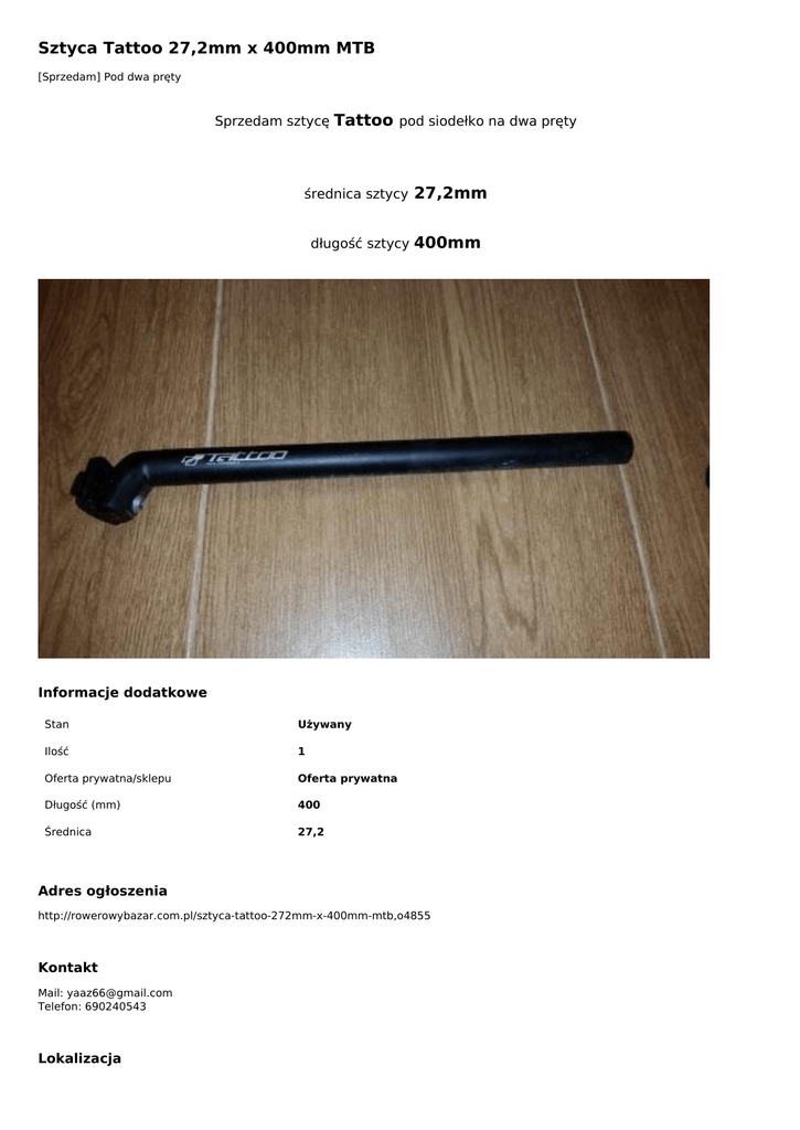 Sztyca Tattoo 27,2mm x 400mm MTB [Sprzedam] Pod dwa pręty Sprzedam sztycę Tattoo pod siodełko na dwa pręty średnica sztycy 27,2mm długość sztycy 400mm Informacje dodatkowe Stan Używany Ilość 1 Oferta prywatna/sklepu Oferta prywatna Długość (mm) 400 Średnica 27,2 Adres ogłoszenia http://rowerowybazar.com.pl/sztyca-tattoo-272mm-x-400mm-mtb,o4855 Kontakt Mail: [email protected] Telefon: 690240543 Lokalizacja , Kraków Małopolskie () Ogłoszenie dodano: 2017-01-11 15:29:31 Ogłoszenie wygasa: 2017-02-25 00:25:22 Powered by TCPDF (www.tcpdf.org)