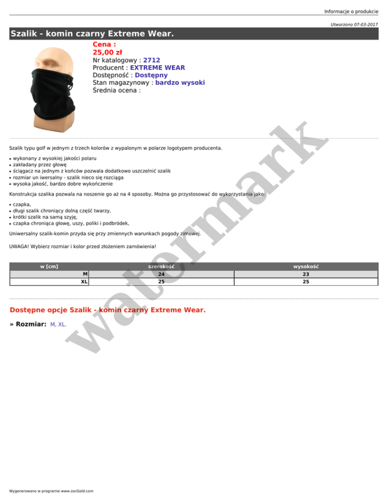 Informacje o produkcie Utworzono 07-03-2017 Szalik - komin czarny Extreme Wear. Cena : 25,00 zł er m ar k Nr katalogowy : 2712 Producent : EXTREME WEAR Dostępność : Dostępny Stan magazynowy : bardzo wysoki Średnia ocena : Szalik typu golf w jednym z trzech kolorów z wypalonym w polarze logotypem producenta. ● ● ● ● ● wykonany z wysokiej jakości polaru zakładany przez głowę ściągacz na jednym z końców pozwala dodatkowo uszczelnić szalik rozmiar un iwersalny - szalik nieco się rozciąga wysoka jakość, bardzo dobre wykończenie Konstrukcja szalika pozwala na noszenie go aż na 4 sposoby. Można go przystosować do wykorzystania jako: ● ● ● ● czapka, długi szalik chroniący dolną część twarzy, krótki szalik na samą szyję, czapka chroniąca głowę, uszy, poliki i podbródek, Uniwersalny szalik-komin przyda się przy zmiennych warunkach pogody zimowej. UWAGA! Wybierz rozmiar i kolor przed złożeniem zamówienia! w [cm] M wysokość 24 23 25 25 at XL szerokość Dostępne opcje Szalik - komin czarny Extreme Wear. w » Rozmiar: M, XL. Wygenerowano w programie www.oscGold.com