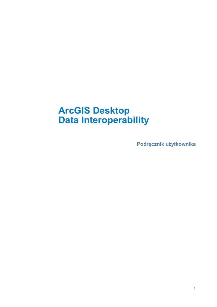 ArcGIS Desktop Data Interoperability Podręcznik użytkownika 1 Lekcja 1 Copyright © 2012 Esri, 2013 Esri Polska All rights reserved. Course version 1.1. Version release date June 2012. Wersja Polska: Esri Polska 27-09-2013 The information contained in this document is the exclusive property of Esri. This work is protected under United States copyright law and other international copyright treaties and conventions. No part of this work may be reproduced or transmitted in any form or by any means, electronic or mechanical, including photocopying and recording, or by any information storage or retrieval system, except as expressly permitted in writing by Esri. All requests should be sent to Attention: Contracts and Legal Services Manager, Esri, 380 New York Street, Redlands, CA 92373-8100 USA. EXPORT NOTICE: Use of these Materials is subject to U.S. export control laws and regulations including the U.S. Department of Commerce Export Administration Regulations (EAR). Diversion of these Materials contrary to U.S. law is prohibited. The information contained in this document is subject to change without notice. US Government Restricted/Limited Rights Any software, documentation, and/or data delivered hereunder is subject to the terms of the License Agreement. The commercial license rights in the License Agreement strictly govern Licensee’s use, reproduction, or disclosure of the software, data, and documentation. In no event shall the US Government acquire greater than RESTRICTED/ LIMITED RIGHTS. At a minimum, use, duplication, or disclosure by the US Government is subject to restrictions as set forth in FAR §52.227-14 Alternates I, II, and III (DEC 2007); FAR §52.227-19(b) (DEC 2007) and/or FAR §12.211/ 12.212 (Commercial Technical Data/Computer Software); and DFARS §252.227-7015 (DEC 2011) (Technical Data - Commercial Items) and/or DFARS §227.7202 (Commercial Computer Software and Commercial Computer Software Documentation), as applicable. Contractor/Manufacturer is Esri, 380 New York Street, Redlands, CA 92373-8100,USA. @esri.com, 3D Analyst, ACORN, Address Coder, ADF, AML, ArcAtlas, ArcCAD, ArcCatalog, ArcCOGO, ArcData, ArcDoc, ArcEdit, ArcEditor, ArcEurope, ArcExplorer, ArcExpress, ArcGIS, ArcGlobe, ArcGrid, ArcIMS, ARC/INFO, ArcInfo, ArcInfo Librarian, ArcLessons, ArcLocation, ArcLogistics, ArcMap, ArcNetwork, ArcNews, ArcObjects, ArcOpen, ArcPad, ArcPlot, ArcPress, ArcPy, ArcReader, ArcScan, ArcScene, ArcSchool, ArcScripts, ArcSDE, ArcSdl, ArcSketch, ArcStorm, ArcSurvey, ArcTIN, ArcToolbox, ArcTools, ArcUSA, ArcUser, ArcView, ArcVoyager, ArcWatch, ArcWeb, ArcWorld, ArcXML, Atlas GIS, AtlasWare, Avenue, BAO, Business Analyst, Business Analyst Online, BusinessMAP, CityEngine, CommunityInfo, Database Integrator, DBI Kit, EDN, Esri, Esri—Team GIS, Esri—The GIS Company, Esri—The GIS People, Esri—The GIS Software 2 Leader, FormEdit, GeoCollector, Geographic Design System, Geography Matters, Geography Network, GIS by Esri, GIS Day, GIS for Everyone, GISData Server, JTX, MapIt, Maplex, MapObjects, MapStudio, ModelBuilder, MOLE, MPS—Atlas, PLTS, Rent-a-Tech, SDE, SML, Sourcebook·America, SpatiaLABS, Spatial Database Engine, StreetMap, Tapestry, the ARC/INFO logo, the ArcGIS logo, the ArcGIS Explorer logo, the ArcPad logo, the Esri globe logo, the Esri Press logo, the GIS Day logo, the MapIt logo, The Geographic Advantage, The Geographic Approach, The World’s Leading Desktop GIS, Water Writes, www.arcgis.com, www.esri.com, www.geographynetwork.com, www.gis.com, www.gisday.com, and Your Personal Geographic Information System are trademarks, service marks, or registered marks in the United States, the European Community, or certain other jurisdictions. CityEngine is a registered trademark of Procedural AG and is distributed under license by Esri. Other companies and products or services mentioned herein may be trademarks, service marks or registered marks of their respective mark owners. 3 Lekcja 1 Spis treści Wprowadzenie ...............................................................................................................................................7 Cele kursu ......................................................................................................................................................................... 8 Dodatkowe źródła ............................................................................................................................................................ 8 Instalacja danych do kursu ............................................................................................................................................... 8 Oznaczenia używane w tym podręczniku ......................................................................................................................... 9 Podstawy pracy z ArcGIS Data Interoperability .......................................................................................... 11 Wprowadzenie ............................................................................................................................................................... 11 Czym jest ArcGIS Data Interoperability? ........................................................................................................................ 12 Możliwości ArcGIS Data Interoperability ........................................................................................................................ 13 Ćwiczenie 1a: Bezpośredni odczyt i tworzenie interoperacyjnych połączeń ................................................................. 15 Etap 1: Bezpośredni odczyt formatów danych ........................................................................................................... 16 Etap 2: Tworzenie interoperacyjnych połączeń .......................................................................................................... 17 Ćwiczenie 1b: Przekształcanie danych z u