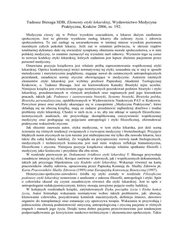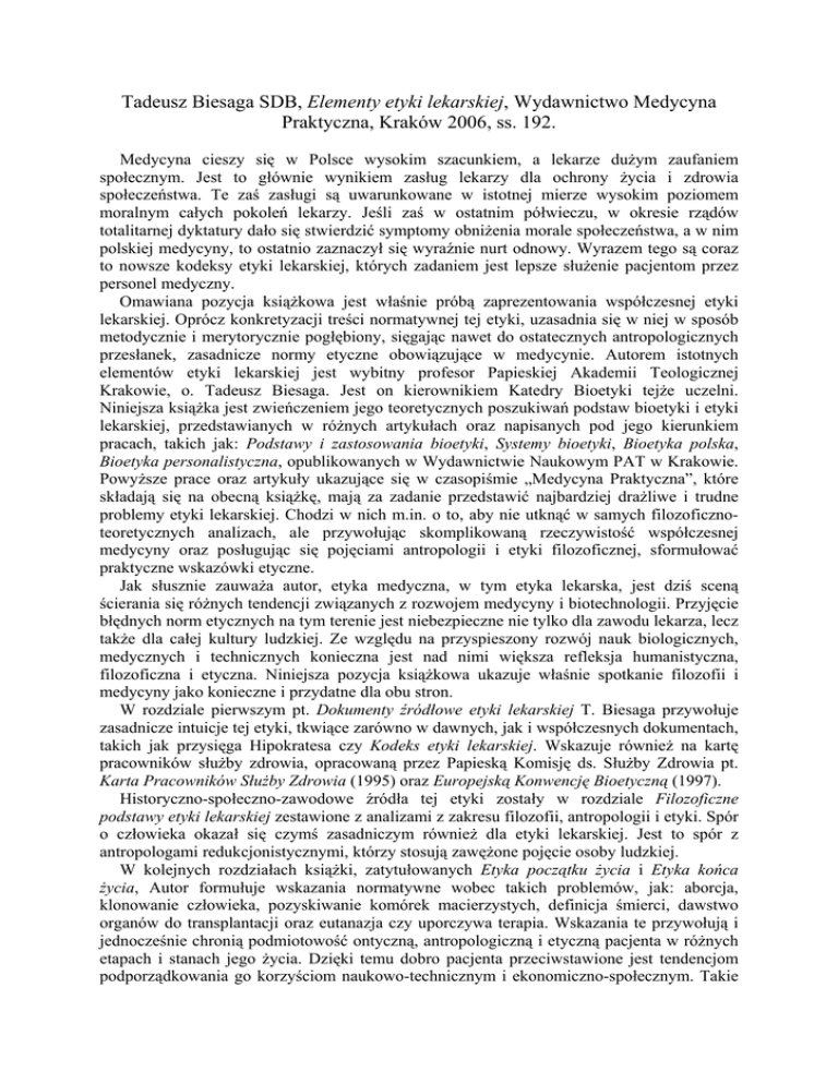 Tadeusz Biesaga SDB, Elementy etyki lekarskiej, Wydawnictwo Medycyna Praktyczna, Kraków 2006, ss. 192. Medycyna cieszy się w Polsce wysokim szacunkiem, a lekarze dużym zaufaniem społecznym. Jest to głównie wynikiem zasług lekarzy dla ochrony życia i zdrowia społeczeństwa. Te zaś zasługi są uwarunkowane w istotnej mierze wysokim poziomem moralnym całych pokoleń lekarzy. Jeśli zaś w ostatnim półwieczu, w okresie rządów totalitarnej dyktatury dało się stwierdzić symptomy obniżenia morale społeczeństwa, a w nim polskiej medycyny, to ostatnio zaznaczył się wyraźnie nurt odnowy. Wyrazem tego są coraz to nowsze kodeksy etyki lekarskiej, których zadaniem jest lepsze służenie pacjentom przez personel medyczny. Omawiana pozycja książkowa jest właśnie próbą zaprezentowania współczesnej etyki lekarskiej. Oprócz konkretyzacji treści normatywnej tej etyki, uzasadnia się w niej w sposób metodycznie i merytorycznie pogłębiony, sięgając nawet do ostatecznych antropologicznych przesłanek, zasadnicze normy etyczne obowiązujące w medycynie. Autorem istotnych elementów etyki lekarskiej jest wybitny profesor Papieskiej Akademii Teologicznej Krakowie, o. Tadeusz Biesaga. Jest on kierownikiem Katedry Bioetyki tejże uczelni. Niniejsza książka jest zwieńczeniem jego teoretycznych poszukiwań podstaw bioetyki i etyki lekarskiej, przedstawianych w różnych artykułach oraz napisanych pod jego kierunkiem pracach, takich jak: Podstawy i zastosowania bioetyki, Systemy bioetyki, Bioetyka polska, Bioetyka personalistyczna, opublikowanych w Wydawnictwie Naukowym PAT w Krakowie. Powyższe prace oraz artykuły ukazujące się w czasopiśmie „Medycyna Praktyczna”, które składają się na obecną książkę, mają za zadanie przedstawić najbardziej drażliwe i trudne problemy etyki lekarskiej. Chodzi w nich m.in. o to, aby nie utknąć w samych filozoficznoteoretycznych analizach, ale przywołując skomplikowaną rzeczywistość współczesnej medycyny oraz posługując się pojęciami antropologii i etyki filozoficznej, sformułować praktyczne wskazówki etyczne. Jak słusznie zauważa autor, etyka medyczna, w tym etyka lekarska, jest dziś sceną ścierania się różnych tendencji związanych z rozwojem medycyny i biotechnologii. Przyjęcie błędnych norm etycznych na tym terenie jest niebezpieczne nie tylko dla zawodu lekarza, lecz także dla całej kultury ludzkiej. Ze względu na przyspieszony rozwój nauk biologicznych, medycznych i technicznych konieczna jest nad nimi większa refleksja humanistyczna, filozoficzna i etyczna. Niniejsza pozycja książkowa ukazuje właśnie spotkanie filozofii i medycyny jako konieczne i przydatne dla obu stron. W rozdziale pierwszym pt. Dokumenty źródłowe etyki lekarskiej T. Biesaga przywołuje zasadnicze intuicje tej etyki, tkwiące zarówno w dawnych, jak i współczesnych dokumentach, takich jak przysięga Hipokratesa czy Kodeks etyki lekarskiej. Wskazuje również na kartę pracowników służby zdrowia, opracowaną przez Papieską Komisję ds. Służby Zdrowia pt. Karta Pracowników Służby Zdrowia (1995) oraz Europejską Konwencję Bioetyczną (1997). Historyczno-społeczno-zawodowe źródła tej etyki zostały w rozdziale Filozoficzne podstawy etyki lekarskiej zestawione z analizami z zakresu filozofii, antropologii i etyki. Spór o człowieka okazał się czymś zasadniczym również dla etyki lekarskiej. Jest to spór z antropologami redukcjonistycznymi, którzy stosują zawężone pojęcie osoby ludzkiej. W kolejnych rozdziałach książki, zatytułowanych Etyka początku życia i Etyka końca życia, Autor formułuje wskazania normatywne wobec takich problemów, jak: aborcja, klonowanie człowieka, pozyskiwanie komórek macierzystych, definicja śmierci, dawstwo organów do transplantacji oraz eutanazja czy uporczywa terapia. Wskazania te przywołują i jednocześnie chronią podmiotowość ontyczną, antropologiczną i etyczną pacjenta w różnych etapach i stanach jego życia. Dzięki temu dobro pacjenta przeciwstawione jest tendencjom podporządkowania go korzyściom naukowo-technicznym i ekonomiczno-społecznym. Takie podejście gwarantuje humanistyczny kierunek rozwoju współczesnej biotechnologii i medycyny. Pozwala uniknąć uprzedmiotowienia i dyskryminacji pewnych grup ludzi przez stosowanie nauki i techniki do realizacji ideologicznych celów narodu, klasy czy też globalnie pojętej ludzkości. Do kogo autor kieruje niniejszą pracę? Otóż jako syntetyczne opracowanie etyki lekarskiej, może stać się ona użyteczna zarówno dla studentów medycyny, jak i dla pracujących w swym zawodzie lekarzy. Przyczyniając się podniesienia świadomości etycznej i moralnego poziomu adeptów medycyny polskiej, podniesie też zaufanie w społeczeństwie do nich i do ich pracy. Ks. Tadeusz Reroń