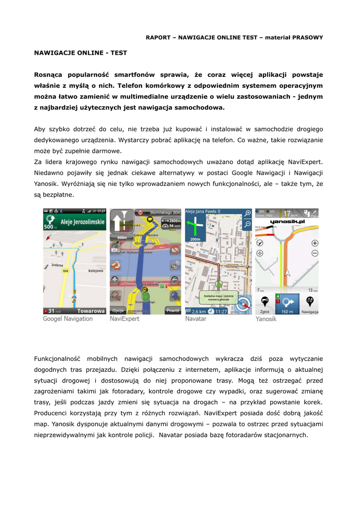 RAPORT – NAWIGACJE ONLINE TEST – materiał PRASOWY NAWIGACJE ONLINE - TEST Rosnąca popularność smartfonów sprawia, że coraz więcej aplikacji powstaje właśnie z myślą o nich. Telefon komórkowy z odpowiednim systemem operacyjnym można łatwo zamienić w multimedialne urządzenie o wielu zastosowaniach - jednym z najbardziej użytecznych jest nawigacja samochodowa. Aby szybko dotrzeć do celu, nie trzeba już kupować i instalować w samochodzie drogiego dedykowanego urządzenia. Wystarczy pobrać aplikację na telefon. Co ważne, takie rozwiązanie może być zupełnie darmowe. Za lidera krajowego rynku nawigacji samochodowych uważano dotąd aplikację NaviExpert. Niedawno pojawiły się jednak ciekawe alternatywy w postaci Google Nawigacji i Nawigacji Yanosik. Wyróżniają się nie tylko wprowadzaniem nowych funkcjonalności, ale – także tym, że są bezpłatne. Funkcjonalność mobilnych nawigacji samochodowych wykracza dziś poza wytyczanie dogodnych tras przejazdu. Dzięki połączeniu z internetem, aplikacje informują o aktualnej sytuacji drogowej i dostosowują do niej proponowane trasy. Mogą też ostrzegać przed zagrożeniami takimi jak fotoradary, kontrole drogowe czy wypadki, oraz sugerować zmianę trasy, jeśli podczas jazdy zmieni się sytuacja na drogach – na przykład powstanie korek. Producenci korzystają przy tym z różnych rozwiązań. NaviExpert posiada dość dobrą jakość map. Yanosik dysponuje aktualnymi danymi drogowymi – pozwala to ostrzec przed sytuacjami nieprzewidywalnymi jak kontrole policji. Navatar posiada bazę fotoradarów stacjonarnych. RAPORT – NAWIGACJE ONLINE TEST – materiał PRASOWY Jeśli tylko korzystamy z systemu operacyjnego w telefonie, warto przyjrzeć się bliżej mobilnym nawigacjom. Zwłaszcza, jeśli nie musimy za nie płacić. Już dziś są one wartościową alternatywą dla dedykowanych urządzeń – a wkrótce zostawią je daleko w tyle. Źródło: Creandi.pl ------------------------------Dystrybucja materiałów: Anna Ciesielska [email protected]