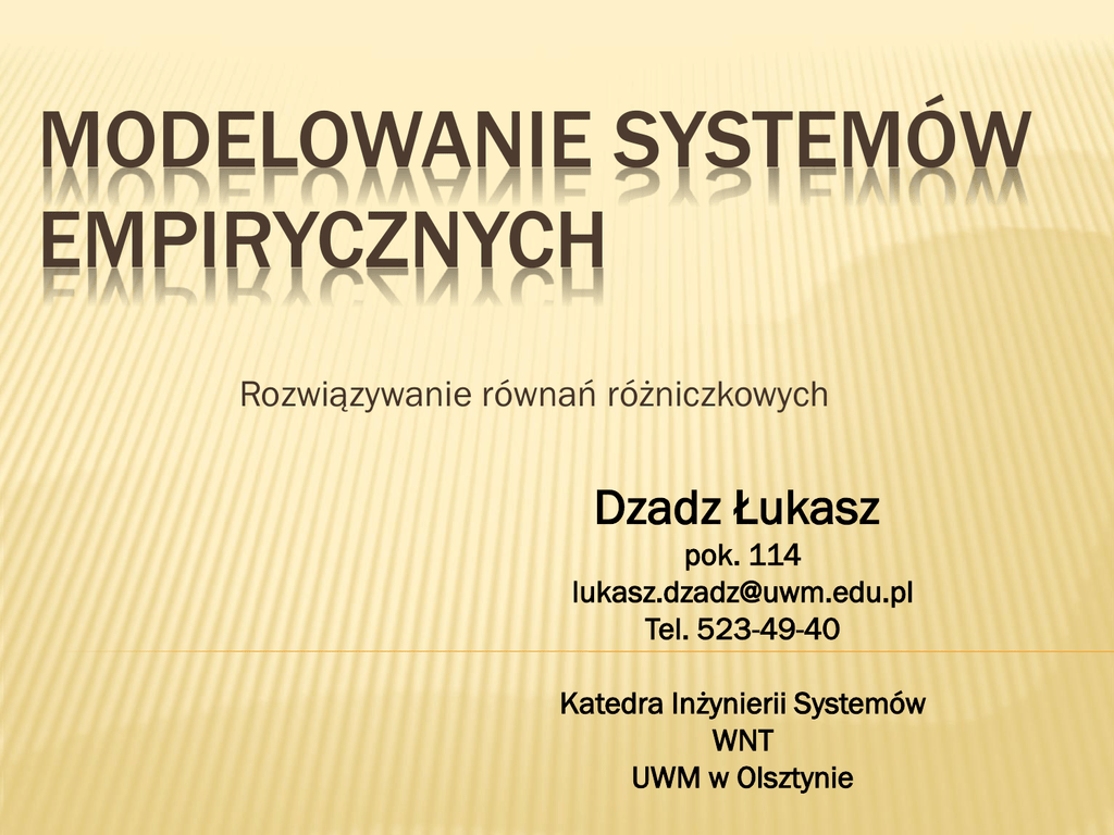 MODELOWANIE SYSTEMÓW EMPIRYCZNYCH Rozwiązywanie równań różniczkowych Dzadz Łukasz pok. 114 [email protected] Tel. 523-49-40 Katedra Inżynierii Systemów WNT UWM w Olsztynie CZYM JEST RÓWNANIE RÓŻNICZKOWE Równanie różniczkowe jest to równanie wyznaczające zależność między nieznaną funkcją a jej pochodnymi. Równanie różniczkowe zwyczajne to równanie, w którym występują stałe, funkcje niewiadome oraz pochodne funkcji niewiadomych. W równaniach różniczkowych zwyczajnych funkcje niewiadome zależą od jednej zmiennej niezależnej. RÓWNANIA RÓŻNICZKOWE Równanie różniczkowe zwyczajne ( ordinary differential equation) przyjmuje ogólną postać: dy dk y F (t , y, ,..., k ) 0 dt dt t – zmienna niezależna, y– nieznana funkcja dy dky ,..., k - pochodne nieznanej funkcji. dt dt Równanie tej postaci nazywamy równaniem różniczkowych k-tego rzędu RÓWNANIA RÓZNICZKOWE Po rozwikłaniu poprzedniego równania otrzymujemy: dky dy d k 1 y f (t , y, ,..., k 1 ) k dt dt dt ROZWIĄZYWANIE RÓWNAŃ RÓŻNICZKOWYCH Pakiet MATLAB zawiera wbudowane algorytmy które rozwiązują zagadnienia początkowe dla równań różniczkowych I rzędu. Algorytmy te oznacza się w skrócie jako odeXX . Są to między innymi: Ode23 – zmodyfikowana jednokrokowa metoda Rungego-Kutty, rzędu 2 i 3 Ode45 – jednokrokowa metoda Rungego-Kutty, rzędu 4 i 5 ROZWIĄZYWANIE RÓWNAŃ RÓŻNICZKOWYCH Składnia funkcji odeXX: [T, Y] = ode23 (‘odefun’, [t0 tk], y0, options) [T, Y] = ode45 (‘odefun’, [t0 tk], y0, options) [T, Y] – wektor czasu i wartości rozwiązań, odeXX – nazwa solvera, odefun – nazwa M-pliku funkcyjnego lub jego uchwyt (@ (T Y) odefun (argumenty wejściowe typu t,y,…) ), [t0 tk] – wektor w którym określa się początkową i końcowa wartość zmiennej niezależnej (zwykle czas), y0 – wektor wartości początkowych, options – struktura w której zapisane są parametry całkowania. Do zmiany tych parametrów służy funkcja odeset ROZWIĄZYWANIE RÓWNAŃ RÓŻNICZKOWYCH MATLAB pozwala również na rozwiązywanie równań różniczkowych wyższego rzędu niż I. W tym przypadku trzeba jednak zapisać równanie w postaci układu równań różniczkowego pierwszego rzędu. ROZWIĄZYWANIE RÓWNAŃ RÓŻNICZKOWYCH Mając równanie k-tego rzędu: dk y dy d 2 y d k 1 y f t , y, , 2 ,..., k 1 k dt dt dt dt Dokonujemy podstawień: y1 y dy dt .......... ...... y2 d k 1 y yk k 1 dt ROZWIĄZYWANIE RÓWNAŃ RÓŻNICZKOWYCH W wyniku dokonanych podstawień powstaje układ równań I rzędu: y1 y2 ' y 2 y3 ' . . . yk f (t , y1 , y2 ,..., yk ) ' ROZWIĄZYWANIE RÓWNAŃ RÓŻNICZKOWYCH Zapis równania Van der Pola (rr II rzędu) w postaci układu rr rzędu I. postać pierwotna y '' (1 y 2 ) y ' y dokonujemy podstawienia y1 y y2 y ' y3 y '' ROZWIĄZYWANIE RÓWNAŃ RÓŻNICZKOWYCH W wyniku podstawienia powstaje układ równań: y1' y2 ' y2 (1 y12 ) y2 y1 IMPLEMENTACJA DO PAKIETU MATLAB IMPLEMENTACJA DO PAKIETU MATLAB