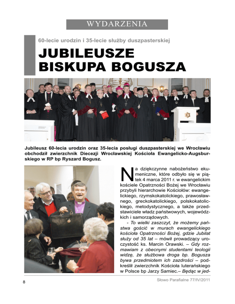 WYDARZENIA JUBILEUSZE BISKUPA BOGUSZA 60-lecie urodzin i 35-lecie służby duszpasterskiej Jubileusz 60-lecia urodzin oraz 35-lecia posługi duszpasterskiej we Wrocławiu obchodził zwierzchnik Diecezji Wrocławskiej Kościoła Ewangelicko-Augsburskiego w RP bp Ryszard Bogusz. N 8 a dziękczynne nabożeństwo ekumeniczne, które odbyło się w piątek 4 marca 2011 r. w ewangelickim kościele Opatrzności Bożej we Wrocławiu przybyli hierarchowie Kościołów: ewangelickiego, rzymskokatolickiego, prawosławnego, greckokatolickiego, polskokatolickiego, metodystycznego, a także przedstawiciele władz państwowych, wojewódzkich i samorządowych. - To wielki zaszczyt, że możemy państwa gościć w murach ewangelickiego kościoła Opatrzności Bożej, gdzie Jubilat służy od 35 lat – mówił prowadzący uroczystość ks. Marcin Orawski. – Gdy rozmawiam z obecnymi studentami teologii widzę, że służbowa droga bp. Bogusza bywa przedmiotem ich zazdrości – podkreślił zwierzchnik Kościoła luterańskiego w Polsce bp Jarzy Samiec.– Będąc w jedSłowo Parafialne 77/IV/2011 Wydarzenia nej parafii odbył praktykę, wikariat, został proboszczem, a następnie biskupem. Jubileuszowe kazanie wygłosił Prezes Synodu ks. Waldemar Pytel. - Jesteś ciepłym, ale stanowczym szefem, pełnym taktu i duszpasterskiej wrażliwości, wyczuwającym, kiedy napomnieć, a kiedy wesprzeć – powiedział. Wśród zaproszonych gości byli m.in. biskupi ewangeliccy – bp Jerzy Samiec, bp Jan Szarek, bp Paweł Anweiler, bp Tadeusz Szurman, bp Jan Cieślar, bp Marcin Hintz, bp Mirosław Wola, bp Hans Wilhelm Pietz; hierarchowie rzymskokatoliccy - kardynał Henryk Gulbinowicz, abp Marian Gołębiewski, bp Stefan Cichy, bp Ignacy Dec oraz reprezentujący koś- Kazanie wygłosił ks. Waldemar Pytel - prezes Synodu Kościoła Ewangelicko-Augsburskiego w RP Życzenia od abp. Mariana Gołębiewskego oraz abp. Jeremiasza ciół greckokatolicki bp Włodzimierz Juszczak. Kościoły zrzeszone w Polskiej Radzie Ekumenicznej reprezentował abp Jeremiasz z Kościoła prawosławnego. W imieniu władz wojewódzkich życzenia Jubilatowi złożył Wojewoda Dolnośląski Aleksander Skorupa, a w imieniu władz miejskich wiceprezydent Wrocławia Maciej Bluj. - Gdy człowiek ukończy 60 lat nie czuje już potrzeby udoskonalania świata, przySłowo Parafialne 77/IV/2011 znaje, że nie wszystko wie, nie wszystko rozumie i nie zna odpowiedzi na wiele pytań i= ze zdumieniem odkrywa, że mimo wszystko inni uważają go za mędrca. Zaczyna być szczęśliwy i tego szczęścia życzymy z głębi serc – podkreślił składając życzenia ks. Pytel. Tekst: mo, zdjęcia Krzysztof Bens więcej zdjęć na www.naszaparafia.pl 9 Wielkanoc 2011 Ksiądz Ryszard Bogusz, Biskup Diecezji Wrocławskiej Kościoła Ewangelicko-Augsburskiego w RP. Urodził się 2 marca 1951 r. w BielskuBiałej. Absolwent Chrześcijańskiej Akademii Teologicznej w Warszawie. 11 czerwca 1976 r. ordynowany na duchownego Kościoła Ewangelicko-Augsburskiego. Od początku związany z parafią ewangelicką we Wrocławiu: najpierw jako wikariusz, potem administrator, a od 1982 r. jako proboszcz. W czerwcu 1994 r. Synod Diecezjalny wybiera go na urząd Biskupa Diecezji Wrocławskiej, a 1 października ma miejsce uroczyste wprowadzenie w tę posługę. Biskup Bogusz jest przewodniczącym wrocławskiego Oddziału Polskiej Rady Ekumenicznej oraz członkiem Ekumenicznego Kuratorium Ewangelickiego Stowarzyszenia Europa–Centrum we Frankfurcie n/Odrą. Jest również Kuratorem Polskiej Sekcji Międzynarodowego Towarzystwa im. Dietricha Bonhoeffera oraz współtwórcą Dzielnicy Wzajemnego Szacunku we Wrocławiu. W roku 2005 Synod Kościoła wybrał Biskupa Bogusza na stanowisko Prezesa Diakonii Polskiej. 10 Błogosławieństwa udziela jubilatowi bp Jerzy Samiec W uznaniu jego społecznego zaangażowania został odznaczony przez władze miasta Wrocławia odznaką „Zasłużony dla miasta Wrocławia i województwa wrocławskiego”. Za działania na rzecz współpracy ekumenicznej otrzymał „Nagrodę Brata Alberta”, a w 1989 r. prestiżową nagrodę „Wielka Wrocławska”. W dowód uznania za działania na rzecz pojednania i zbliżenia pomiędzy Polską a Niemcami uhonorowany został w 2000 r. Krzyżem Zasługi I Klasy Republiki Federalnej Niemiec. W roku 2004 przyznano mu Medal Akademii Medycznej we Wrocławiu, a w 2010 r. został laureatem plebiscytu „Wrocław bez barier”. Ponadto został wyróżniony m.in.: odznaką Przyjaciela ZHP oraz odznaką Honorowego Przewodnika wrocławskiego oddziału PTTK. mo. Słowo Parafialne 77/IV/2011 Zmarł profesor Pellar Wydarzenia Odszedł wybitny pediatra, członek naszej parafii W poniedziałek 24 stycznia po długotrwałej chorobie został powołany do wieczności śp. prof. dr hab. Jan Pellar – wybitny pediatra, kardiolog, delegat na Synod Kościoła i Diecezji Wrocławskiej Kościoła EwangelickoAugsburskiego w RP, członek wrocławskiej parafii ewangelickiej. Pożegnanie zmarłego odbyło się w piątek 28 stycznia br. w ewangelickim kościele Opatrzności Bożej we Wrocławiu. Profesor spoczął na cmentarzu ewangelickim w Wiśle, w rodzimej ziemi Śląska Cieszyńskiego. Jan Pellar był autorem i współautorem dwustu publikacji naukowych z dziedziny pediatrii i kardiologii dziecięcej, laureatem trzech indywidualnych nagród ministerialnych za wybitne osiągnięcia w pracy naukowej, dydaktycznej i na rzecz ochrony zdrowia. Przewodniczył Oddziałowi Dolnośląskiemu Polskiego Towarzystwa Pediatrycznego Dolnośląskiego. Był członkiem towarzystw: kardiologicznego, hematologicznego, International PediaSłowo Parafialne 77/IV/2011 tric Assoccition, Deutsche Gesellschaft für Kinderzahnheilkunde. Organizowł m.in. przychodnię dziecięcą w Kudowie i kardiologiczną we Wrocławiu, Klinikę Kardiologiczną i wydział pielęgniarstwa w AM Wrocław. Był współzałożycielem Finland Alumni Association, Towarzystwa Nauk