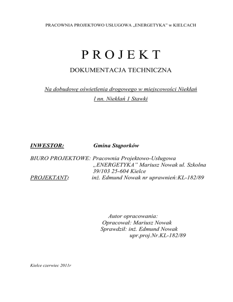 PRACOWNIA PROJEKTOWO USŁUGOWA „ENERGETYKA” w KIELCACH PROJEKT DOKUMENTACJA TECHNICZNA Na dobudowę oświetlenia drogowego w miejscowości Niekłań l nn. Niekłań 1 Stawki INWESTOR: Gmina Stąporków BIURO PROJEKTOWE: Pracownia Projektowo-Usługowa „ENERGETYKA” Mariusz Nowak ul. Szkolna 39/103 25-604 Kielce PROJEKTANT: inż. Edmund Nowak nr uprawnień:KL-182/89 Autor opracowania: Opracował: Mariusz Nowak Sprawdził: inż. Edmund Nowak upr.proj.Nr.KL-182/89 Kielce czerwiec 2011r 2.SPIS ZAWARTOŚCI 1. Strona tytułowa 2. Spis zawartości 3. Dane wyjściowe do projektowania 4. Oświadczenie projektanta 5. Zaświadczenie o przynależności do OIIB 6. Opis techniczny 7. Obliczenia techniczne 8. Zestawienia materiałów 9. Spis rysunków 10. Rysunki wg spisu 3. DANE WYJŚCIOWE DO PROJEKTOWANIA 3.1.Podstawa prawna Podstawę prawną niniejszego opracowania jest Umowa Urzędu Miejskiego w Stąporkowie na dobudowę oświetlenia drogowego w miejscowości Niekłań. Inwestorem dobudowy oświetlenia jest Gmina Stąporków. 3.2.Podstawa techniczna Podstawę techniczną opracowania stanowią: 3.2.1.Warunki techniczne zasilania wydane przez RZE Końskie znak: TU.WWP.LC/8/2011 z dnia 29.03.2011r.. 3.2.2. Zlecenie Miasta i Gminy Stąporków 3.2.3. Obowiązujące przepisy, normy i opracowania typowe. 3.3.Cel inwestycji Celem inwestycji jest dobudowa trzech opraw oświetlenia drogowego oraz podwieszenie przewodu oświetlenia drogowego typu AsXSn 2 x 25 mm² na terenie miejscowości Niekłań przy drodze gminnej. Projektowane oświetlenie stanowić będzie uzupełnienie istniejącego zmodernizowanego oświetlenia drogowego. 3.4. Zakres opracowania Zakres opracowania obejmuje: a) zabudowa trzech opraw oświetlenia drogowego na słupach nr 31, 33, 35 b) podwieszenie przewodu oświetlenia drogowego od słupa nr 16 do istniejącego słupa nr 35 6.OPIS TECHNICZNY 6.1.Stan istniejący Istniejąca linia niskiego napięcia Niekłań 1 Stawki to linia z przewodami gołymi typu Al 4 x 35 + 25 mm² oraz z przewodami typu Al 4 x 25+25 mm² wybudowana na słupach ŻN. Odległości miedzy przęsłami wynoszą średnio około 47 mb. Na linii tej zabudowane są oprawy sodowe firmy Thorn Lighting. 6.2. Linia niskiego napięcia Zgodnie z warunkami technicznymi wydanymi przez Rejonowy Zakład Energetyczny w Końskich oraz z ustaleniami zawartymi w Gminie Stąporków, w linii niskiego napięcia Niekłań 1 Stawki należy podwiesić przewód oświetlenia drogowego AsXSn 2 x 25 mm² od słupa nr 16 do słupa nr 35 o długości około 250 mb. (trasy). Przewód należy podwiesić pod istniejącymi przewodami sieci niskiego napięcia zgodnie z katalogiem linii niskiego napięcia – tom 1. 6.3 Oprawy i wysięgniki Zgodnie z wymogami normy „Oświetlenie dróg publicznych” i przeprowadzoną wizją w terenie oraz uwzględniając istniejące potrzeby oświetlenia drogowego projektuje się oprawę sodową o mocy 70 W. Proponuje się zabudowę opraw sodowych typu JET1 CLII/70W (firmy Thorn Lighting)z lampą wysokoprężną SHT – TS 70W. Projektowana oprawa spełnia wszelkie wymogi określone w normie PNEN 13201. Parametry techniczne projektowanej oprawy są zbliżone do parametrów technicznych określonych w specyfikacji istotnych warunków zamówienia. Nadmienia się również, że istniejące oprawy oświetlenia drogowego zabudowanej na tej sieci niskiego napięcia to oprawy sodowe firmy Thorn Lighting, a więc projektowane oprawy będą stanowić uzupełnienie stanu istniejącego, zarówno pod względem technicznym jak i estetycznym. Oprawę należy zabudować na słupach nr 31, 33, 35. Oprawy należy zamocować na wysięgniku stalowym ocynkowanym 1 x 1,5 m o kącie nachylenia α = 15° nad przewodami linii niskiego napięcia. Oprawy należy przyłączyć do sieci poprzez bezpiecznik SV 29.253 z wkładką topikową 6A, przewodem YLY 2 x 2,5 mm² -750V z listwą oprawy (przewód koloru czarnego lub brązowego), przewód zerowy koloru niebieskiego. 6.4. Ochrona przeciwporażeniowa Jako ochronę przeciwporażeniową dodatkową w sieci n.n. pozostawiono istniejący system: „SAMOCZYNNE WYŁĄCZENIE ZASILANIA” - układ sieci: TN-C Projektowane oprawy oraz osprzęt posiadają drugi stopień ochronności i nie wymagaj innej dodatkowej ochrony. Do zasilania oprawy należy użyć przewód YDY 2x2,5mm2 na napięcie 750Vktóry również spełnia wymogi drugiej klasy ochronności. W związku z tym dodatkową ochronę dla opraw i wysięgników stanowi zastosowanie urządzeń oraz elementów drugiej klasie ochronności. Ochronę dodatkową przed dotykiem pośrednim stanowi – samoczynne wyłączenie zasilania w czasie do 5 sek., co sprawdzono w części obliczeniowej. 6.5. Ochrona odgromowa Na słupie nr 35 należy zabudować ogranicznik przepięć typu BOPi 0,5/5 oraz wykonać uziemienie ponadto na słupach krańcowych linii nN oraz na stacji transformatorowej zabudowane są ograniczniki przepięć, które stanowią ochronę odgromową dla istniejących urządzeń oświetlenia drogowego. 6.6. Punkt sterowania i pomiaru energii Zgodnie z warunkami technicznymi zasilanie istniejących oraz projektowanych opraw oświetlenia drogowego będzie się odbywać z istniejącego punktu sterowania i pomiaru oświetlenia drogowego zabudowanego na stacji transformatorowej, Niekłań 1 Stawki ( szafa SO), który pozostaje bez zmian. Punkt ten wyposażony jest w zegar astronomiczny. Zabezpieczenia obwodów oświetlenia drogowego w punkcie sterowania i pomiaru oświetlenia drogowego powinny być zgodne z obliczeniami technicznymi. 6.6. Uwagi końcowe Roboty elektryczne wykonywać zgodnie z obowiązującymi przepisami i normami oraz „warunkami technicznymi wykonania i odbioru robót budowlano-montażowych – cz. V. Instalacje elektryczne” Po wykonaniu instalacji przeprowadzić wymagane przepisami badania i próby oraz zgłosić do odbioru końcowego w Rejonowym Zakładzie Energetycznym w Końskich. Prace wykonywać wyłącznie z materiał
