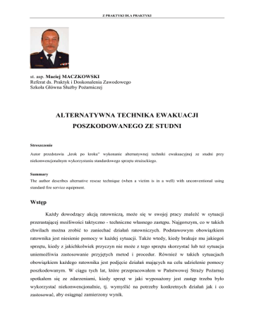 Z PRAKTYKI DLA PRAKTYKI st. asp. Maciej MACZKOWSKI Referat ds. Praktyk i Doskonalenia Zawodowego Szkoła Główna SłuŜby PoŜarniczej ALTERNATYWNA TECHNIKA EWAKUACJI POSZKODOWANEGO ZE STUDNI Streszczenie Autor przedstawia „krok po kroku” wykonanie alternatywnej techniki ewakuacyjnej ze studni przy niekonwencjonalnym wykorzystaniu standardowego sprzętu straŜackiego. Summary The author describes alternative rescue technique (when a victim is in a well) with unconventional using standard fire service equipment. Wstęp KaŜdy dowodzący akcją ratowniczą, moŜe się w swojej pracy znaleźć w sytuacji przerastającej moŜliwości taktyczno - techniczne własnego zastępu. Najgorszym, co w takich chwilach moŜna zrobić to zaniechać działań ratowniczych. Podstawowym obowiązkiem ratownika jest niesienie pomocy w kaŜdej sytuacji. TakŜe wtedy, kiedy brakuje mu jakiegoś sprzętu, kiedy z jakichkolwiek przyczyn nie moŜe z tego sprzętu skorzystać lub teŜ sytuacja uniemoŜliwia zastosowanie przyjętych metod i procedur. RównieŜ w takich sytuacjach obowiązkiem kaŜdego ratownika jest podjęcie działań mających na celu udzielenie pomocy poszkodowanym. W ciągu tych lat, które przepracowałem w Państwowej StraŜy PoŜarnej spotkałem się ze zdarzeniami, kiedy sprzęt w jaki wyposaŜony jest zastęp trzeba było wykorzystać niekonwencjonalnie, tj. wymyślić na potrzeby konkretnych działań jak i co zastosować, aby osiągnąć zamierzony wynik. Z PRAKTYKI DLA PRAKTYKI Mam pewne własne, skromne doświadczenie w ratownictwie w tym w ratownictwie wysokościowym, ale tak naprawdę wzorowałem się na pomysłach przedstawianych i proponowanych przez st. bryg. Mariana Sochackiego. To właśnie on był dla mnie inspiracją, dopingiem i z nim konsultowałem poszczególne etapy metody ewakuacyjnej, którą tu pragnę przedstawić. Dotyczy ona ewakuacji poszkodowanego, który wpadł do studni, studzienki kanalizacyjnej czy głębokiego wykopu. Metodę tą wymyśliłem dla potrzeb ćwiczenia ze studentami ale moŜna ją równieŜ stosować równieŜ w warunkach rzeczywistych. Wymagania sprzętowe Sprzęt niezbędny do prawidłowego wykonania ćwiczenia lub rzeczywistej akcji ratowniczej jest standardowo dostępny na kaŜdym wozie straŜackim tzw. pierwszego rzutu. Po dotarciu na miejsce zdarzenia przygotowujemy cały niezbędny sprzęt czyli : • Dwa przęsła drabiny nasadkowej. • Podpinkę linkową. • Linkę ratowniczą 20/30 m. • 2 pasy straŜackie z zatrzaśnikami. • 2 zatrzaśniki. • Torbę R-1 • Nosze Fot. 1. Sprzęt niezbędny do przeprowadzenia ewakuacji Z PRAKTYKI DLA PRAKTYKI Przebieg ćwiczenia Na potrzeby przećwiczenia tej techniki za studentami Szkoły Głównej SłuŜby PoŜarniczej w obiekcie naleŜącym do Szkoły wybudowana została studnia o głębokości 5 metrów i średnicy 1 metra. Do studni tej wrzucony został manekin o wadze 50 kg. Zadaniem zastępu było wydobycie manekina (osoby poszkodowanej) przy czym naleŜy zaznaczyć, iŜ w załoŜeniu do ćwiczenia „poszkodowany” miał złamania kończyn dolnych, ale posiadał funkcje Ŝyciowe i był przytomny. To ogromnie zmienia postać rzeczy i tym samym działań ratowniczych. ChociaŜ (ja nie chciałem nadmiernie utrudniać zadania), moŜna problemy mnoŜyć - poszkodowany ma uszkodzony kręgosłup, połamane nogi i jest nieprzytomny. Szczerze mówiąc gdybym trafił na podobną sytuację to chyba usiadł bym na cembrowinie i długo zastanowił bym się jak taką osobę wydostać. Wiem z doświadczenia Ŝe bywają sytuacje kiedy naleŜy przyjąć pewne priorytety i wówczas niestety nasze procedury ratownicze nie mają racji bytu. Po prostu nie da się wszystkiego przewidzieć. PoniewaŜ przybyły na miejsce zastęp nie posiada specjalistycznego sprzętu, z dwóch przęseł drabiny nasadkowej buduje coś, co zastępuje trójnóg, a na najbliŜszym stałym punkcie (pień drzewa, zderzak samochodu itp. czyli generalnie wszystko co moŜe spełnić taką rolę) buduje stały punkt asekuracji z pasa straŜackiego i zatrzaśnika (czasami zapominamy w ogóle Ŝe coś takiego jeszcze istnieje). Szczyty obu przęseł na górze związujemy, chociaŜby podpinką. Do górnych szczebli drabiny mocujemy dwa zatrzaśniki. KaŜdy na innym szczeblu. Do jednego z nich zaczepiamy kauszę linki ratowniczej, a dalej linkę przeplatamy przez drugi zatrzaśnik. W pętlę powstałą między nimi wpinamy zatrzaśnik z pasem, który załoŜy później jeden z ratowników. Pozostałą „wolną” cześć liny wiąŜemy na zatrzaśniku w stałym punkcie asekuracji węzłem „półwyblinka”. Taki układ pozwala w sposób kontrolowany opuścić ratownika na dno. MoŜe się on bezpiecznie ustawić względem osoby poszkodowanej, a mając wolne obie ręce ma moŜliwość zabrania dodatkowego sprzętu, który moŜe być niezbędny do udzielenia pomocy. Tak moŜna byłoby skrótowo „opisać” ćwiczenie, które przeprowadziłem ze studentami. Wydaje mi się jednak, Ŝe na potrzeby tego artykułu naleŜałoby opisać samą metodę „krok po kroku” tak, aby sposób wykonania ewakuacji był dokładny i nie pozostawiał najmniejszych niejasności jeśli chcielibyśmy ją przećwiczyć a potem ewentualnie stosować w rzeczywistości, gdyby sytuacja by tego wymagała. Kolejne czynności wyglądają następująco : Z PRAKTYKI DLA PRAKTYKI • Dwa przęsła drabiny nasadkowej przenieść na miejsce. • Wybrać miejsce stałego punktu asekuracyjnego i zapiać na nim pas z zatrzaśnikiem. • Ustawić „w piramidkę” nad otworem w taki sposób, aby przęsła były zwrócone w kierunku stanowiska asekuracyjnego. Kąt pomiędzy przęsłami około 45o. Fot. 2. Sposób ustawienia dwóch części drabiny nasadkowej nad otworem studni • NajwyŜsze szczeble przęseł drabiny związać podpinką linkową. • Do najwyŜszych szczebli przypiąć dwa zatrzaśniki. • Do jednego z zatrzaśników przypiąć kauszę linki ratowniczej