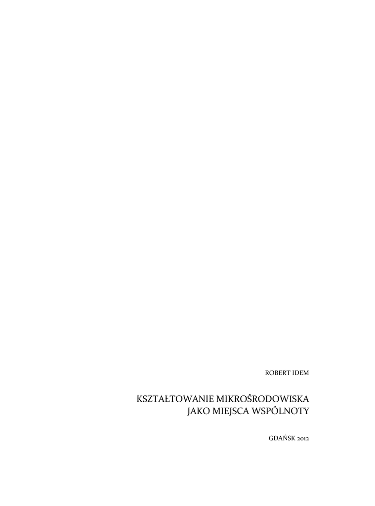 ROBERT IDEM KSZTAŁTOWANIE MIKROŚRODOWISKA JAKO MIEJSCA WSPÓLNOTY GDAŃSK 2012 Przewodniczący Komitetu Redakcyjnego Wydawnictwa Politechniki Gdańskiej Janusz T. Cieśliński Redaktor publikacji naukowych Michał Szydłowski Redaktor serii Maria J. Sołtysik Recenzenci Andrzej Baranowski Anna Palej Projekt okładki i składu Robert Idem Ilustracja na okładce Pieter Bruegel (Starszy), Żniwiarze, 1565 Metropolitan Museum of Art, New York Wydano za zgodą Rektora Politechniki Gdańskiej Oferta wydawnicza Politechniki Gdańskiej jest dostępna pod adresem http://www.pg.gda.pl/wydawnictwo/oferta © Copyright by Robert Idem, Gdańsk 2012 Utwór nie może być powielany i rozpowszechniany w jakiejkolwiek formie i w jakikolwiek sposób, bez pisemnej zgody wydawcy ISBN 978-83-7348-442-9 Spis treści 1. Wprowadzenie 1.1. Wstęp 1.2. Przedmiot i zakres pracy 1.3. Założenia i cele pracy 1.4. Metoda i konstrukcja pracy 1.5. Stan badań 7 7 8 9 10 11 2. Mikrośrodowisko jako miejsce wspólnoty 2.1. O wspólnocie 2.2. O miejscu 2.3. O środowisku lokalnym 2.4. Mikrośrodowisko jako miejsce wspólnoty mieszkańców 17 17 25 30 37 3. Koncepcje mikrośrodowiska i ich uwarunkowania historyczno-kulturowe 3.1. Od utopijnych do pragmatycznych koncepcji mikrośrodowiska 3.2. Współczesne formy kształtowania mikrośrodowiska 3.2.1. Kształtowanie przez projektowanie 3.2.2. Kształtowanie przez działanie 3.2.3. Kształtowanie zintegrowane. Cohousing 3.3. Kontekst polski: retrospekcje i perspektywy 3.4. Utopie i heterotopie 3.5. Podsumowanie i wnioski częściowe 43 43 54 55 63 74 90 105 111 4. Kształtowanie mikrośrodowiska: modus procedendi 4.1. Proces partycypacji w kształtowaniu mikrośrodowiska 4.1.1. O procesach i cechach charakterystycznych dla grupy społecznej 4.1.2. Konsensus jako sposób budowy trwałego porozumienia 4.1.3. Projektowanie uczestniczące 4.2. Przestrzeń mikrośrodowiska sposób kształtowania osiedla wspólnotowego 4.2.1. Elementy zbudowane 4.2.2. Elementy przyrodnicze 4.3. Podsumowanie 117 118 118 128 136 5. Przykłady realizacji 173 6. Konkluzje Literatura Źródła ilustracji Streszczenie w języku polskim Streszczenie w języku angielskim 211 217 239 240 241 145 145 167 171 | 3