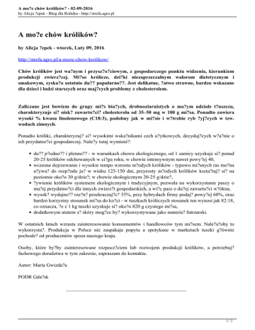 A mo?e chów królików? - 02-09-2016 by Alicja ?epek - Blog dla Rolnika - http://strefa.agro.pl A mo?e chów królików? by Alicja ?epek - wtorek, Luty 09, 2016 http://strefa.agro.pl/a-moze-chow-krolikow/ Chów królików jest wa?nym i przysz?o?ciowym, z gospodarczego punktu widzenia, kierunkiem produkcji zwierz?cej. Mi?so królicze, dzi?ki niezaprzeczalnym walorom dietetycznym i smakowym, zyska?o ostatnio du?? popularno??. Jest delikatne, ?atwo strawne, bardzo wskazane dla dzieci i ludzi starszych oraz maj?cych problemy z cholesterolem. Zaliczane jest bowiem do grupy mi?s bia?ych, drobnoziarnistych o ma?ym udziale t?uszczu, charakteryzuje si? nisk? zawarto?ci? cholesterolu od 35–50 mg w 100 g mi?sa. Ponadto zawiera wysoki % kwasu linolenowego (C18:3), podobny jak w mi?sie i w?trobie ryb ?yj?cych w tzw. wodach zimnych. Ponadto króliki, charakteryzuj? si? wysokimi wska?nikami cech u?ytkowych, decyduj?cych w?a?nie o ich przydatno?ci gospodarczej. Nale?y tutaj wymieni?: du?? p?odno?? i plenno?? - w warunkach chowu ekologicznego, od 1 samicy uzyskuje si? ponad 20-25 królików odchowanych w ci?gu roku, w chowie intensywnym nawet powy?ej 40, wczesne dojrzewanie i wysokie tempo wzrostu m?odych królików - typowo mi?snych ras mo?na u?ywa? do rozp?odu ju? w wieku 125-150 dni, przyrosty m?odych królików kszta?tuj? si? na poziomie oko?o 30 g/dzie?; w chowie ekologicznym 20-25 g/dzie?, ?ywienie królików systemem ekologicznym i tradycyjnym, pozwala na wykorzystanie paszy o ma?ej przydatno?ci dla innych zwierz?t gospodarskich, a wi?c pasz o du?ej zawarto?ci w?ókna, wysok? wydajno?? rze?n? przekraczaj?c? 55%, przy hybrydach firmy podaj? powy?ej 60%, oraz bardzo korzystny stosunek mi?sa do ko?ci - w tuszkach króliczych stosunek ten wynosi jak 82:18, co oznacza, ?e z 1 kg tuszki uzyskuje si? oko?o 820 g czystego mi?sa, dodatkowym atutem s? skóry mog?ce by? wykorzystywane jako materia? futrzarski. W ostatnich latach wzrasta zainteresowanie konsumentów i handlowców tym mi?sem. Nale?a?oby to wykorzysta?. Produkcja w Polsce nie zaspakaja popytu a spotykane w marketach tuszki g?ównie pochodz? od producentów spoza naszego kraju. Osoby, które by?by zainteresowane rozpocz?ciem lub rozwojem produkcji królików, a potrzebuj? fachowego doradztwa w tym zakresie, zapraszam do kontaktu. Autor: Maria Gwizda?a PODR Gda?sk _______________________________________________ 1/2 A mo?e chów królików? - 02-09-2016 by Alicja ?epek - Blog dla Rolnika - http://strefa.agro.pl PDF generated by Kalin's PDF Creation Station 2/2 Powered by TCPDF (www.tcpdf.org)