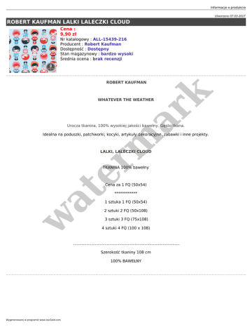 Informacje o produkcie Utworzono 07-03-2017 ROBERT KAUFMAN LALKI LALECZKI CLOUD Cena : 9,90 zł Nr katalogowy : ALL-15439-216 Producent : Robert Kaufman Dostępność : Dostępny Stan magazynowy : bardzo wysoki Średnia ocena : brak recenzji er m ar k ROBERT KAUFMAN WHATEVER THE WEATHER Urocza tkanina, 100% wysokiej jakości bawełny. Gęsto tkana. Idealna na poduszki, patchworki, kocyki, artykuły dekoracyjne, zabawki i inne projekty. LALKI, LALECZKI CLOUD TKANINA 100% bawełny at Cena za 1 FQ (50x54) ************ 1 sztuka 1 FQ (50x54) w 2 sztuki 2 FQ (50x108) 3 sztuki 3 FQ (75x108) 4 sztuki 4 FQ (100 x 108) ........................................................................................ Szerokość tkaniny 108 cm 100% BAWEŁNY Wygenerowano w programie www.oscGold.com