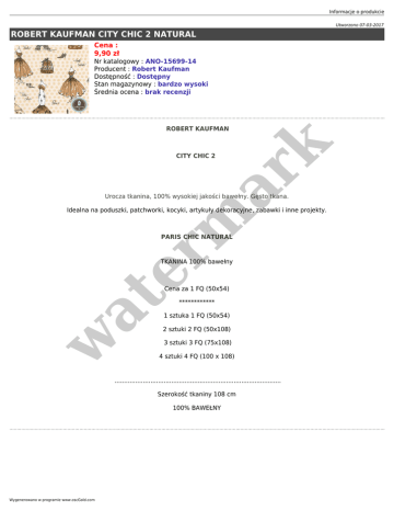 Informacje o produkcie Utworzono 07-03-2017 ROBERT KAUFMAN CITY CHIC 2 NATURAL Cena : 9,90 zł Nr katalogowy : ANO-15699-14 Producent : Robert Kaufman Dostępność : Dostępny Stan magazynowy : bardzo wysoki Średnia ocena : brak recenzji er m ar k ROBERT KAUFMAN CITY CHIC 2 Urocza tkanina, 100% wysokiej jakości bawełny. Gęsto tkana. Idealna na poduszki, patchworki, kocyki, artykuły dekoracyjne, zabawki i inne projekty. PARIS CHIC NATURAL TKANINA 100% bawełny at Cena za 1 FQ (50x54) ************ 1 sztuka 1 FQ (50x54) w 2 sztuki 2 FQ (50x108) 3 sztuki 3 FQ (75x108) 4 sztuki 4 FQ (100 x 108) ........................................................................................ Szerokość tkaniny 108 cm 100% BAWEŁNY Wygenerowano w programie www.oscGold.com