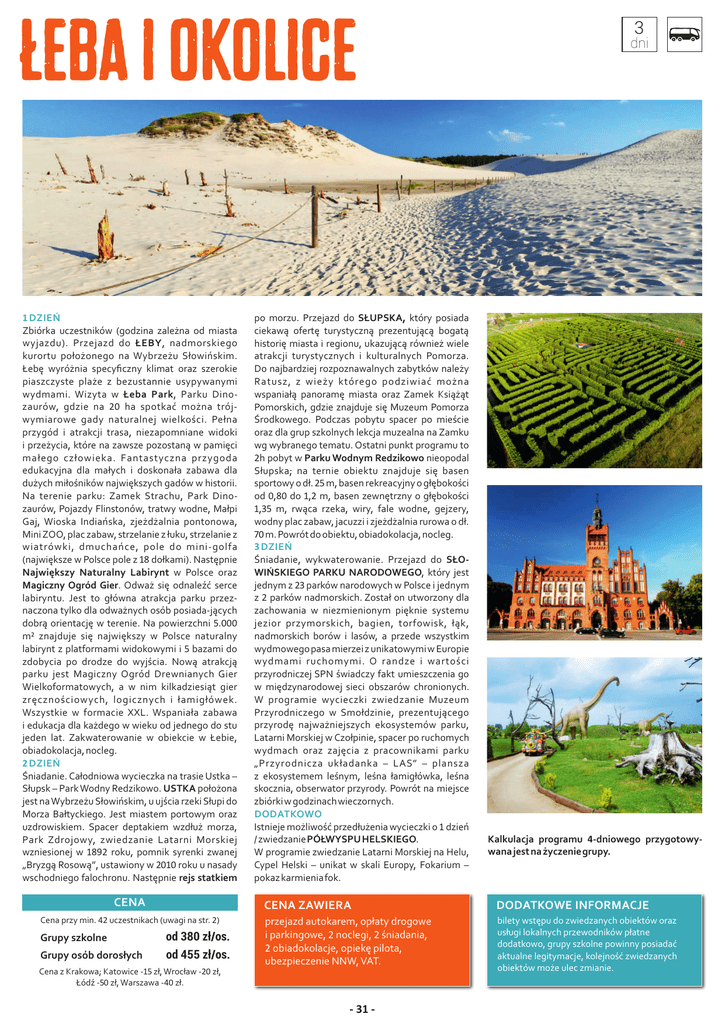 ŁEBA I OKOLICE 1 DZIEŃ Zbiórka uczestników (godzina zależna od miasta wyjazdu). Przejazd do ŁEBY, nadmorskiego kurortu położonego na Wybrzeżu Słowińskim. Łebę wyróżnia specyficzny klimat oraz szerokie piaszczyste plaże z bezustannie usypywanymi wydmami. Wizyta w Łeba Park, Parku Dinozaurów, gdzie na 20 ha spotkać można trójwymiarowe gady naturalnej wielkości. Pełna przygód i atrakcji trasa, niezapomniane widoki i przeżycia, które na zawsze pozostaną w pamięci małego człowieka. Fantastyczna przygoda edukacyjna dla małych i doskonała zabawa dla dużych miłośników największych gadów w historii. Na terenie parku: Zamek Strachu, Park Dinozaurów, Pojazdy Flinstonów, tratwy wodne, Małpi Gaj, Wioska Indiańska, zjeżdżalnia pontonowa, Mini ZOO, plac zabaw, strzelanie z łuku, strzelanie z wiatrówki, dmuchańce, pole do mini-golfa (największe w Polsce pole z 18 dołkami). Następnie Największy Naturalny Labirynt w Polsce oraz Magiczny Ogród Gier. Odważ się odnaleźć serce labiryntu. Jest to główna atrakcja parku przeznaczona tylko dla odważnych osób posiada-jących dobrą orientację w terenie. Na powierzchni 5.000 m² znajduje się największy w Polsce naturalny labirynt z platformami widokowymi i 5 bazami do zdobycia po drodze do wyjścia. Nową atrakcją parku jest Magiczny Ogród Drewnianych Gier Wielkoformatowych, a w nim kilkadziesiąt gier zręcznościowych, logicznych i łamigłówek. Wszystkie w formacie XXL. Wspaniała zabawa i edukacja dla każdego w wieku od jednego do stu jeden lat. Zakwaterowanie w obiekcie w Łebie, obiadokolacja, nocleg. 2 DZIEŃ Śniadanie. Całodniowa wycieczka na trasie Ustka – Słupsk – Park Wodny Redzikowo. USTKA położona jest na Wybrzeżu Słowińskim, u ujścia rzeki Słupi do Morza Bałtyckiego. Jest miastem portowym oraz uzdrowiskiem. Spacer deptakiem wzdłuż morza, Park Zdrojowy, zwiedzanie Latarni Morskiej wzniesionej w 1892 roku, pomnik syrenki zwanej „Bryzgą Rosową”, ustawiony w 2010 roku u nasady wschodniego falochronu. Następnie rejs statkiem CENA Cena przy min. 42 uczestnikach (uwagi na str. 2) Grupy szkolne Grupy osób dorosłych od 380 zł/os. od 455 zł/os. Cena z Krakowa; Katowice -15 zł, Wrocław -20 zł, Łódź -50 zł, Warszawa -40 zł. po morzu. Przejazd do SŁUPSKA, który posiada ciekawą ofertę turystyczną prezentującą bogatą historię miasta i regionu, ukazującą również wiele atrakcji turystycznych i kulturalnych Pomorza. Do najbardziej rozpoznawalnych zabytków należy Ratusz, z wieży którego podziwiać można wspaniałą panoramę miasta oraz Zamek Książąt Pomorskich, gdzie znajduje się Muzeum Pomorza Środkowego. Podczas pobytu spacer po mieście oraz dla grup szkolnych lekcja muzealna na Zamku wg wybranego tematu. Ostatni punkt programu to 2h pobyt w Parku Wodnym Redzikowo nieopodal Słupska; na ternie obiektu znajduje się basen sportowy o dł. 25 m, basen rekreacyjny o głębokości od 0,80 do 1,2 m, basen zewnętrzny o głębokości 1,35 m, rwąca rzeka, wiry, fale wodne, gejzery, wodny plac zabaw, jacuzzi i zjeżdżalnia rurowa o dł. 70 m. Powrót do obiektu, obiadokolacja, nocleg. 3 DZIEŃ Śniadanie, wykwaterowanie. Przejazd do SŁOWIŃSKIEGO PARKU NARODOWEGO, który jest jednym z 23 parków narodowych w Polsce i jednym z 2 parków nadmorskich. Został on utworzony dla zachowania w niezmienionym pięknie systemu jezior przymorskich, bagien, torfowisk, łąk, nadmorskich borów i lasów, a przede wszystkim wydmowego pasa mierzei z unikatowymi w Europie wydmami ruchomymi. O randze i wartości przyrodniczej SPN świadczy fakt umieszczenia go w międzynarodowej sieci obszarów chronionych. W programie wycieczki zwiedzanie Muzeum Przyrodniczego w Smołdzinie, prezentującego przyrodę najważniejszych ekosystemów parku, Latarni Morskiej w Czołpinie, spacer po ruchomych wydmach oraz zajęcia z pracownikami parku „Przyrodnicza układanka – LAS” – plansza z ekosystemem leśnym, leśna łamigłówka, leśna skocznia, obserwator przyrody. Powrót na miejsce zbiórki w godzinach wieczornych. DODATKOWO Istnieje możliwość przedłużenia wycieczki o 1 dzień / zwiedzanie PÓŁWYSPU HELSKIEGO. W programie zwiedzanie Latarni Morskiej na Helu, Cypel Helski – unikat w skali Europy, Fokarium – pokaz karmienia fok. 3 dni Kalkulacja programu 4-dniowego przygotowywana jest na życzenie grupy. DODATKOWE CENA ZAWIERA INFORMACJE DODATKOWE INFORMACJE bilety wstępu do zwiedzanych oraz przejazd autokarem, opłatyobiektów drogowe usługi lokalnych 2przewodników płatne i parkingowe, noclegi, 2 śniadania, dodatkowo, należy opiekę posiadaćpilota, ważny paszport 2 obiadokolacje, lub dowód osobisty, kolejność zwiedzanych ubezpieczenie NNW, VAT. obiektów może ulec zmianie. bilety wstępu do zwiedzanych obiektów oraz usługi lokalnych przewodników płatne dodatkowo, grupy szkolne powinny posiadać aktualne legitymacje, kolejność zwiedzanych obiektów może ulec zmianie. - 31 -