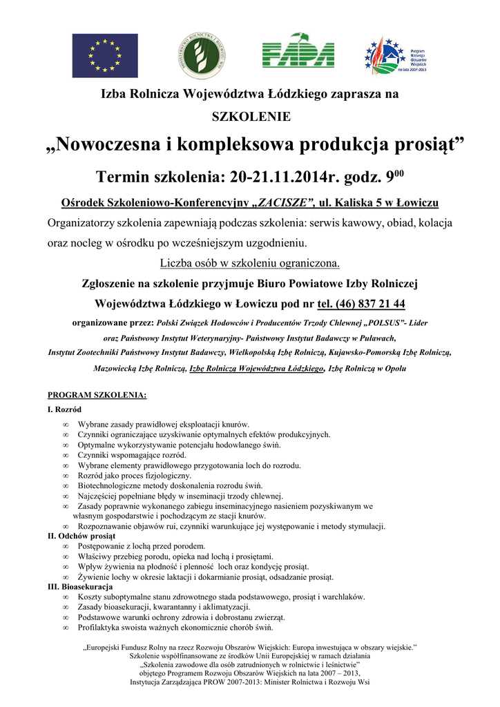 Izba Rolnicza Województwa Łódzkiego zaprasza na SZKOLENIE „Nowoczesna i kompleksowa produkcja prosiąt” Termin szkolenia: 20-21.11.2014r. godz. 900 Ośrodek Szkoleniowo-Konferencyjny „ZACISZE”, ul. Kaliska 5 w Łowiczu Organizatorzy szkolenia zapewniają podczas szkolenia: serwis kawowy, obiad, kolacja oraz nocleg w ośrodku po wcześniejszym uzgodnieniu. Liczba osób w szkoleniu ograniczona. Zgłoszenie na szkolenie przyjmuje Biuro Powiatowe Izby Rolniczej Województwa Łódzkiego w Łowiczu pod nr tel. (46) 837 21 44 organizowane przez: Polski Związek Hodowców i Producentów Trzody Chlewnej „POLSUS”- Lider oraz Państwowy Instytut Weterynaryjny- Państwowy Instytut Badawczy w Puławach, Instytut Zootechniki Państwowy Instytut Badawczy, Wielkopolską Izbę Rolniczą, Kujawsko-Pomorską Izbę Rolniczą, Mazowiecką Izbę Rolniczą, Izbę Rolniczą Województwa Łódzkiego, Izbę Rolniczą w Opolu PROGRAM SZKOLENIA: I. Rozród • • • • • • • • • Wybrane zasady prawidłowej eksploatacji knurów. Czynniki ograniczające uzyskiwanie optymalnych efektów produkcyjnych. Optymalne wykorzystywanie potencjału hodowlanego świń. Czynniki wspomagające rozród. Wybrane elementy prawidłowego przygotowania loch do rozrodu. Rozród jako proces fizjologiczny. Biotechnologiczne metody doskonalenia rozrodu świń. Najczęściej popełniane błędy w inseminacji trzody chlewnej. Zasady poprawnie wykonanego zabiegu inseminacyjnego nasieniem pozyskiwanym we własnym gospodarstwie i pochodzącym ze stacji knurów. • Rozpoznawanie objawów rui, czynniki warunkujące jej występowanie i metody stymulacji. II. Odchów prosiąt • Postępowanie z lochą przed porodem. • Właściwy przebieg porodu, opieka nad lochą i prosiętami. • Wpływ żywienia na płodność i plenność loch oraz kondycję prosiąt. • Żywienie lochy w okresie laktacji i dokarmianie prosiąt, odsadzanie prosiąt. III. Bioasekuracja • Koszty suboptymalne stanu zdrowotnego stada podstawowego, prosiąt i warchlaków. • Zasady bioasekuracji, kwarantanny i aklimatyzacji. • Podstawowe warunki ochrony zdrowia i dobrostanu zwierząt. • Profilaktyka swoista ważnych ekonomicznie chorób świń. „Europejski Fundusz Rolny na rzecz Rozwoju Obszarów Wiejskich: Europa inwestująca w obszary wiejskie.” Szkolenie współfinansowane ze środków Unii Europejskiej w ramach działania „Szkolenia zawodowe dla osób zatrudnionych w rolnictwie i leśnictwie” objętego Programem Rozwoju Obszarów Wiejskich na lata 2007 – 2013, Instytucja Zarządzająca PROW 2007-2013: Minister Rolnictwa i Rozwoju Wsi