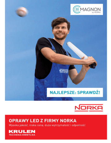 NAJLEPSZE: SPRAWDŹ! OPRAWY LED Z FIRMY NORKA Wysoka jakość, niska cena, duża wytrzymałość i odporność www.magnon.pl 1 SPIS TREŚCI WSTĘP SPIS TREŚCI 2 SERIA OPRAW MAGNON® 6 OBSZARY ZASTOSOWANIA 3 ZASADA KRÓTKICH USZCZELEK 7 OPRAWY NASTROPOWE PL-1000-01 14 PL-2000-01 PROJEKTORY SL-1000-01 2 8 NORKA - DOBRA INWESTYCJA 9 10 16 PL-3000-01 18 20 24 OPRAWY TUBULARNE RL-1000-01 JAKOŚĆ NORKA - WYPRODUKOWANE W NIEMCZECH 26 30 Oprawy przemysłowe LED MAGNON® - Program 2016 OBSZARY ZASTOSOWANIA PL-1000-01 PL-2000-01 PL-3000-01 SL-1000-01 RL-1000-01 Zastosowanie Oświetlenie architektoniczne Transport publiczny Iluminacja fasad budynków Magazyny / piwnice / pomieszczenia techniczne Hodowla zwierząt / rolnictwo Parkingi / garaże podziemne Zakłady produkcyjne Przejścia podziemne / pasaże Myjnie samochodowe Cechy szczególne IP 65 IP 69K Regulacja klosza 90° Regulacja klosza 120° Odporność na amoniak Regulacja wartości strumienia świetlnego Możliwość intensywnego czyszczenia myjkami wysokociśnieniowymi NAJLEPSZE: SPRAWDŹ! www.magnon.pl 3 WYJĄTKOWO WYTRZYMAŁE I ODPORNE NA KAŻDĄ POGODĘ 4 Oprawy przemysłowe LED MAGNON® - Program 2016 www.magnon.pl 5 SERIA OPRAW OŚWIETLENIOWYCH MAGNON® WYBÓR JAKOŚCI W KONKURENCYJNEJ CENIE Seria opraw oświetleniowych MAGNON® to przejrzysty asortyment produktów w wysokiej jakości firmy NORKA. Gama produktów w tym programie została zoptymalizowana tak, aby uprościć wybór opraw i planowanie oświetlenia. Wszystkie oprawy z serii MAGNON® są tak samo konstruowane, produkowane i testowane, jak wszystkie pozostałe oprawy NORKA, i są produkowane z tych samych, wysokiej jakości, komponentów. 6 5 lat Oprawy MAGNON® charakteryzują się gwaran cji! wyjątkową trwałością i wysoką jakością w stosunku do konkurencji. Dzięki ujednoliconym standardom i bez opcji specjalnych, możliwy jest krótki termin dostawy. Rezultat: zoptymalizowana gama wysokiej jakości produktów w konkurencyjnej cenie. Oprawy przemysłowe LED MAGNON® - Program 2016 ZASADA KRÓTKICH USZCZELEK CAŁKOWITA ODPORNOŚĆ NA WARUNKI ATMOSFERYCZNE Typowa NORKA — tak można opisać tę dobrze przemyślaną konstrukcję oprawy oświetleniowej. Od ponad 65 lat oprawy NORKA charakteryzują się maksymalną ochroną przed wilgocią, pyłem i owadami. Jest to realizowane poprzez specjalną, zwartą konstrukcję oprawy i zredukowaną do minium długością uszczelek. Im dłuższa uszczelka, tym większe prawdopodobieństwo rozszczelnienia oprawy lub jej mechanicznego uszkodzenia. Standardowe oprawy hermetyczne utrzymują szczelność dzięki dopasowującemu się materiałowi uszczelniającemu i równomiernemu naciskowi pomiędzy korpusem oprawy a kloszem. Ten nacisk jest zwykle tworzony przez całą długość oprawy poprzez użycie zatrzasków, które nie wymagają narzędzi do ich otwarcia. Ekstremalne warunki, w których pracuje oprawa, takie jak: czyszczenie środkami chemicznymi lub środowisko z oparami kwasów lub zasad, powodują szybką korozję tych zatrzasków. Firma NORKA stosuje w swoich oprawach wysokiej jakości uszczelki, które są odporne na starzenie i deformacje; wykonane z silikonu / syntetycznej gumy. Korpus oprawy oraz lokalizacja uszczelnienia są perfekcyjnie dopasowane, zarówno do odpowiedniej uszczelki, jak i miejsca zastosowania oprawy. System krótkich uszczelek zapewnia wyższy nacisk uszczelniający, aby uzyskać bezpieczniejszą, trwalszą i całkowicie odporną na warunki atmosferyczne ochronę. OPRAWA NORKA, DŁUGOŚĆ 1,2 M Z SYSTEMEM KRÓTKICH USZCZELEK DŁUGOŚĆ USZCZELKI OK. 0,4 M ZALETY KRÓTKICH USZCZELEK NORKA: > silniejszy nacisk uszczelnienia dzięki mechanicznie skręcanym pierścieniom > materiał uszczelki dopasowany do zastosowania > długotrwała, permanentna ochrona przed wilgocią, pyłem i owadami > permanentna ochrona wewnętrznych komponentów STANDARDOWA OPRAWA HERMETYCZNA, DŁUGOŚĆ 1,2 M DŁUGOŚĆ USZCZELKI OK. 2,6 M WADY STANDARDOWEJ OPRAWY HERMETYCZNEJ Z DŁUGĄ USZCZELKĄ: > uszczelka zmienia położenie po otwarciu klosza > cienkie ścianki > podatne na uszkodzenia zatrzaski zamykające klosz > niestabilny korpus oprawy www.magnon.pl 7 JAKOŚĆ NORKA - WYPRODUKOWANE W NIEMCZECH OPRAWY Z WYSOKIM STOPNIEM OCHRONY IP I KLASĄ OCHRONY IK TO STANDARD FIRMY NORKA NORKA – dostawca rozwiązań. Od ponad 65 lat firma NORKA konstruuje i produkuje trwałe i efektywne rozwiązania oświetleniowe. Produkuje oprawy oświetleniowe z wysokim stopniem ochrony, które pracują bezawaryjnie i stale wytrzymują trudne warunki środowiskowe, takie jak: wysoka i niska temperatura otoczenia, strugi wody, agresywne pyły, ciecze powodujące korozję, niebezpieczne opary i silne wibracje. „Wyprodukowane w Niemczech“ to dla firmy NORKA codzienna motywacja, oznaka najwyższej jakości. Firma łączy ogromne doświadczenie z ciągłym udoskonalaniem swoich produktów, stale rozwijając szeroki asortyment opraw do specjalnych zastosowań. > Badanie na odporność przed strugami wody w laboratorium NORKA 8 Stosując najnowocześniejsze metody produkcji oraz posiadając własne laboratorium, wyposażone zgodnie ze standardami VDE, firma gwarantuje najwyższą jakość opraw. Badane zgodnie z Tworząc oprawy oświetleniowe, NORKA koncentruje się zarówno na kosztach inwestycji, jak i na kosztach operacyjnych przez cały cykl życia produktu (TCO), takich jak: koszty montażu, eksploatacji i konserwacji. Dzięki swojej trwałości i wysokiej efektywności energetycznej oprawy LED NORKA to najlepsza i bezpieczna inwestycja. > Badanie na odporność mechaniczną w laboratorium NORKA Oprawy przemysłowe LED MAGNON® - Program 2016 OPRAWY NORKA TO DOBRA INWESTYCJA 57% OSZCZĘDNOŚCI ENERGII Z OPRAWAMI LED W PORÓWNANIU DO STANDARDOWYCH OPRAW T8 PRZYKŁADOWE OBLICZENIA: Wymiary pomieszczenia L x B: 5 x 10 m, wysokość montażu opraw: 2,7 m, nominalny poziom natężenia oświetlenia: 300 lx STANDARDOWA OPRAWA HERMETYCZNA T8 PL-