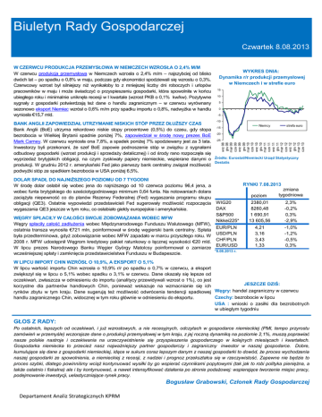 Biuletyn Rady Gospodarczej Czwartek 8.08.2013 BANK ANGLII ZAPOWIEDZIAŁ UTRZYMANIE NISKICH STÓP PRZEZ DŁUŻSZY CZAS Bank Anglii (BoE) utrzyma rekordowo niskie stopy procentowe (0,5%) do czasu, gdy stopa bezrobocia w Wielkiej Brytanii spadnie poniżej 7%, zapowiedział w środę nowy prezes BoE Mark Carney. W czerwcu wyniosła ona 7,8%, a spadek poniżej 7% spodziewany jest za 3 lata. Inwestorzy byli przekonani, że szef BoE zapowie podnoszenie stóp w związku z sygnałami odbudowy gospodarki (wzrost produkcji i sprzedaży detalicznej) i od środy rano rozpoczęła się wyprzedaż brytyjskich obligacji, na czym zyskiwały papiery niemieckie, wspierane danymi o produkcji. W grudniu 2012 r. amerykański Fed jako pierwszy bank centralny związał możliwość podwyżki stóp ze spadkiem bezrobocia w USA poniżej 6,5%. WYKRES DNIA: Dynamika r/r produkcji przemysłowej w Niemczech i w strefie euro 15 10 5 0 -5 -10 -15 Niemcy strefa euro -20 -25 wrz 08 gru 08 mar 09 cze 09 wrz 09 gru 09 mar 10 cze 10 wrz 10 gru 10 mar 11 cze 11 wrz 11 gru 11 mar 12 cze 12 wrz 12 gru 12 mar 13 cze 13 W CZERWCU PRODUKCJA PRZEMYSŁOWA W NIEMCZECH WZROSŁA O 2,4% M/M W czerwcu produkcja przemysłowa w Niemczech wzrosła o 2,4% m/m – najszybciej od blisko dwóch lat – po spadku o 0,8% w maju, podczas gdy ekonomiści spodziewali się wzrostu o 0,3%. Czerwcowy wzrost był silniejszy niż wynikałoby to z mniejszej liczby dni roboczych i urlopów pracowników w maju i może świadczyć o przyspieszeniu gospodarki, która spowolniła w końcu ubiegłego roku i minimalnie uniknęła recesji w I kwartale (wzrost PKB o 0,1% kw/kw). Pozytywne sygnały z gospodarki potwierdzają też dane o handlu zagranicznym – w czerwcu wyrównany sezonowo eksport Niemiec wzrósł o 0,6% m/m przy spadku importu o 0,8%, nadwyżka w handlu wyniosła €15,7 mld. Źródło: Eurostat/Niemiecki Urząd Statystyczny Destatis DOLAR SPADŁ DO NAJNIŻSZEGO POZIOMU OD 7 TYGODNI RYNKI 7.08.2013 W środę dolar osłabił się wobec jena do najniższego od 10 czerwca poziomu 96,4 jena, a zmiana wobec funta brytyjskiego do sześciotygodniowego minimum 0,64 funta. Na notowaniach dolara tygodniowa poziom zaciążyła niepewność co do planów Rezerwy Federalnej (Fed) wygaszania programu skupu 2380,01 2,3% obligacji (QE3). Ostatnie wypowiedzi przedstawicieli Fed sugerowały możliwość rozpoczęcia WIG20 DAX 8260,48 -0,2% wygaszania QE3 jeszcze w tym roku, co osłabiało giełdy europejskie i amerykańskie. S&P500 1 690,91 0,3% WĘGRY SPŁACIŁY W CAŁOŚCI SWOJE ZOBOWIĄZANIA WOBEC MFW Nikkei225* 13 605,56 -2,9% Węgry spłaciły całość zadłużenia wobec Międzynarodowego Funduszu Walutowego (MFW), EUR/PLN 4,21 -1,0% ostatnia transza wynosiła €721 mln, poinformował w środę węgierski bank centralny. Spłata USD/PLN 3,16 -1,2% była przedterminowa, gdyż zobowiązanie wobec MFW zapadało w marcu przyszłego roku. W CHF/PLN 3,43 -0,5% 2008 r. MFW udostępnił Węgrom kredytowy pakiet ratunkowy o łącznej wysokości €20 mld. EUR/USD 1,33 0,3% W lipcu prezes Narodowego Banku Węgier György Matolcsy poinformował o zamiarze *8.08.2013 r. wcześniejszej spłaty i zamknięcia przedstawicielstwa Funduszu w Budapeszcie. W LIPCU IMPORT CHIN WZRÓSŁ O 10,9%, A EKSPORT O 5,1% W lipcu wartość importu Chin wzrosła o 10,9% r/r po spadku o 0,7% w czerwcu, a eksport zwiększył się w lipcu o 5,1% wobec spadku o 3,1% w czerwcu. Dane okazały się lepsze od oczekiwań, zwłaszcza w odniesieniu do importu (analitycy przewidywali wzrost o 1%), co jest JESZCZE DZIŚ: korzystne dla partnerów handlowych Chin, ponieważ wskazuje na wzmacnianie się ich Węgry: handel zagraniczny w czerwcu rynków zbytu w tym kraju. Dane sugerują też możliwość odwrócenia tendencji spadkowej Czechy: bezrobocie w lipcu handlu zagranicznego Chin, widocznej w tym roku głównie w odniesieniu do eksportu. USA : wnioski o zasiłki dla bezrobotnych w ubiegłym tygodniu GŁOS Z RADY: Po ostatnich, lepszych od oczekiwań, i już wzrostowych, a nie recesyjnych, odczytach w gospodarce niemieckiej (PMI, tempo przyrostu zamówień w przemyśle) wczorajsze dane o produkcji przemysłowej w tym kraju, z jej roczną dynamiką na poziomie 2,1%, muszą poprawiać nasze polskie nastroje i oczekiwania na urzeczywistnienie się przyspieszenia gospodarczego w kolejnych miesiącach i kwartałach. Gospodarka niemiecka to przecież nasz najważniejszy partner gospodarczy i zagraniczny inwestor w naszej gospodarce. Dobre, kumulujące się dane z gospodarki niemieckiej, idące w sukurs coraz lepszym danym z naszej gospodarki to dowód, że proces wychodzenia naszej gospodarki ze spowolnienia, a niemieckiej z recesji, z nadziei i prognoz przekształca się w rzeczywistość. Zapewne nie będzie to proces szybki, dlatego powinniśmy wciąż kontynuować wysiłki by go wspierać czynnikami popytowymi (tak jak to robi polityka pieniężna, a także ostatnio i fiskalna) ale i by kontynuować, a nawet intensyfikować działania po stronie podażowej: wspierające tworzenie miejsc pracy, podejmowanie inwestycji, uelastyczniające rynek pracy. Bogusław Grabowski, Członek Rady Gospodarczej Departament Analiz Strategicznych KPRM Departament Analiz Strategicznych KPRM Rentowność 10-letnich obligacji złotowych 4,50 4,00 3,50 3,00 16 000 8 000 sie 13 9 000 sie 13 10 000 lip 13 11 000 lip 13 12 000 cze 13 13 000 cze 13 14 000 maj 13 15 000 maj 13 NIKKEI225 kwi 13 17 000 kwi 13 mar 13 sie 13 lip 13 cze 13 maj 13 kwi 13 mar 13 lut 13 sty 13 gru 12 lis 12 sie 13 lip 13 cze 13 maj 13 kwi 13 mar 13 lut 13 sty 13 gru 12 lis 12 paź 12 wrz 12 EUR/PLN mar 13 5,50 lut 13 1 700 lut 13 1 750 sty 13 1,20 paź 12 8 300 sty 13 1,24 gru 12 1,28 gru 12 1,32 lis 12 1,36 lis 12 EUR/USD paź 12 1,40 paź 12 3,25 wrz 12 3,45 wrz 12 3,55 wrz 12 CHF/PLN sie 12 sie 13 lip 13 cze 13 maj 13 kwi 13 mar 13 lut 13 4,00 sie 12 sie 13 lip 13 cze 13 maj 13 kwi 13 mar 13 lut 13 sty 13 gru 12 lis 12 paź 12 wrz 12 sie 12 4,10 sie 