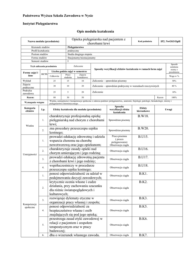 Państwowa Wyższa Szkoła Zawodowa w Nysie Instytut Pielęgniarstwa Opis modułu kształcenia Opieka pielęgniarska nad pacjentem z chorobami krwi Nazwa modułu (przedmiotu) Kierunek studiów Profil kształcenia Poziom studiów Forma studiów Semestr studiów Pielęgniarstwo praktyczny Studia drugiego stopnia Stacjonarny/niestacjonarny I Zaliczenie Tryb zaliczenia przedmiotu Formy zajęć i inne Liczba godzin zajęć w semestrze ECTS Wykład Zajęcia praktyczne Praktyka zawodowa Razem: Wymagania wstępne Kategoria efektów Lp. 1. Wiedza 2. 1. 2. Umiejętności 3. 4. 1. 2. 3. Kompetencje społeczne 4. 5. 6. IP2. NwOS3/OpH Kod podmiotu Sposoby weryfikacji efektów kształcenia w ramach form zajęć Sposób ustalania oceny z przedmiotu Całkowita Pracy studenta Zajęcia kontaktowe 25 15 10 Zaliczenie – sprawdzian pisemny 50% 30 10 20 Zaliczenie – sprawdzian praktyczny w warunkach rzeczywistych 40 % 25 5 20 Zaliczenie 10% 80 30 50 Waga w % Razem 100% Wiedza, umiejętności i kompetencje społeczne z zakresu podstaw pielęgniarstwa,, anatomii, fizjologii, patologii, farmakologii, interny i pielęgniarstwa internistycznego. Efekty kształcenia dla modułu (przedmiotu) charakteryzuje profesjonalną opiekę pielęgniarską nad chorym z chorobami krwi; zna procedury przeszczepu szpiku kostnego; prowadzi edukację zdrowotną i udziela wsparcia choremu na chorobę nowotworową oraz jego opiekunom; charakteryzuje zasady opieki nad chorym umierającym i jego rodziną; prowadzi edukację zdrowotną pacjenta z chorobami krwi i jego rodziny; współuczestniczy w procedurze przeszczepu szpiku kostnego; ponosi odpowiedzialność za udział w podejmowaniu decyzji zawodowych; krytycznie ocenia własne i cudze działania, przy zachowaniu szacunku dla różnic światopoglądowych i kulturowych; rozwiązuje dylematy etyczne w organizacji pracy własnej i zespołu; ponosi odpowiedzialność za bezpieczeństwo własne i osób znajdujących się pod jego opieką; przestrzega zasad etyki zawodowej w relacji z pacjentem i zespołem terapeutycznym oraz w pracy badawczej; dba o wizerunek własnego zawodu. Sposoby weryfikacji efektu kształcenia Efekty kierunkowe B.W18. Sprawdzian pisemny Sprawdzian pisemny Praca pisemna ( proces pielęgnowania) Obserwacja ciągła Obserwacja ciągła Obserwacja ciągła Obserwacja ciągła Obserwacja ciągła B.W20. B.U15. B.U16. B.U17. B.U18. B.K1. B.K2. Obserwacja ciągła Obserwacja ciągła B.K3. B.K5. Obserwacja ciągła B.K6. Obserwacja ciągła Obserwacja ciągła B.K7. Uwagi Prowadzący Forma zajęć Prowadzący zajęcia (tytuł/stopień naukowy, imię i nazwisko) Wykład Zajęcia praktyczne Praktyka zawodowa Treści kształcenia Wykład Metody dydaktyczne Wykład z wykorzystaniem technik multimedialnych Liczba godzin Lp. Tematyka zajęć Tematyczne efekty kształcenia W wyniku kształcenia student: 1. 2. 3. 4. Opieka pielęgniarska nad pacjentem z niedokrwistością. - przedstawia zasady pielęgnacji pacjenta z niedokrwistością, - zna zasady postępowania pielęgniarskiego w opiece nad pacjentem w wieku starszym z niedokrwistością. Standard opieki - przedstawia zasady pielęgnacji pacjenta z pielęgniarskiej nad rozpoznaną skazą krwotoczną, pacjentem ze skazą - zna odrębności w pielęgnacji pacjentów w krwotoczną. wieku starszym ze skazą krwotoczną. Opieka pielęgniarska w - przedstawia zasady pielęgnacji pacjenta w schorzeniach rozrostowych schorzeniach rozrostowych układu krwiotwórczego( ziarnica złośliwa, chłoniaki nieziarnicze), - zna zasady pielęgnacji błon śluzowych u pacjentów poddanych radioterapii i chemioterapii, - zna szczególne sytuacje życiowe u pacjentów z chorobą nowotworową. Udział pielęgniarki w - zna zadania pielęgniarki wynikające z przygotowaniu pacjenta do leczenia pacjenta metodą przeszczepu szpiku przeszczepu szpiku kostnego, kostnego oraz pielęgnacja - zna zasady zapobiegania powikłaniom u po zabiegu. pacjenta po przeszczepie szpiku kostnego. Razem liczba godzin: Zajęcia praktyczne Metody dydaktyczne 2 2 4 2 10 Instruktaż wstępny, bieżący i końcowy. Studium przypadku. Ćwiczenia praktyczne. Liczba godzin Lp. Tematyka zajęć Tematyczne efekty kształcenia W wyniku kształcenia student: 1. Pielęgnowanie pacjenta z niedokrwistością. - planuje i realizuje opiekę pielęgniarską nad pacjentem z niedokrwistością , - uczestniczy w transfuzji krwi, 5 2. 3. 4. - stosuje zasady postępowania pielęgniarskiego w opiece nad pacjentem w wieku starszym z niedokrwistością. Pielęgnowanie pacjenta ze - planuje i realizuje opiekę pielęgniarską nad skazą krwotoczną. pacjentem z rozpoznaną skazą krwotoczną, - stosuje zasady pielęgnacji pacjentów w wieku starszym ze skazą krwotoczną. Opieka pielęgniarska w - planuje i realizuje opiekę pielęgniarską nad schorzeniach rozrostowych pacjentem w schorzeniach rozrostowych układu krwiotwórczego( ziarnica złośliwa, chłoniaki nieziarnicze), - pielęgnuje błony śluzowe u pacjentów poddanych radioterapii i chemioterapii, - rozpoznaje sytuacje życiowe u pacjentów z chorobą nowotworową i pomaga w ich rozwiązaniu. Udział pielęgniarki w - prowadzi opiekę pielęgniarską nad pacjentem przygotowaniu pacjenta do poddanym leczeniu metodą przeszczepu szpiku przeszczepu szpiku kostnego, kostnego oraz pielęgnacja - zapobiega powikłaniom u pacjenta po po zabiegu. przeszczepie szpiku kostnego, - opracowuje standard opieki pielęgniarskiej nad pacjentem leczonym metodą przeszczepu szpiku kostnego. Razem liczba godzin: 5 5 5 20 20 Praktyka zawodowa Wykaz umiejętności praktycznych W wyniku kształcenia praktycznego student: ODDZIAŁ INTENSYWNEJ TERAPII MEDYCZNEJ - doskonali umiejętności w zakresie współdziałania w zespole terapeutycznym, - nawiązuje i podtrzymuje kontakt i pozytywne relacje z pacjentem onkologicznym i jego rodziną w oddziale w momencie przyjmowania na oddział oraz w czasie hospitalizacji, - podejmuje działania ukierunkowane na pro