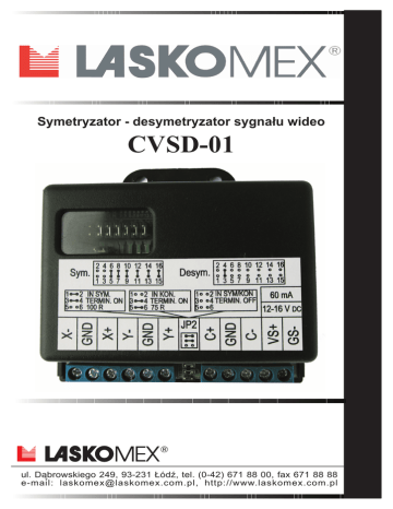 Symetryzator - desymetryzator sygna³u wideo CVSD-01 ul. D¹browskiego 249, 93-231 £ód, tel. (0-42) 671 88 00, fax 671 88 88 e-mail: [email protected], http://www.laskomex.com.pl Przeznaczenie Modu³ CVSD-01 umo¿liwia zamianê sygna³ów niesymetrycznych w symetryczne i odwrotnie, dowoln¹ konfiguracjê wejæ i wyjæ , korekcjê wzmocnienia oraz rozdzielenie sygna³u na dwa równoleg³e wyjcia. Linie wideo dopasowane s¹ do kabli koncentrycznych 75 lub symetrycznych 100 . Modu³ posiada sygnalizacjê za³¹czenia zasilania w postaci LED. CVSD-01 posiada obudowê z odpornego na udary tworzywa (ABS). Do pod³¹czenia instalacji wyposa¿ony jest w z³¹cza typu ARK. Modu³ umo¿liwia pod³¹czenie dodatkowych urz¹dzeñ takich jak: rejestratory, dodatkowe kamery itp. Zasilany jest z zasilacza pr¹du sta³ego stabilizowanego (12 16)V/0,1A lub przez kasetê elektroniki typu EC2502/EC3100. Posiada zabezpieczenie przed odwrotn¹ polaryzacj¹ zasilania. Monta¿ CVSD-01. Symetryzator-desymetryzator sygna³u wideo CVSD-01 nale¿y zamontowaæ w skrzynce instalacyjnej, lub na cianie wewn¹trz budynku. W tym celu nale¿y przy³o¿yæ podstawê do ciany, zaznaczyæ miejsca w których nale¿y wywierciæ otwory (W1, W2, rys.1). Nastêpnie nale¿y wywierciæ w cianie otwory pod ko³ki rozporowe i przykrêciæ podstawê. Pod³¹czyæ przewody do zacisków ARK w CVSD-01. W1 W2 Rys. 1:Monta¿ symetryzatora-desymetryzatora sygna³u wideo CVSD-01 Warunki u¿ytkowania CVSD-01 - Przed przyst¹pieniem do monta¿u nale¿y zapoznaæ siê z przeznaczeniem, funkcjami i wymaganiami producenta dotycz¹cymi CVSD-01 oraz wideodomofonu, do którego jest przeznaczony. - CVSD-01 jest elementem systemu wideodomofonowego CD-31XX i 25XX. - Symetryzator - desymetryzator sygna³u wideo nale¿y wykorzystywaæ zgodnie z przeznaczeniem i zaleceniami producenta. - Do zacisków CVSD-01 nie nale¿y pod³¹czaæ zasilania z innych róde³ ni¿, zalecane przez producenta, poniewa¿ mo¿e to doprowadziæ do jego uszkodzenia lub po¿aru. -2- Oznaczenie zacisków VS, GS GND X+,XY+,YC+,CC+, GND X+, GND Y+, GND Z³¹cze JP1- wybór funkcji urz¹dzenia. zasilanie (12-16)VDC/60mA masa SYMETRYZATOR DESYMETRYZATOR wyjcie symetryczne sygna³u wideo 1 wyjcie symetryczne sygna³u wideo 2 wejcie symetryczne sygna³u wideo korekcja wzmoc. +3dB wzmoc. +3dB wejcie niesymetryczne sygna³u wideo korekcja (Po za³o¿eniu jumpera) (Po zdjêciu jumpera) wyjcie niesymetryczne 1 wyjcie niesymetryczne 2 Z³¹cze JP2- konfiguracja wejcia. Wejcie symetryczne (C+, C-): JP1 Z³¹cze JP2 1 3 5 7 9 11 13 15 Za³o¿enie jumperów na JP2 powoduje ustawienie impedancji wejciowej 100 . KONFIGURACJA WEJCIA 1 3 5 2 SYMETR. 4 TERMIN. ON 6 100R 1 3 5 2 KONCENTR. 4 TERMIN. ON 6 75R 1 3 5 2 4 SYM/KON 6 TERMIN. OFF WYJCIA X- GND X+ Y- GND Y+ JP2 U1 (12-16)V DC WEJCIE 50mA C+ GND C- +VS GS Wejcie koncentryczne (C+, GND): Nie nalezy wykorzystywaæ wejcia (C-). Jest zwarte przez nisk¹ rezystancjê do masy GND. Z³¹cze JP2 Za³o¿enie jumperów na JP2 powoduje ustawienie impedancji wejciowej 75 . Rys. 2. Symetryzator-desymetryzator sygna³u wideo CVSD-01 UWAGA 1. Aby wy³¹czyæ terminator impedancji wejciowej nale¿y zdj¹æ oba jumpery ze z³¹cza JP2. 2.Przed pod³¹czeniem zasilania sprawdziæ prawid³owoæ ustawienia jumperów na z³¹czach JP1-JP2. Nieprawid³owe ustawienia mog¹ skutkowaæ niestabiln¹ prac¹ systemu. -3- Wyjcia symetryczne (X+, X-); (Y+, Y-): Dwa równoleg³e wyjcia o jednakowych poziomach sygna³u i impedancji 100 . Wyjcia koncentryczne (X+, GND); (Y+, GND): Dwa równoleg³e wyjcia asymetryczne (koncentryczne) o jednakowych poziomach sygna³u i impedancji 75 . Dane techniczne Zasilanie (12-16)V DC stabilizowane / 0,1A lub z kasety EC-25XX/EC-31XX Napiêcie wejciowe sygna³u wideo asymetrycznego.......... 1Vpp/75 (Wartoæ nominalna) Napiêcie wejciowe sygna³u wideo symetrycznego........... 2Vpp/100 (Wartoæ nominalna) Napiêcie wyjciowe sygna³u wideo asymetrycznego.......... 1Vpp+ - 3dB/ 75 Napiêcie wyjciowe sygna³u wideo symetrycznego............ 2Vpp + - 3dB/100 Korekcja wzmocnienia (dowolna konfiguracja)...................... (+3 + 1)dB Pasmo czêstotliwoci 10 Hz 6 MHz + 3dB Asymetria poziomu sygna³ów wyjciowych (X, Y) Max. + - 1dB Impedancja wejciowa Impedancja wyjciowa Stopieñ ochrony IP-30 Wymiary 65x66x20mm Waga ok. 62g Wejcie koncentryczne 75 Wejcie symetryczne 100 Wyjcie koncentryczne 75 Wyjcie symetryczne 100 UWAGA!! Je¿eli sygna³ wejciowy jest mniejszy ni¿ -6dB od wartoæi nominalnej (Uve<0,5Vpp dla wejcia koncentrycznego) wartoæ sygna³u wyjciowego mo¿e przekraczac podane wy¿ej granice. SYMETRYZATOR + - C+ C- GND VIDEO B+ Zasilacz stabil. (12-16)V/0,1A Linia X C- Linia Y Monitor Wejscie koncentryczne C+ GND C+ C- + Zasilacz stabil. 12V/0,5A CVSD-01 + - Kamera C+ Monitor Monitor Wejscie symetryczne Zasilacz stabil. (12-16)V/0,1A DESYMETRYZATOR GS +VS CGND C+ JP2 Y+ GND YX+ GND X- GS +VS CGND C+ JP2 Y+ GND YX+ GND X- CVSD-01 + - 10% + - 10% + - 10% + -10% CP-2502 Rys. 3. Schemat pod³¹czeñ WSKAZÓWKI DOTYCZ¥CE OCHRONY RODOWISKA WSKAZÓWKI DOTYCZCE OCHRONY kosza, RODOWISKA Produkt zosta³ oznaczony symbolem przekrelonego zgodnie z europejsk¹ dyrektyw¹ 2002/96/WE o zu¿ytym sprzêcie elektrycznym i elektronicznym. Po jego zu¿yciu lub zakoñczeniu u¿ytkowania nie mo¿e byæ umieszczony wraz z innymi, zwyk³ymi odpadami pochodz¹cymi z gospodarstw domowych. U¿ytkownik produktu jest zobowi¹zany do oddania go prowadz¹cym zbieranie zu¿ytego sprzêtu elektrycznego i elektronicznego, jak lokalne zbiórki, sklepy, punkty wytypowane przez producenta oraz odpowiednie gminne jednostki zbierania odpadów. Lista punktów zbierania zu¿ytego sprzêtu firmy LASKOMEX dostêpna jest na www.laskomex.com.pl lub pod nr telefonicznym 42 671 88 68. Opakowanie produktu nale¿y usuwaæ zgodnie z przepisami ochrony rodowiska. Pamiêtaj! Selektywne przekazywanie do utylizacji zu¿ytego sprzêtu elektrycznego i elektronicznego znacznie przyczyni