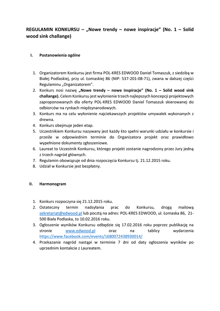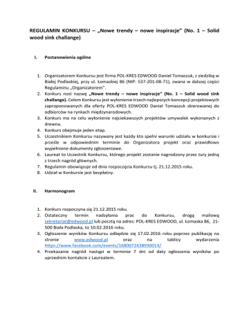 REGULAMIN KONKURSU – „Nowe trendy – nowe inspiracje” (No. 1 – Solid wood sink challange) I. Postanowienia ogólne 1. Organizatorem Konkursu jest firma POL-KRES EDWOOD Daniel Tomaszuk, z siedzibą w Białej Podlaskiej, przy ul. Łomaskiej 86 (NIP: 537-201-08-71), zwana w dalszej części Regulaminu „Organizatorem”. 2. Konkurs nosi nazwę „Nowe trendy – nowe inspiracje” (No. 1 – Solid wood sink challange). Celem Konkursu jest wyłonienie trzech najlepszych koncepcji projektowych zaproponowanych dla oferty POL-KRES EDWOOD Daniel Tomaszuk skierowanej do odbiorców na rynkach międzynarodowych. 3. Konkurs ma na celu wyłonienie najciekawszych projektów umywalek wykonanych z drewna. 4. Konkurs obejmuje jeden etap. 5. Uczestnikiem Konkursu nazywany jest każdy kto spełni warunki udziału w konkursie i prześle w odpowiednim terminie do Organizatora projekt oraz prawidłowo wypełnione dokumenty zgłoszeniowe. 6. Laureat to Uczestnik Konkursu, którego projekt zostanie nagrodzony przez Jury jedną z trzech nagród głównych. 7. Regulamin obowiązuje od dnia rozpoczęcia Konkursu tj. 21.12.2015 roku. 8. Udział w Konkursie jest bezpłatny. II. Harmonogram 1. Konkurs rozpoczyna się 21.12.2015 roku. 2. Ostateczny termin nadsyłania prac do Konkursu, drogą mailową [email protected] lub pocztą na adres: POL-KRES EDWOOD, ul. Łomaska 86, 21500 Biała Podlaska, to 10.02.2016 roku. 3. Ogłoszenie wyników Konkursu odbędzie się 17.02.2016 roku poprzez publikację na stronie www.edwood.pl oraz na tablicy wydarzenia https://www.facebook.com/events/1680072438930014/ 4. Przekazanie nagród nastąpi w terminie 7 dni od daty ogłoszenia wyników po uprzednim kontakcie z Laureatem. III. Uczestnicy Konkursu 1. Studenci uczelni państwowych oraz szkół prywatnych i kursów/ kół/ warsztatów kształcących w kierunkach związanych z tematyką konkursu. 2. Absolwenci uczelni państwowych oraz szkół prywatnych i kursów/ kół/ warsztatów kształcących w kierunkach związanych z tematyką konkursu. IV. Wytyczne Konkursu 1. Tematem Konkursu jest zaprojektowanie umywalki wykonanej z drewna litego w bryle o maksymalnej wysokości 140 mm. 2. Do projektu umywalki można dodatkowo dołączyć prezentację (w dowolnej formie) przedstawiającą, co było inspiracją Uczestnika przy pracy nad projektem oraz nazwę swojego projektu. 3. Projekt powinien przedstawiać produkt będący podstawą oceny w Konkursie. Projekt uwzględniający wymiary umywalki będzie dodatkowym atutem. 4. Projekt nie ma ograniczeń technologicznych 5. Prace powinny być dostarczane w formie umożliwiającej wydruk projektu. V. Kryteria oceny projektów 1. Projekt będzie oceniany pod względem estetyki, pomysłowości oraz funkcjonalności produktu. 2. Przy ocenie przesłanych projektów Jury weźmie pod uwagę potencjał produktu do wprowadzenia umywalki do seryjnej produkcji. VI. Warunki udziału w Konkursie 1. Warunkiem udziału w Konkursie jest: a. Przesłanie projektu do Organizatora, drogą mailową [email protected] lub pocztą na adres: POL-KRES EDWOOD, ul. Łomaska 86, 21-500 Biała Podlaska, to 10.02.2016 roku. Każdy uczestnik by wziąć udział w konkursie musi załączyć wypełniony formularz (dostępny na stronie www.edwood.pl). b. Projekt może mieć formę odręcznego szkicu lub wizualizacji komputerowej (minimum 3 rysunki lub wizualizacje w formacie PDF lub PP). 2. Wyrażenie zgody na przetwarzanie danych osobowych dla potrzeb przeprowadzenia Konkursu oraz na rozpowszechnianie i reprodukowanie projektów zgłoszonych do Konkursu w związku z wystawami pokonkursowymi oraz promocją marki POL-KRES EDWOOD Daniel Tomaszuk. 3. Każdy Uczestnik przystępujący do Konkursu oświadcza, że przysługują mu autorskie prawa majątkowe i osobiste do zgłoszonego Projektu. 4. Strony ustalają, że Organizator ma prawo do wykorzystania projektów Laureatów w celach promocyjnych w formie drukowanej, na wystawach, w prasie i materiałach reklamowych oraz w formie realizacji projektu ekspozycji produktów marki POL-KRES EDWOOD Daniel Tomaszuk. Projekty będą wykorzystywane w powiązaniu z nazwiskiem projektanta. Prawa autorskie i majątkowe do zrealizowanych projektów zostaną nieodpłatnie przekazane na Organizatora konkursu. 5. Nadesłanie projektu jest równoznaczne z akceptacją Regulaminu. 6. Uczestnicy przesyłają prace na swój koszt. 7. Organizator nie odsyła zgłaszanych projektów. 8. Spośród zaprezentowanych projektów Jury wybierze trzy najlepsze prace i nagrodzi je nagrodami określonymi w punkcie VIII Regulaminu. VII. Jury 1. W skład Jury Konkursu wchodzą: a. Daniel Tomaszuk – Przewodniczący Jury b. Monika Charkiewicz c. Monika Kuszneruk d. Małgorzata Matejek e. Roman Zimniewicz 2. Obrady Jury są tajne. 3. Jury podejmie decyzję zwykłą większością głosów. W przypadku równej liczby głosów decyduje głos Przewodniczącego Jury. 4. Pracami Jury kieruje Przewodniczący. VIII. Nagrody 1. Jury przyzna w Konkursie trzy nagrody główne o wysokości kolejno: I nagroda – 2500 PLN, II nagroda – 1500 PLN, III nagroda – 1000 PLN. Laureaci nagród mają szansę wdrożenia swojego produktu do produkcji w 2016 roku oraz możliwość nawiązania współpracy przy tworzeniu i wdrażaniu przyszłych projektów. Dodatkowo Laureaci dostaną dyplomy potwierdzające wyróżnienie w Konkursie. 2. Organizator pozostawia sobie oraz jurorom możliwość ufundowania dodatkowych nagród. 3. Laureaci mają prawo do wykorzystywania informacji o udziale w Konkursie w celach promocyjnych. IX. Postanowienia końcowe 1. Organizator zastrzega sobie prawo do zmiany Regulaminu. 2. Informacja o ewentualnych zmianach zostanie opublikowana www.edwood.pl na stronie