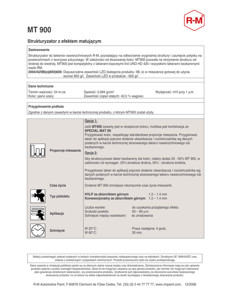 MT 900 Strukturyzator z efektem matuj cym Zastosowanie Strukturyzator do lakierów nawierzchniowych R-M, pozwalaj cy na odtworzenie oryginalnej struktury i usuni cie połysku na powierzchniach z tworzywa sztucznego. W zale no ci od stosowanej ilo ci, MT900 pozwala na otrzymanie struktury od drobnej do redniej. MT900 jest kompatybilny z lakierami bazowymi linii UNO HD 420 i wszystkimi lakierami bezbarwnymi marki RM. 2004/42/IIB(e)(850)600: Dopuszczalna zawarto LZO (kategoria produktu: IIB, e) w mieszance gotowej do u ycia wynosi 850 g/l. Zawarto LZO w produkcie - 600 g/l Dane techniczne Termin wa no ci: 24 m-ce Kolor: jasno szary G sto : 0,994 g/cm3 Zawarto cz ci stałych: 40,5 % wagowo Wydajno : m²/l przy 1 µ m Przygotowanie podło a Zgodnie z danymi zawartymi w karcie technicznej produktu, z którym MT900 został u yty. Opcja 1: Proporcje mieszania Je li MT900 zawarty jest w recepturze koloru, mo liwa jest kombinacja ze SPECIAL MAT 09: Przygotowa kolor, respektuj c standardowe proporcje mieszania. Przygotowa lakier do aplikacji poprzez dodanie utwardzacza i rozcie czalnika wg danych podanych w karcie technicznej stosowanego lakieru nawierzchniowego lub bezbarwnego. Opcja 2: Aby strukturyzowa lakier bezbarwny lub kolor, nale y doda 25 - 50% MT 900, w zale no ci od wymaga . 25%:struktura drobna, 50% : struktura rednia. Przygotowa lakier do aplikacji poprzez dodanie utwardzacza i rozcie czalnika wg danych podanych w karcie technicznej stosowanego lakieru nawierzchniowego lub bezbarwnego. Czas ycia Dodanie MT 900 zmniejsza nieznacznie czas ycia mieszanki. Typ pistoletu HVLP ze zbiornikiem górnym 1.3 – 1.4 mm Konwencjonalny ze zbiornikiem górnym 1.3 – 1.4 mm Aplikacja Schni cie Liczba warstw: Grubo powłoki: Schni cie mi dzy warstwami: do uzyskania po danego efektu 50 – 60 µ m do zmatowania W 20°C: W 60°C: Prace nast pne: 4 godz. 30 min. Nale y przestrzega zalece podanych w kartach charakterystyki preparatu niebezpiecznego oraz na etykietach. Dyrektywa UE 1999/45/EC oraz Ustawa o substancjach i preparatach chemicznych. Produkt przeznaczony tylko do u ytku profesjonalnego Dane zawarte w niniejszej publikacji oparte s na obecnym stanie naszej wiedzy oraz do wiadczeniu. Zamieszczone informacje maj na celu opisanie produktu jedynie z punktu wymaga bezpiecze stwa. Dane te nie mog by uwa ane za opis jako ci produktu, jak równie nie mog by traktowane jako gwarancja okre lonych wła ciwo ci, czy przeznaczenia produktu. U ytkownik jest odpowiedzialny za stworzenie warunków bezpiecznego stosowania produktu i to on bierze na siebie odpowiedzialno za skutki wynikaj ce z niewła ciwego stosowania produktu. R-M Automotive Paint, F-60676 Clermont de l'Oise Cedex, Tel. (33) (0) 3 44 77 77 77, www.rmpaint.com, 12/2006