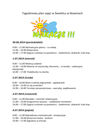 Tygodniowy plan zajęć w Świetlicy w Nowinach 30.06.2014 (poniedziałek) 9.00 – 11.00 Abstrakcyjne plamy – co widzę 11.00 – 14.00 Skojarzenia 14.00 – 17.00 Zajęcia ruchowe na powietrzu – badminton, skakanki, hula hop 1.07.2014 (wtorek) 9.00 – 11.00 Wylosuj zadanie 11.00 – 14.00 Idziemy na wycieczkę, bierzemy... w teczkę – wakacyjny ekwipunek 14.00 – 17.00 Pudełeczko na skarby 2.07.2014 (środa) 8.00 – 10.00 Mistrz trafnej odpowiedzi - zgadywanki 10.00 – 13.00 Co się zmieniło? 13.00 – 16.00 Turnieje sprawnościowe – warcaby, wędkowanie 3.07.2014 (czwartek) 9.00 – 11.00 Mandala – techniki relaksacyjne 11.00 – 14.00 Drogocenne wazony – ozdabianie monetami 14.00 – 17.00 Zajęcia ruchowe na powietrzu – badminton, skakanki, hula hop 4.07.2014 (piątek) 9.00 – 11.00 Nakrętkowe minizwierzaki - kompozycje 11.00 – 14.00 Muzyczne duety - konkurs 14.00 – 17.00 Zagrajmy w emocje