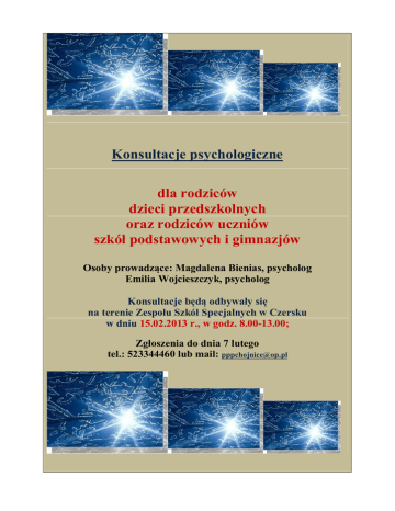 Konsultacje psychologiczne dla rodziców dzieci przedszkolnych oraz rodziców uczniów szkó podstawowych i gimnazjów Osoby prowadz ce: Magdalena Bienias, psycholog Emilia Wojcieszczyk, psycholog Konsultacje b odbywa y si na terenie Zespo u Szkó Specjalnych w Czersku w dniu 15.02.2013 r., w godz. 8.00-13.00; Zg oszenia do dnia 7 lutego tel.: 523344460 lub mail: [email protected]