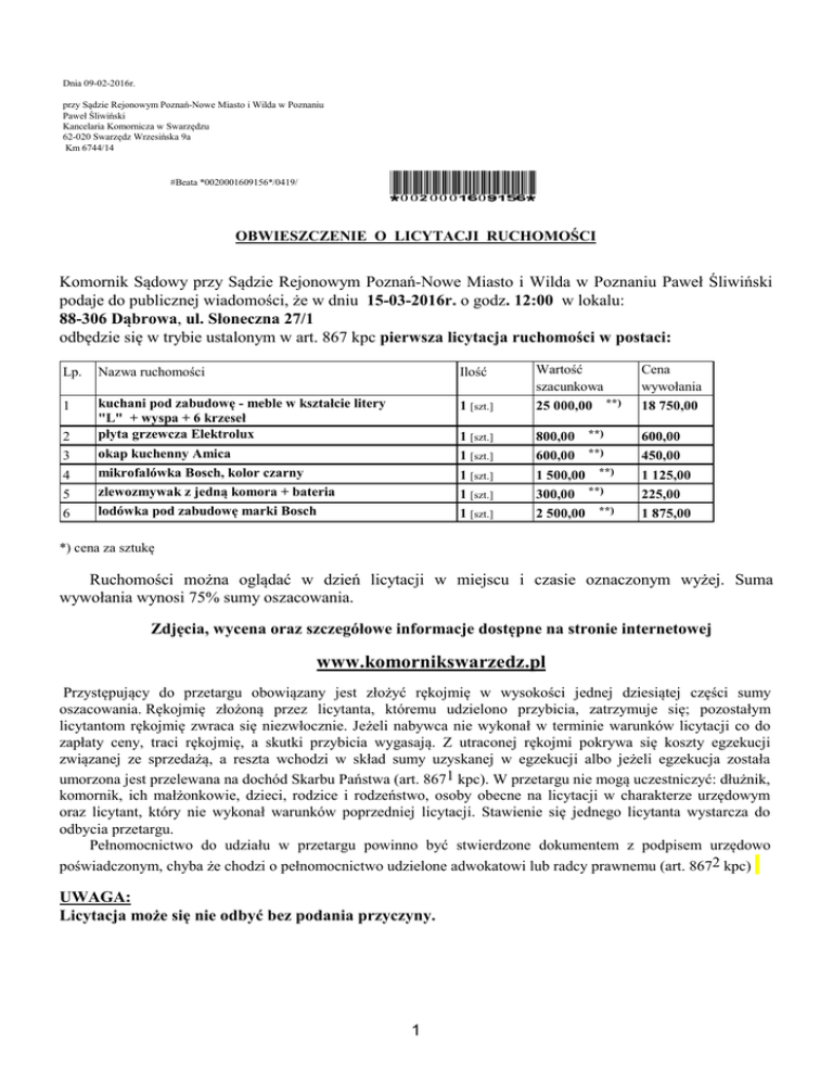 Dnia 09-02-2016r. przy Sądzie Rejonowym Poznań-Nowe Miasto i Wilda w Poznaniu Paweł Śliwiński Kancelaria Komornicza w Swarzędzu 62-020 Swarzędz Wrzesińska 9a Km 6744/14 *0020001609156* #Beata *0020001609156*/0419/ OBWIESZCZENIE O LICYTACJI RUCHOMOŚCI Komornik Sądowy przy Sądzie Rejonowym Poznań-Nowe Miasto i Wilda w Poznaniu Paweł Śliwiński podaje do publicznej wiadomości, że w dniu 15-03-2016r. o godz. 12:00 w lokalu: 88-306 Dąbrowa, ul. Słoneczna 27/1 odbędzie się w trybie ustalonym w art. 867 kpc pierwsza licytacja ruchomości w postaci: 1 [szt.] Wartość szacunkowa 25 000,00 **) Cena wywołania 18 750,00 1 [szt.] 1 [szt.] 1 [szt.] 1 [szt.] 1 [szt.] 800,00 **) 600,00 **) 1 500,00 **) 300,00 **) 2 500,00 **) 600,00 450,00 1 125,00 225,00 1 875,00 Lp. Nazwa ruchomości Ilość 1 kuchani pod zabudowę - meble w kształcie litery "L" + wyspa + 6 krzeseł płyta grzewcza Elektrolux okap kuchenny Amica mikrofalówka Bosch, kolor czarny zlewozmywak z jedną komora + bateria lodówka pod zabudowę marki Bosch 2 3 4 5 6 *) cena za sztukę Ruchomości można oglądać w dzień licytacji w miejscu i czasie oznaczonym wyżej. Suma wywołania wynosi 75% sumy oszacowania. Zdjęcia, wycena oraz szczegółowe informacje dostępne na stronie internetowej www.komornikswarzedz.pl Przystępujący do przetargu obowiązany jest złożyć rękojmię w wysokości jednej dziesiątej części sumy oszacowania. Rękojmię złożoną przez licytanta, któremu udzielono przybicia, zatrzymuje się; pozostałym licytantom rękojmię zwraca się niezwłocznie. Jeżeli nabywca nie wykonał w terminie warunków licytacji co do zapłaty ceny, traci rękojmię, a skutki przybicia wygasają. Z utraconej rękojmi pokrywa się koszty egzekucji związanej ze sprzedażą, a reszta wchodzi w skład sumy uzyskanej w egzekucji albo jeżeli egzekucja została umorzona jest przelewana na dochód Skarbu Państwa (art. 8671 kpc). W przetargu nie mogą uczestniczyć: dłużnik, komornik, ich małżonkowie, dzieci, rodzice i rodzeństwo, osoby obecne na licytacji w charakterze urzędowym oraz licytant, który nie wykonał warunków poprzedniej licytacji. Stawienie się jednego licytanta wystarcza do odbycia przetargu. Pełnomocnictwo do udziału w przetargu powinno być stwierdzone dokumentem z podpisem urzędowo poświadczonym, chyba że chodzi o pełnomocnictwo udzielone adwokatowi lub radcy prawnemu (art. 8672 kpc) UWAGA: Licytacja może się nie odbyć bez podania przyczyny. 1