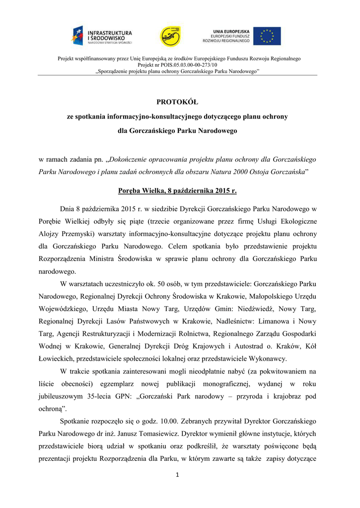 Projekt współfinansowany przez Unię Europejską ze środków Europejskiego Funduszu Rozwoju Regionalnego Projekt nr POIS.05.03.00-00-273/10 „Sporządzenie projektu planu ochrony Gorczańskiego Parku Narodowego” PROTOKÓŁ ze spotkania informacyjno-konsultacyjnego dotyczącego planu ochrony dla Gorczańskiego Parku Narodowego w ramach zadania pn. „Dokończenie opracowania projektu planu ochrony dla Gorczańskiego Parku Narodowego i planu zadań ochronnych dla obszaru Natura 2000 Ostoja Gorczańska” Poręba Wielka, 8 października 2015 r. Dnia 8 października 2015 r. w siedzibie Dyrekcji Gorczańskiego Parku Narodowego w Porębie Wielkiej odbyły się piąte (trzecie organizowane przez firmę Usługi Ekologiczne Alojzy Przemyski) warsztaty informacyjno-konsultacyjne dotyczące projektu planu ochrony dla Gorczańskiego Parku Narodowego. Celem spotkania było przedstawienie projektu Rozporządzenia Ministra Środowiska w sprawie planu ochrony dla Gorczańskiego Parku narodowego. W warsztatach uczestniczyło ok. 50 osób, w tym przedstawiciele: Gorczańskiego Parku Narodowego, Regionalnej Dyrekcji Ochrony Środowiska w Krakowie, Małopolskiego Urzędu Wojewódzkiego, Urzędu Miasta Nowy Targ, Urzędów Gmin: Niedźwiedź, Nowy Targ, Regionalnej Dyrekcji Lasów Państwowych w Krakowie, Nadleśnictw: Limanowa i Nowy Targ, Agencji Restrukturyzacji i Modernizacji Rolnictwa, Regionalnego Zarządu Gospodarki Wodnej w Krakowie, Generalnej Dyrekcji Dróg Krajowych i Autostrad o. Kraków, Kół Łowieckich, przedstawiciele społeczności lokalnej oraz przedstawiciele Wykonawcy. W trakcie spotkania zainteresowani mogli nieodpłatnie nabyć (za pokwitowaniem na liście obecności) egzemplarz nowej publikacji monograficznej, wydanej w roku jubileuszowym 35-lecia GPN: „Gorczański Park narodowy – przyroda i krajobraz pod ochroną”. Spotkanie rozpoczęło się o godz. 10.00. Zebranych przywitał Dyrektor Gorczańskiego Parku Narodowego dr inż. Janusz Tomasiewicz. Dyrektor wymienił główne instytucje, których przedstawiciele biorą udział w spotkaniu oraz podkreślił, że warsztaty poświęcone będą prezentacji projektu Rozporządzenia dla Parku, w którym zawarte są także zapisy dotyczące 1 Projekt współfinansowany przez Unię Europejską ze środków Europejskiego Funduszu Rozwoju Regionalnego Projekt nr POIS.05.03.00-00-273/10 „Sporządzenie projektu planu ochrony Gorczańskiego Parku Narodowego” otuliny. Następnie przekazał głos Wykonawcy planu dr Alojzemu Przemyskiemu, który powitał zebranych i przypomniał, że są to już ostatnie warsztaty z zaplanowanych w ramach projektu. Poinformował o nagrywaniu spotkania, a także poprosił o wpisanie się zgromadzonych na listę obecności. Prelegent przedstawił harmonogram, po czym rozpoczął prezentację pierwszej części tematycznej pn.: „Aspekty formalne zatwierdzania planu ochrony dla Gorczańskiego Parku Narodowego”. Przypomniał przebieg prac nad planem, odwołał się do podstaw prawnych sporządzania planu ochrony, a następnie skupił się na aspektach uspołecznienia procesu planistycznego. Porządek prezentacji został zakłócony przez przedstawiciela lokalnej społeczności, który wyraził sprzeciw wobec funkcjonowania obszaru Natura 2000 na działkach będących jego własnością, po czym opuścił spotkanie. Przywołanie tematu planu zadań ochronnych dla Ostoi Gorczańskiej spowodowało aktywizację zebranych i sprowokowało dyskusję na tematy odbiegające od założonych dla spotkania. Uwagi zgłosili m.in. Pani Małgorzata Mordarska-Duda z Małopolskiego Urzędu Wojewódzkiego, Delegatura w Nowym Sączu oraz Wójt Gminy Niedźwiedź Janusz Potaczek. Dr Alojzy Przemyski wyjaśnił, że sprawa planu zadań ochronnych jest nadal otwarta; możliwe będzie jeszcze zgłaszanie uwag i wniosków na etapie konsultacji społecznych i zostaną one włączone do dokumentacji projektu. W zaistniałej sytuacji głos zabrała Pani Małgorzata Michna, planista regionalny, RDOŚ Kraków. Wyjaśniła, że Zarządzenie Regionalnego Dyrektora Ochrony Środowiska w sprawie planu zadań ochronnych dla obszaru Natura 2000 Ostoja Gorczańska, poza granicami Parku może zostać ustanowione dopiero po zakończeniu prac nad Rozporządzeniem Ministra Środowiska w sprawie planu ochrony dla Gorczańskiego Parku Narodowego. Zachęciła właścicieli gruntów do podejmowania dyskusji z RDOŚ w Krakowie. Wyjaśniła także skrótowo skutki ustanowienia planu zadań ochronnych dla prywatnych właścicieli gruntów oraz poinformowała, że na stronach internetowych RDOŚ Kraków zamieszczone są obowiązujące zarządzenia dla innych obszarów Natura 2000, z którymi można się na bieżąco zapoznawać. Do wypowiedzi planisty regionalnego odnieśli się m.in. przedstawiciele RDLP w Krakowie, podnosząc problemy gospodarowania w obrębie siedlisk przyrodniczych w lasach prywatnych. Wójt gminy Niedźwiedź przypomniał o wnioskach zgłoszonych przez mieszkańców gminy, w sprawie wyłączenia ich działek z obszaru Natura 2000. Dr Alojzy Przemyski potwierdził otrzymanie tych wniosków i jednocześnie podkreślił, 2 Projekt współfinansowany przez Unię Europejską ze środków Europejskiego Funduszu Rozwoju Regionalnego Projekt nr POIS.05.03.00-00-273/10 „Sporządzenie projektu planu ochrony Gorczańskiego Parku Narodowego” że otrzymane materiały nie były kompletne (brakowało m.in. podania obrębów ewidencyjnych oraz uzasadnienia) i w takiej postaci ich rozpatrzenie nie jest możliwe. Po raz kolejny przypomniał także, że Wykonawca planu może jedynie wskazać propozycje zmian granic Ostoi Gorczańskiej poparte odpowiednim uzasadnieniem, natomiast decyzja jest podejmowana przez odpowiednie instytucje odpowiedzialne za funkcjonowanie sieci Natura 2000. W dalszej części spotkania skoncentrowano się już na projekcie Rozporządzenia. Pani dr Agnieszka Pierścińska przypomniała zebranym dokumentację składają