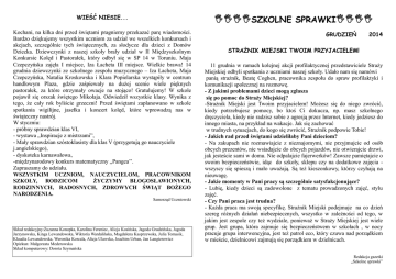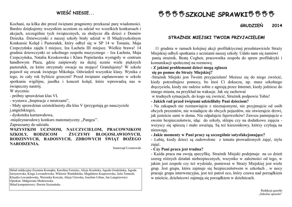 SZKOLNE SPRAWKI WIEŚĆ NIESIE... Kochani, na kilka dni przed świętami pragniemy przekazać parę wiadomości. Bardzo dziękujemy wszystkim uczniom za udział we wszelkich konkursach i akcjach, szczególnie tych świątecznych, za słodycze dla dzieci z Domów Dziecka. Dziewczynki z naszej szkoły brały udział w II Międzyszkolnym Konkursie Kolęd i Pastorałek, który odbył się w SP 14 w Toruniu. Maja Czepczyńska zajęła I miejsce, Iza Łacheta III miejsce. Wielkie brawa! 14 grudnia dziewczynki ze szkolnego zespołu muzycznego – Iza Łacheta, Maja Czepczyńska, Natalia Kroskowska i Klara Popielarska wystąpiły w centrum handlowym Plaza, gdzie zaśpiewały na dużej scenie wiele pięknych pastorałek, za które otrzymały owacje na stojąco! Gratulujemy! W szkole pojawił się orszak świętego Mikołaja. Odwiedził wszystkie klasy. Wynika z tego, że cały rok byliście grzeczni! Przed świętami zaplanowano w szkole spotkania wigilijne, jasełka i koncert kolęd, które wprowadzą nas w świąteczny nastrój. W styczniu: - próbny sprawdzian klas VI, - wystawa „Inspiracje z mistrzami”, - Mały sprawdzian szóstoklasisty dla klas V (przygotują go nauczyciele j.angielskiego), - dyskoteka karnawałowa, -międzynarodowy konkurs matematyczny ,,Pangea’’. Zapraszamy do udziału. WSZYSTKIM UCZNIOM, NAUCZYCIELOM, PRACOWNIKOM SZKOŁY, RODZICOM ŻYCZYMY BŁOGOSŁAWIONYCH, RODZINNYCH, RADOSNYCH, ZDROWYCH ŚWIĄT BOŻEGO NARODZENIA. Samorząd Uczniowski Skład redakcyjny:Zuzanna Konopka, Karolina Fereniec, Alicja Kosińska, Jagoda Grudzińska, Jagoda Jarzynowska, Kinga Lewandowska, Wiktoria Wardalińska, Magdalena Kasprzewska, Julia Tomasik, Klaudia Lewandowska, Weronika Korcala, Alicja Ulawska, Joachim Urban, Jan Langierowicz Opiekun: Małgorzata Mederowska Skład komputerowy: Dorota Szymańska GRUDZIEŃ 2014 STRAŻNIK MIEJSKI TWOIM PRZYJACIELEM! 11 grudnia w ramach kolejnej akcji profilaktycznej przedstawiciele Straży Miejskiej odbyli spotkania z uczniami naszej szkoły. Udało nam się namówi panią strażnik, Beatę Coghen, pracownika zespołu do spraw profilaktyki i komunikacji społecznej na rozmowę. - Z jakimi problemami dzieci mogą zgłasza się po pomoc do Straży Miejskiej? -Strażnik Miejski jest Twoim przyjacielem! Możesz się do niego zwrócić, kiedy potrzebujesz pomocy, bo ktoś Ci dokucza, np. masz szkolnego dręczyciela, kiedy nie radzisz sobie z agresją przez Internet, kiedy jedziesz do innego miasta, na przykład na wakacje. Jak się zachować w trudnych sytuacjach, do kogo się zwrócić, Strażnik podpowie Tobie! - Jakich rad przed świętami udzieliłaby Pani dzieciom? - Na zakupach nie rozmawiajcie z nieznajomymi, nie przyjmujcie od osób obcych prezentów, nie wsiadajcie do obcych pojazdów, nie otwierajcie drzwi, jak jesteście sami w domu. Nie odpalajcie fajerwerków! Zawsze pamiętajcie o swoim bezpieczeństwie, idąc do szkoły, sklepu czy na dodatkowe zajęcia wszyscy się spieszą i mało uważają. Są też kieszonkowy, którzy czyhają na nieuwagę. - Jakie momenty w Pani pracy są szczególnie satysfakcjonujące? - Lubię, kiedy dzieci są zadowolone z tematu prowadzonych zajęć, stylu zajęć. - Czy Pani praca jest trudna? - Każda praca ma swoją specyfikę. Strażnik Miejski podejmuje na co dzień szereg różnych działań niebezpiecznych, wszystko w zależności od tego, w jakim jest zespole czy też wydziale, ponieważ w Straży Miejskiej jest wiele grup. Jest grupa, która zajmuje się bezpieczeństwem w szkołach , w nocy pracuje grupa interwencyjna, jest też patrol eco, który czuwa nad porządkiem w mieście, dzielnicowi zajmują się porządkiem w dzielnicach. Redakcja gazetki „Szkolne sprawki” ŚWIATOWY DZIEŃ PRAW CZŁOWIEKA Światowy Dzień Praw Człowieka obchodzony jest 10 grudnia. Poświęcony jest sprzymierzeńcom praw człowieka, którzy bronią swoich praw i praw innych. Wkładają w to wiele pracy i wysiłku. Często są za to niesłusznie oskarżani i prześladowani oraz tracą przez to pracę, są niesłusznie więzieni. Dzień ten obchodzony jest dlatego, żeby uczcić odwagę tych ludzi. Oto kilka przykładów praw człowieka: Każdy człowiek ma prawo do życia, wolności i bezpieczeństwa. Każdy człowiek ma prawo spokojnego gromadzenia i stowarzyszania się. Nikogo nie można zmuszać do należenia do jakiegoś stowarzyszenia. Każdy człowiek ma prawo do uczestniczenia w rządzeniu swym krajem bezpośrednio lub poprzez swobodnie wybranych przedstawicieli. Każdy człowiek ma prawo równego dostępu do służby publicznej w swym kraju. Dzieci też mają swoje prawa. Mają prawo do: wychowywania i dorastania w rodzinie, nauki, wypoczynku i rozrywki, ochrony zdrowia i opieki medycznej, rozwoju osobowości, dostępu do informacji, ochrony przed wyzywaniem i poniżającym traktowaniem, prywatności. Jagoda G., Jagoda J POMYSŁ NA... Bombkę ze styropianowej kuli i tasiemek Przygotuj: -styropianową kulę -srebrną taśmę lub sznurek (ok. 1,5 m na bombkę o średnicy 6 cm) -fioletową taśmę z cekinami (ok. 1m) -szpilki krawieckie z metalową główką -trzy fioletowe materiałowe różyczki -kawałek fioletowej tasiemki do zrobienia zawieszki -klej uniwersalny Wykonanie: Ozdabianie bombki zacznij od wierzchołka. W kulce zrób mały otworek i wprowadź do niego koniec srebrnej tasiemki (przed tym możesz posmarować go klejem.) Umocuj dodatkowo szpilką. Owijaj taśmą kulę i mocuj szpilkami co 1 cm. Gdy dojdziesz mnie więcej do połowy bombki, utnij taśmę i umocuj ją szpilkami. Owiń bombkę kilka razy taśmą z cekinami (szpilki wbijaj do środeczków cekinów). W taki sam sposób udekoruj całą bombkę. Gdy skończysz, zrób z tasiemki zawieszkę, umocuj ją również za pomocą szpilki, a na koniec przyczep trzy materiałowe różyczki. Gdy pierwsza gwiazdka na niebie zabłyśnie, I mały Jezus urodzi się w stajence, Wszyscy na świecie radować się będę Przy wigilijnym stole. Wesołych Świąt