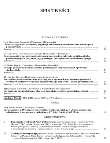 SPIS TREŚCI STUDIA I ARTYKUŁY Prof. Bogusław Banaszak (Uniwersytet Wrocławski) O konstytucyjności ustawowej regulacji zawieszenia przedawnienia zobowiązań podatkowych ................................................................................................................................. Summary ............................................................................................................................................. 9 17 Dr Artur Gill (Uniwersytet im. Adama Mickiewicza w Poznaniu) Postępowanie w sprawie przygotowania inwestycji w zakresie lotniska użytku publicznego jako przykład „wyjątkowego” postępowania administracyjnego ........... Summary ............................................................................................................................................. 19 27 Dr Marta Kopacz (Uniwersytet Warmińsko-Mazurski) Pozycja procesowa rektora uczelni publicznej w indywidualnych sprawach studenckich ................................................................................................................................... Summary ............................................................................................................................................. 28 36 Mgr Michał Peisert (Akademia Leona Koźmińskiego) Szczególne postępowanie administracyjne w sprawach o przyznanie płatności w ramach systemów wsparcia bezpośredniego rolnictwa – zarys problematyki ........ Summary ............................................................................................................................................. 37 48 Mgr Dariusz Zalewski (Uniwersytet w Białymstoku, radca prawny) Sprzeciw na czynności kontrolne w orzecznictwie sądów administracyjnych ................ Summary ............................................................................................................................................. 49 65 Andrzej Cisek 1952–2010 sędzia WSA we Wrocławiu ............................................................ 67 VARIA Prof. Jan P. Tarno (Uniwersytet Łódzki) Sprawozdanie z IV Letnich Warsztatów Doktoranckich pt.: „Sądowa kontrola administracji w sprawach podatkowych”, Łódź 30.06.–2.07.2010 r. ............................. 69 ORZECZNICTWO I. II. Europejski Trybunał Praw Człowieka (wybór i opracowanie: Agnieszka Wilk) Wyrok ETPC z dnia 19 stycznia 2010 r. w sprawie Felix Blau Sp. z o.o. przeciwko Polsce (skarga nr 1783/04) [ryzykowny charakter dochodzonego roszczenia a zwolnienie od kosztów – naruszenie art. 6 ust. 1 Konwencji] ....................................... 73 Trybunał Konstytucyjny (wybór: Irena Chojnacka, opracowanie: Mieszko Nowicki) 1. Instytut Pamięci Narodowej – odmowa udostępnienia dokumentów (wyrok TK z dnia 20 października 2010 r. sygn. akt P 37/09) .......................................................... 77 4 III. IV. V. VI. Zeszyty Naukowe Sądownictwa Administracyjnego 1 (34)/2011 2. Bezzasadność wniosku o zezwolenie na pociągnięcie sędziego do odpowiedzialności karnej (wyrok TK z dnia 27 października 2010 r. sygn. akt K 10/08) .............................................................................................................. 86 Sąd Najwyższy (wybór: Andrzej Wróbel, opracowanie: Dawid Miąsik) Wyrok Sądu Najwyższego z dnia 20 października 2009 r. (sygn. akt III KRS 13/09) [dot. zakresu kognicji Sądu Najwyższego do oceny uchwał Krajowej Rady Sądownictwa] ......................................................................................................................... 93 Naczelny Sąd Administracyjny i wojewódzkie sądy administracyjne A. Orzecznictwo Naczelnego Sądu Administracyjnego (wybór: Stefan Babiarz, opracowanie: Marcin Wiącek) 1. Uchwała składu siedmiu sędziów NSA z dnia 10 stycznia 2011 r. sygn. akt I OPS 3/10 [dot. obowiązywania § 5 rozporządzenia Ministra Rolnictwa i Reform Rolnych z 1 marca 1945 r. w sprawie wykonania dekretu PKWN o przeprowadzeniu reformy rolnej, określającego tryb orzekania o „podpadaniu” nieruchomości pod działanie przepisów o reformie rolnej] ....... 2. Uchwała składu siedmiu sędziów NSA z dnia 15 września 2010 r. sygn. akt I GPS 1/10 [dot. stosowania w postępowaniu toczącym się po uwzględnieniu zażalenia przez NSA przepisu o wyłączeniu sędziów od ponownego rozpoznania sprawy] .................................................................................................... B. Orzecznictwo wojewódzkich sądów administracyjnych (wybór: Bogusław Gruszczyński, opracowanie: Marcin Wiącek) 1. Wyrok WSA w Kielcach z dnia 28 maja 2009 r. sygn. akt II SA/Ke 238/09 [dot. odpowiedzialności przewoźnika za naruszenie zasad wykonywania przewozów regularnych w transporcie drogowym] .................................................. 2. Wyrok WSA w Białymstoku z dnia 30 września 2009 r. sygn. akt I SA/Bk 227/09 [dot. przepisów przejściowych w ustawie zmieniającej warunki skorzystania z ulgi inwestycyjnej w podatku rolnym] ...................................................................... 3. Postanowienie WSA w Gliwicach z dnia 26 października 2009 r. sygn. akt IV SAB/Gl 37/09 [dot. bezczynności w rozpatrzeniu podania o przyznanie lokalu mieszkalnego] .................................................................................................... 4. Wyrok WSA w Szczecinie z dnia 25 listopada 2009 r. sygn. akt II SA/Sz 1091/09 [dot. decyzji nakładającej obowiązek usunięcia odpadów] ....................................... 5. Wyrok WSA w Białymstoku z dnia 10 czerwca 2010 r. sygn. akt II SA/Bk 288/10 [dot. braku podstaw do uznania elektrowni wiatrowej za inwestycję celu publicznego] ................................................................................................................... 6. Wyrok WSA w Warszawie z dnia 3 września 2010 r. sygn. akt I SA/Wa 1458/10 [dot. zawieszenia postępowania o ustal