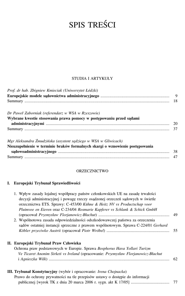 SPIS TREŚCI STUDIA I ARTYKUŁY Prof. dr hab. Zbigniew Kmieciak (Uniwersytet Łódzki) Europejskie modele sa˛downictwa administracyjnego .................................................................... 9 Summary ............................................................................................................................................... 18 Dr Paweł Zaborniak (referendarz w WSA w Rzeszowie) Wybrane kwestie stosowania prawa pomocy w poste˛powaniu przed sa˛dami administracyjnymi .......................................................................................................................... 20 Summary ............................................................................................................................................... 37 Mgr Aleksandra Żmudzińska (asystent se˛dziego w WSA w Gliwicach) Nieuzupełnienie w terminie braków formalnych skargi o wznowienie poste˛powania sa˛dowoadministracyjnego .............................................................................................................. 38 Summary ............................................................................................................................................... 47 ORZECZNICTWO I. Europejski Trybunał Sprawiedliwości 1. Wpływ zasady lojalnej współpracy państw członkowskich UE na zasade˛ trwałości decyzji administracyjnej i powage˛ rzeczy osa˛dzonej orzeczeń sa˛dowych w świetle orzecznictwa ETS. Sprawy: C-453/00 Kühne & Heitz NV vs Productschap voor Pluimvee en Eieren oraz C-234/04 Rosmarie Kapferer vs Schlank & Schick GmbH (opracował Przemysław Florjanowicz-Błachut) ...................................................................... 49 2. Wspólnotowa zasada odpowiedzialności odszkodowawczej państwa za orzeczenia sa˛dów ostatniej instancji sprzeczne z prawem wspólnotowym. Sprawa C-224/01 Gerhard Köbler przeciwko Austrii (opracował Piotr Wróbel) .............................................................. 55 II. Europejski Trybunał Praw Człowieka Ochrona praw podstawowych w Europie. Sprawa Bosphorus Hava Yollari Turizm Ve Ticaret Anonim Sirketi vs Ireland (opracowanie: Przemysław Florjanowicz-Błachut i Agnieszka Wilk) ....................................................................................................................... 62 III. Trybunał Konstytucyjny (wybór i opracowanie: Irena Chojnacka) Prawo do ochrony prywatności na tle przepisów ustawy o doste˛pie do informacji publicznej [wyrok TK z dnia 20 marca 2006 r. sygn. akt K 17/05] ...................................... 77 4 Zeszyty Naukowe Sa˛downictwa Administracyjnego 4–5(7–8)/2006 IV. Sa˛d Najwyższy (wybór i opracowanie: Andrzej Wróbel) Uchwała Sa˛du Najwyższego z dnia 13 lipca 2006 r. (sygn. akt III SZP 3/06) [dot. naruszenia zbiorowych interesów konsumentów] ........................................................... 87 V. Naczelny Sa˛d Administracyjny i wojewódzkie sa˛dy administracyjne A. Postanowienie Naczelnego Sa˛du Administracyjnego z dnia 6 kwietnia 2006 r. (sygn. akt I FSK 785/05) [dot. zbiegu sankcji administracyjnej z odpowiedzialnościa˛ za przeste˛pstwo skarbowe] .............................................................................................................................. B. Orzecznictwo wojewódzkich sa˛dów administracyjnych (wybór i opracowanie: Bogusław Gruszczyński) 1. Wyrok Wojewódzkiego Sa˛du Administracyjnego w Gdańsku z dnia 1 grudnia 2005 r. (sygn. akt II SA/Gd 436/05) ............................................................................................... 2. Wyrok Wojewódzkiego Sa˛du Administracyjnego w Szczecinie z dnia 26 stycznia 2006 r. (sygn. akt II SA/Sz 242/05) ................................................................................... 3. Wyrok Wojewódzkiego Sa˛du Administracyjnego w Szczecinie z dnia 9 lutego 2006 r. (sygn. akt II SA/Sz 1189/04) .............................................................................................. 4. Postanowienie Wojewódzkiego Sa˛du Administracyjnego w Łodzi z dnia 15 lutego 2006 r. (sygn. akt I SA/Łd 1089/05) .................................................................................. 5. Wyrok Wojewódzkiego Sa˛du Administracyjnego w Białymstoku z dnia 8 marca 2006 r. (sygn. akt I SA/Bk 32/06) ...................................................................................... 6. Wyrok Wojewódzkiego Sa˛du Administracyjnego w Bydgoszczy z dnia 5 kwietnia 2006 r. (sygn. akt I SA/Bd 6/06) ........................................................................................ 101 111 122 130 134 144 148 VI. Pytania prawne sa˛dów administracyjnych skierowane do Trybunału Konstytucyjnego (opracowała Irena Chojnacka) 1. Pytanie prawne Naczelnego Sa˛du Administracyjnego [dot. stwierdzenia zgodności przepisów ustawy o rehabilitacji zawodowej i społecznej oraz zatrudnianiu osób niepełnosprawnych z Konstytucja˛] ........................................................................................ 155 2. Pytania prawne wojewódzkich sa˛dów administracyjnych .................................................... 167 VII. Glosy Mgr Paweł Borszowski (Uniwersytet Wrocławski) Glosa do wyroku Naczelnego Sa˛du Administracyjnego z dnia 16 września 2004 r. (sygn. akt FSK 485/04) [dot. różnicowania stawek podatku od nieruchomości w zależności od cech podatnika; naruszenie zasady równości] ................................................................... Mgr Adam Bartosiewicz Mgr Ryszard Kubacki Glosa do postanowienia Wojewódzkiego Sa˛du Administracyjnego w Łodzi z dnia 15 lutego 2006 r. (sygn. akt I SA/Łd 1089/05) [dot. pytania prejudycjalnego do ETS] ...................... Dr Monika Florczak-Wa˛tor (Uniwersytet Jagielloński) Glosa do postanowienia Naczelnego Sa˛du Administracyjnego z dnia 26 listopada 2004 r. (syg. akt GPP 1/04) [dot. przewlekłości poste˛powania] ...