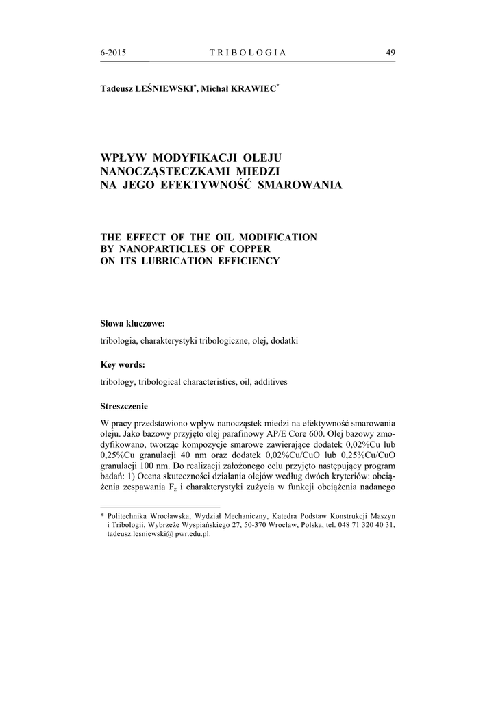 6-2015 TRIBOLOGIA 49 Tadeusz LEŚNIEWSKI, Michał KRAWIEC* WPŁYW MODYFIKACJI OLEJU NANOCZĄSTECZKAMI MIEDZI NA JEGO EFEKTYWNOŚĆ SMAROWANIA THE EFFECT OF THE OIL MODIFICATION BY NANOPARTICLES OF COPPER ON ITS LUBRICATION EFFICIENCY Słowa kluczowe: tribologia, charakterystyki tribologiczne, olej, dodatki Key words: tribology, tribological characteristics, oil, additives Streszczenie W pracy przedstawiono wpływ nanocząstek miedzi na efektywność smarowania oleju. Jako bazowy przyjęto olej parafinowy AP/E Core 600. Olej bazowy zmodyfikowano, tworząc kompozycje smarowe zawierające dodatek 0,02%Cu lub 0,25%Cu granulacji 40 nm oraz dodatek 0,02%Cu/CuO lub 0,25%Cu/CuO granulacji 100 nm. Do realizacji założonego celu przyjęto następujący program badań: 1) Ocena skuteczności działania olejów według dwóch kryteriów: obciążenia zespawania Fz i charakterystyki zużycia w funkcji obciążenia nadanego * Politechnika Wrocławska, Wydział Mechaniczny, Katedra Podstaw Konstrukcji Maszyn i Tribologii, Wybrzeże Wyspiańskiego 27, 50-370 Wrocław, Polska, tel. 048 71 320 40 31, tadeusz.lesniewski@ pwr.edu.pl. 50 TRIBOLOGIA 6-2015 d = f(F), 2) Ocena skuteczności działania dodatków smarnościowych zawartych w oleju na podstawie granicznego obciążenia zużycia Goz/40. Wszystkie badania prowadzone były na standardowym aparacie czterokulowym. Etap pierwszy zrealizowany został z zastosowaniem wytycznych normy PN-76/C-04147 „Badania własności smarnych olejów i smarów”. Na etapie drugim określono graniczne obciążenie zużycia Goz/40, zgodnie z metodyką opisaną w WTWT94/MPS-025. Przyjęto obciążenie 40 daN, czas biegu 3600 s i prędkość obrotową kulki górnej n = 500 obr./min. Im wyższa wartość wskaźnika Goz/40, tym lepsza jest skuteczność badanego środka smarnego w zmniejszaniu zużycia. Testy na każdym etapie i dla każdego punktu pomiarowego były zawsze powtarzane minimum pięciokrotnie. Wyniki opracowano statystycznie przy poziomie ufności 95%, stosując test t-Studenta. WPROWADZENIE Procesy tarcia i zużywania elementów są procesami, których nie można uniknąć. W urządzeniach najniebezpieczniejszy jest proces tarcia powodujący intensywne zużywanie się powierzchni części, objawiające się dużym ubytkiem materiału albo wyraźnym pogorszeniem jakości powierzchni trących. Aby zapobiec negatywnym skutkom tarcia, wykonuje się elementy z coraz lepszych materiałów lub wprowadza między trące powierzchnie tych elementów środki smarne, których zadaniem jest wyeliminowanie lub obniżenie tarcia. Smar zmniejsza opory ruchu przemieszczających się elementów oraz obniża ich zużycie, a poprzez to istotnie wpływa na trwałość maszyny. Środek smarny jest zatem istotnym materiałem konstrukcyjnym, którego wybór do węzła ślizgowego musi być poparty odpowiednimi argumentami wynikającymi z badań doświadczalnych lub wcześniejszych zastosowań praktycznych. Szczególnie istotne jest to w przypadku węzłów pracujących w zakresie tarcia mieszanego. Zagadnieniem zwiększenia odporności materiałów na zużycie oraz obniżenia współczynnika tarcia zajmuje się wielu badaczy. Sposobów podejścia do tych zagadnień jest bardzo dużo. Miedzy innymi autorzy pracy wielokrotnie poruszali już problem wpływu różnych środków smarnych na charakterystyki tribologiczne węzłów trących. W swych pracach wskazywali niejednokrotnie różne sposoby zwiększenia efektywności smarów, m.in. poprzez wprowadzenie do smaru dodatków zwiększających efektywność działania bazowego środka smarnego dzięki wytwarzaniu warstwy granicznej o zwiększonej trwałości, co skutkuje obniżeniem współczynnika tarcia między elementami [L. 1–4]. Od kilku lat powszechnie obecne są nanomateriały i dużo prac badawczych dotyczy prób ich uzyskiwania oraz aplikacji w węzłach trących [L. 5, 6]. Celem poniższych badań była analiza właściwości tribologicznych olejów z dodatkiem nanocząsteczek miedzi, uzyskanych na drodze syntezy plazmowej, podczas stosowania ich do smarowania stalowych węzłów ślizgowych. Do realizacji założonego celu przyjęto następujący program badań: 6-2015 TRIBOLOGIA 51 1. Ocena skuteczności działania dostarczonych olejów według dwóch kryteriów: obciążenia zespawania Fz, charakterystyki zużycia w funkcji obciążenia nadanego d = f(F). 2. Ocena skuteczności działania dodatków smarnościowych zawartych w oleju na podstawie granicznego obciążenia zużycia Goz/40. MATERIAŁY I ICH KRÓTKA CHARAKTERYSTYKA Do badań użyte były materiały: 1. Olej bazowy oznaczony na wykresach jako OB1, na który wybrano olej parafinowy AP/E Core 600; 2. Kompozycje smarowe zawierające: – olej bazowy OB1 z dodatkiem 0,02%Cu granulacji 40 nm, – olej bazowy OB1 z dodatkiem 0,25%Cu granulacji 40 nm, – olej bazowy OB1 z dodatkiem 0,02%Cu/CuO granulacji 100 nm, – olej bazowy OB1 z dodatkiem 0,25%Cu/CuO granulacji 100 nm; 3. Kulki łożyskowe o średnicy 12,7 mm, wykonane ze stali łożyskowej 100Cr6 wykonane w 16 klasie dokładności i grupie wymiarowej S = 0 μm, o chropowatości powierzchni wyrażonej parametrem Ra równej 0,032 m. Twardość kulek użytych w badaniach wynosiła 60±2 HRC. Metoda i warunki badań Wszystkie badania prowadzone były na standardowym aparacie czterokulowym produkcji Instytutu Technologii Eksploatacji w Radomiu. Węzeł tarcia w aparacie czterokulowym przedstawiony modelowo na Rys. 1a tworzyły cztery kulki ułożone w formie czworościanu foremnego. Trzy dolne kulki (2) są nieruchome w uchwycie (4), a czwarta górna (1) jest dociskana do nich pod nadanym obciążeniem F i wprawiana w ruch obrotowy z prędkością n = 1450 obr./min lub n = 500 obr/min. Widok kulek w węźle przedstawia Rys. 1b. W czasie testu dolne kulki (nieruchome) były całkowicie zanurzone w badanym oleju. Etap pierwszy badań zrealizowany został z zastosowaniem wytycznych normy PN-76/C-04147 „Badania własno