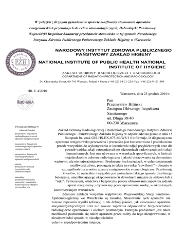 W związku z licznymi pytaniami w sprawie moŜliwości stosowania aparatów rentgenowskich przenośnych do celów stomatologicznych, Dolnośląski Państwowy Wojewódzki Inspektor Sanitarny przedstawia stanowisko w tej sprawie Narodowego Instytutu Zdrowia Publicznego Państwowego Zakładu Higieny w Warszawie. NARODOWY INSTYTUT ZDROWIA PUBLICZNEGO PAŃSTWOWY ZAKŁAD HIGIENY NATIONAL INSTITUTE OF PUBLIC HEALTH NATIONAL INSTITUTE OF HYGIENE ZAKŁAD OCHRONY RADIOLOGICZNEJ I RADIOBIOLOGII OEPARTMENT OF RADlATlON PROTECTION AND RAOIOBIOLOGY 24, Chocimska Street, 00-791 Warsaw, Poland • Phone (+48-22) 54-21-224. Fax (+48-22) 54-21-309 HR-E-4/2010 Warszawa, dnia 23 grudnia 2010 r. Pan Przemysław Biliński Zastępca Głównego Inspektora Sanitarnego ul. Długa 38/40 00-238 Warszawa Posiada akredytacje w zakresie badań - parametrów fizycznych ogólnodiagnostycznych aparatów rentgenowskich - parametrów fizycznych stomatologicznych aparatów rentgenowskich - parametrów fizycznych mammograficznych aparatów rentgenowskich - skaŜeń promieniotwórczych Ŝywności i prób środowiskowych - naturalnej promieniotwórczości surowców, materiałów budowlanych i odpadów przemysłowych Zakład Ochrony Radiologicznej i Radiobiologii Narodowego Instytutu Zdrowia Publicznego - Państwowego Zakładu Higieny w odpowiedzi na pismo z dnia 15 listopada br. znak GIS-HŚ-EX-073-60/WS/1 O informuje, iŜ diagnostyczna aparatura rentgenowska przewoźna i przenośna jest konstruowana i produkowana przede wszystkim do wykonywania w lecznictwie zdjęć przyłóŜkowych oraz dla potrzeb wojska, akcji ratowniczych po zdarzeniach nadzwyczajnych i akcji humanitarnych. Jest ona uŜywana w warunkach specyficznych, w których niejednokrotnie ochrona radiologiczna i jakość obrazowania są elementami waŜnymi, ale nie najwaŜniejszymi. Producenci tych urządzeń, w celu rozszerzenia moŜliwości zbytu, propagują je takŜe na rynku "cywilnym" - obecnie w szczególności przenośne aparaty rentgenowskie stomatologiczne. Przekonują klientów, Ŝe opłacalne i wygodne jest posiadanie takiego aparatu, zasilanego bateryjnie, umoŜliwiającego eksponowanie w dowolnym miejscu ze statywu lub z "ręki". Tymczasem, właściwy i bezpieczny proces obrazowania zapewnia jedynie aparat stacjonarny, uŜytkowany przez uprawnione osoby, w określonych, kontrolowanych warunkach. Zdaniem Zakładu wszystkie wątpliwości Wojewódzkiej Stacji SanitarnoEpidemiologicznej we Wrocławiu są zasadne. Stosowanie tych aparatów nie zawsze zapewnia wyniki (obrazy) o tak dobrej jakości, jak stosowanie aparatów stacjonarnych/jezdnych oraz nie zawsze zapewnia odpowiednie bezpieczeństwo radiologiczne operatorowi i osobom postronnym. Istotnym problemem jest takŜe moŜliwość posłuŜenia się takim aparatem przez osoby do tego nieuprawnione, w nieodpowiedni sposób, w nieodpowiednim celu i w nieodpowiednim miejscu. Oferowane obecnie przenośne stomatologiczne aparaty rentgenowskie wykonują ekspozycje przy prądzie anodowym lampy ok. 2 mA. Stacjonarne aparaty zasilają lampę prądem 7 - 8 mA. Zatem przenośne aparaty wymagają kilkakrotnie dłuŜszych ekspozycji. Niektóre z tych aparatów nie spełniają wymogu § 11 ust. 6 pkt 3 rozporządzenia M.Z. z dnia 21 sierpnia 2006 r. ograniczającego średnicę wiązki do maksimum 6 cm. Aktualnie obowiązujące przepisy § 26 pkt 7 i pkt 8 rozporządzenia M.Z. z dnia 21 sierpnia 2006 r. w sprawie szczegółowych warunków bezpiecznej pracy z urządzeniami radiologicznymi (Dz. L Nr 180, poz. 1325) ograniczają odległość od ogniska lampy rtg do powierzchni skóry pacjenta do minimum 10 cm przy napięciu do 60 kV i do 20 cm przy napięciu powyŜej 60 kV nie informując, do którego przedziału włączona jest wartość graniczna 60 k V. Równocześnie przepisy § 11 ust. 6 pkt 1 i § 63 pkt 2 rozporządzenia M.Z. z dnia 25 sierpnia 2005 r. w sprawie warunków bezpiecznego stosowania promieniowania jonizującego dla wszystkich rodzajów ekspozycji medycznej (Dz. U. Nr 194, poz. 1625) wykluczyły od dnia 1 stycznia 2009 r. moŜliwość stosowania w stomatologii napięć poniŜej 60 kV. Tym samym dopuszczenie odległości mniejszych niŜ 20 cm, które było konieczne dla tych niŜszych napięć przestało obowiązywać. Przy nowelizacji rozporządzenia pkt 7 zostanie usunięty. Tymczasem w niektórych przenośnych aparatach odległość od ogniska do skóry pacjenta jest mniejsza niŜ 20 cm, co jest nawet podkreślane w prospektach jako zgodne z przepisami (a faktycznie było sprawą dyskusyjną). Zwiększenie odległości poprzez dodanie odpowiedniego elementu konstrukcyjnego jest moŜliwe, ale spowoduje to konieczność znacznego wydłuŜenia czasu ekspozycji. U stawianie kierunku promienia centralnego wiązki promieniowania aparatem trzymanym w ręce lub umieszczonym na statywie typu fotograficznego nie zapewnia we wszystkich pozycjach takiej dokładności jak posługiwanie się ramieniem wysięgnika aparatu stacj onarne go/j ezdnego. W projekcie (z 24 listopada br.) nowelizującym rozporządzenie M.Z. w sprawie warunków bezpiecznego stosowania promieniowania jonizującego dla wszystkich rodzajów ekspozycji medycznej w §14, ust. 1, pkt 7 ogranicza się stosowanie przewoźnego i przenośnego sprzętu radiologicznego wyłącznie do przypadków, gdy przybycie pacjenta do stacjonarnego urządzenia radiologicznego jest przeciwwskazane ze względów medycznych. Zapis ten nie przewiduje wykluczeń. A zatem dotyczy takŜe aparatów rentgenowskich stomatologicznych i, jeśli zostanie wprowadzony, będzie kategorycznie i jednoznacznie określał moŜliwości stosowania takich aparatów w ten właśnie sposób. W świetle powyŜszych wyjaśnień nie jest zatem celowe rozwaŜanie warunków stosowania przenośnych rentgenowskich aparatów stomatologicznych w zamian aparatów stacjonarnych/jezdnych. W takich okolicznościach (jako zamienniki) nie mogą być one stosowane. Uzasadnione jest natomiast uŜywanie taki