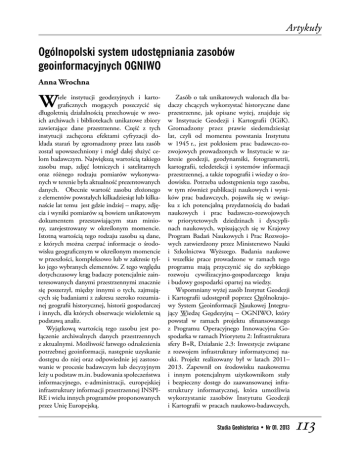 Artykuły Ogólnopolski system udostępniania zasobów geoinformacyjnych OGNIWO Anna Wrochna W iele instytucji geodezyjnych i kartograficznych mogących poszczycić się długoletnią działalnością przechowuje w swoich archiwach i bibliotekach unikatowe zbiory zawierające dane przestrzenne. Część z tych instytucji zachęcona efektami cyfryzacji dokłada starań by zgromadzony przez lata zasób został upowszechniony i mógł dalej służyć celom badawczym. Największą wartością takiego zasobu map, zdjęć lotniczych i satelitarnych oraz różnego rodzaju pomiarów wykonywanych w terenie była aktualność prezentowanych danych. Obecnie wartość zasobu złożonego z elementów powstałych kilkadziesiąt lub kilkanaście lat temu jest gdzie indziej – mapy, zdjęcia i wyniki pomiarów są bowiem unikatowym dokumentem przestawiającym stan miniony, zarejestrowany w określonym momencie. Istotną wartością tego rodzaju zasobu są dane, z których można czerpać informacje o środowisku geograficznym w określonym momencie w przeszłości, kompleksowo lub w zakresie tylko jego wybranych elementów. Z tego względu dotychczasowy krąg badaczy potencjalnie zainteresowanych danymi przestrzennymi znacznie się poszerzył, między innymi o tych, zajmujących się badaniami z zakresu szeroko rozumianej geografii historycznej, historii gospodarczej i innych, dla których obserwacje wieloletnie są podstawą analiz. Wyjątkową wartością tego zasobu jest połączenie archiwalnych danych przestrzennych z aktualnymi. Możliwość łatwego odnalezienia potrzebnej geoinformacji, następnie uzyskanie dostępu do niej oraz odpowiednie jej zastosowanie w procesie badawczym lub decyzyjnym leży u podstaw m.in. budowania społeczeństwa informacyjnego, e-administracji, europejskiej infrastruktury informacji przestrzennej INSPIRE i wielu innych programów proponowanych przez Unię Europejską. Zasób o tak unikatowych walorach dla badaczy chcących wykorzystać historyczne dane przestrzenne, jak opisane wyżej, znajduje się w Instytucie Geodezji i Kartografii (IGiK). Gromadzony przez prawie siedemdziesiąt lat, czyli od momentu powstania Instytutu w 1945 r., jest pokłosiem prac badawczo-rozwojowych prowadzonych w Instytucie w zakresie geodezji, geodynamiki, fotogrametrii, kartografii, teledetekcji i systemów informacji przestrzennej, a także topografii i wiedzy o środowisku. Potrzeba udostępnienia tego zasobu, w tym również publikacji naukowych i wyników prac badawczych, pojawiła się w związku z ich potencjalną przydatnością do badań naukowych i prac badawczo-rozwojowych w priorytetowych dziedzinach i dyscyplinach naukowych, wpisujących się w Krajowy Program Badań Naukowych i Prac Rozwojowych zatwierdzony przez Ministerstwo Nauki i Szkolnictwa Wyższego. Badania naukowe i wszelkie prace prowadzone w ramach tego programu mają przyczynić się do szybkiego rozwoju cywilizacyjno-gospodarczego kraju i budowy gospodarki opartej na wiedzy. Wspomniany wyżej zasób Instytut Geodezji i Kartografii udostępnił poprzez Ogólnokrajowy System Geoinformacji Naukowej Integrujący Wiedzę Geodezyjną – OGNIWO, który powstał w ramach projektu sfinansowanego z Programu Operacyjnego Innowacyjna Gospodarka w ramach Priorytetu 2: Infrastruktura sfery B+R, Działanie 2.3: Inwestycje związane z rozwojem infrastruktury informatycznej nauki. Projekt realizowany był w latach 2011– 2013. Zapewnił on środowisku naukowemu i innym potencjalnym użytkownikom stały i bezpieczny dostęp do zaawansowanej infrastruktury informatycznej, która umożliwia wykorzystanie zasobów Instytutu Geodezji i Kartografii w pracach naukowo-badawczych, Studia Geohistorica • Nr 01. 2013 113 Artykuły Anna Wrochna między innymi do prowadzenia badań naukowych z zastosowaniem technologii społeczeństwa informacyjnego, a także do celów gospodarczych, edukacyjnych itp. System OGNIWO łączy przede wszystkim użytkownika cyfrowych zasobów geoinformacyjnych z danymi zasobu za pośrednictwem usług sieciowych danych przestrzennych, a ponadto również zasoby geoprzestrzenne z infrastrukturami geoinformacyjnymi o zasięgu regionalnym, krajowym i międzynarodowym. Usługi danych przestrzennych są dostępne dla wszystkich uprawnionych użytkowników, którymi są: instytuty naukowe i badawczo-rozwojowe, placówki edukacyj- mi użytkownikami danych przestrzennych udostępnianych poprzez omawiany system są badacze zajmujący się między innymi takimi dziedzinami wiedzy, jak: rolnictwo, leśnictwo, geologia, górnictwo, ochrona środowiska, planowanie przestrzenne, transport, telekomunikacja, nawigacja, turystyka, ale również obronność i zarządzanie kryzysowe. Dostęp do danych nie wymaga od użytkownika posiadania specjalistycznego oprogramowania typu GIS, gdyż uzyskiwany on jest za pomocą typowej przeglądarki www. Zasoby informacyjne udostępnione przez Instytut Geodezji i Kartografii obejmują terytorium całego kraju lub jego wybrane obszary, są Przykład elektronicznej formy prezentacji zasobów geoinformacyjnych Instytutu Geodezji i Kartografii w Warszawie udostępnianych użytkownikom w ramach funkcjonowania systemu OGNIWO ne, przedsiębiorcy, w tym inwestorzy krajowi i zagraniczni, administracja publiczna oraz użytkownicy indywidualni. Usługi danych przestrzennych są świadczone przez całą dobę z wykorzystaniem sieci Internet jako głównego medium komunikacyjnego. Potencjalny- 114 Studia Geohistorica • Nr 01. 2013 – jak wspomniano wyżej – w formie map, zdjęć lotniczych, w tym wykonanych w technikach specjalnych oraz zdjęć satelitarnych pozyskiwanych przez satelity środowiskowe, a także ich przetworzenia do postaci zbiorów tematycznych charakteryzujących stan powierzchni Ziemi. Ogólnopolski system udostępniania zasobów geoinformacyjnych OGNIWO W celu łatwiejszego korzystania z zasobu uporządkowano go dzieląc na kilka grup: − zasoby publikacji naukowych z zakresu fotog