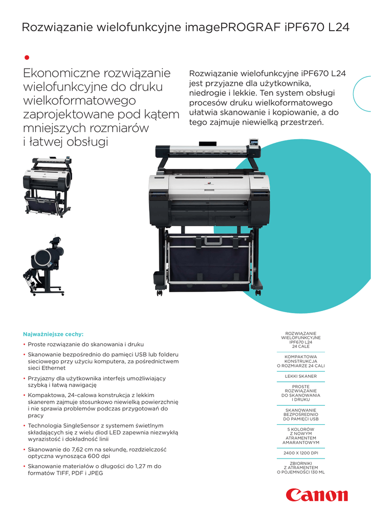 Rozwiązanie wielofunkcyjne imagePROGRAF iPF670 L24 • Ekonomiczne rozwiązanie wielofunkcyjne do druku wielkoformatowego zaprojektowane pod kątem mniejszych rozmiarów i łatwej obsługi Najważniejsze cechy: • Proste rozwiązanie do skanowania i druku • Skanowanie bezpośrednio do pamięci USB lub folderu sieciowego przy użyciu komputera, za pośrednictwem sieci Ethernet • Przyjazny dla użytkownika interfejs umożliwiający szybką i łatwą nawigację • Kompaktowa, 24-calowa konstrukcja z lekkim skanerem zajmuje stosunkowo niewielką powierzchnię i nie sprawia problemów podczas przygotowań do pracy • Technologia SingleSensor z systemem świetlnym składających się z wielu diod LED zapewnia niezwykłą wyrazistość i dokładność linii • Skanowanie do 7,62 cm na sekundę, rozdzielczość optyczna wynosząca 600 dpi • Skanowanie materiałów o długości do 1,27 m do formatów TIFF, PDF i JPEG Rozwiązanie wielofunkcyjne iPF670 L24 jest przyjazne dla użytkownika, niedrogie i lekkie. Ten system obsługi procesów druku wielkoformatowego ułatwia skanowanie i kopiowanie, a do tego zajmuje niewielką przestrzeń. ROZWIĄZANIE WIELOFUNKCYJNE IPF670 L24 24 CALE KOMPAKTOWA KONSTRUKCJA O ROZMIARZE 24 CALI LEKKI SKANER PROSTE ROZWIĄZANIE DO SKANOWANIA I DRUKU SKANOWANIE BEZPOŚREDNIO DO PAMIĘCI USB 5 KOLORÓW Z NOWYM ATRAMENTEM AMARANTOWYM 2400 X 1200 DPI ZBIORNIKI Z ATRAMENTEM O POJEMNOŚCI 130 ML Rozwiązanie wielofunkcyjne imagePROGRAF iPF670 L24 • Dane techniczne SKANER DRUKARKA Technologia SingleSensor z systemem świetlnym składającym się z wielu diod LED Szybkość skanowania KOPIOWANIE 300 / 300 dpi w jakości roboczej = 2,54 cm/s w kolorze, 7,62 cm/s w czerni i bieli 300 / 600 dpi w jakości standardowej = 2,54 cm/s w kolorze, 7,62 cm/s w czerni i bieli 600 / 600 dpi w najwyższej jakości = 1,27 cm/s w kolorze, 3,81 cm/s w czerni i bieli SKANOWANIE 200 dpi w jakości roboczej = 2,54 cm/s w kolorze, 7,62 cm/s w czerni i bieli 400 dpi w jakości standardowej = 1,27 cm/s w kolorze, 3,81 cm/s w czerni i bieli 600 dpi w najwyższej jakości = 0,84 cm/s w kolorze, 2,54 cm/s w czerni i bieli Typ drukarki 5-kolorowa — 609,6 mm (24”) Technologia druku Canon Bubblejet na żądanie, 6 zintegrowanych kolorów (15,24 cm na głowicę drukującą x 1 głowica drukująca) Liczba dysz Łącznie: 15 360 MBK: 5120 dysz C, M, Y, BK: 2560 dysz na każdy kolor Rozdzielczość drukowania 2400 x 1200 dpi Odstępy dysz 1200 dpi x 2, obejmuje system wykrywania i kompensacji niedziałających dysz Gwarantowana minimalna szerokość linii 0,02 mm Dokładność linii ±0,1% lub mniej Wielkość kropli atramentu 4 pikolitry na kolor Pojemność zbiorników atramentu Atrament startowy: C, M, Y, Bk, MBk 90 ml Zbiorniki dostępne w sprzedaży: C, M, Y, Bk, MBK 130 ml Rodzaj atramentu Reaktywny atrament barwnikowy/pigmentowy: Cyan (cyjan), Magenta (amarantowy), Yellow (żółty), Black (czarny) Atrament pigmentowy: 2 x Matte Black (matowa czerń) Kompatybilność drukarki z systemami operacyjnymi Windows 32-bitowy — XP, Vista, 7, 8, 8.1 i 10 Server 2003 / 2003 R2, Server 2008 Windows 64-bitowy — Vista, 7, 8, 8.1 i 10 Server 2003 / 2003 R2, Server 2008 / 2008 R2, Server 2012 / 2012 R2 Mac: OSX 10.6.8–10.10.x Języki drukarki GARO (język graficzny z operacjami rastrowymi), HP-GL/2, HP RTL Standardowe złącza USB 2.0 High-Speed IEEE 802.3 10base-T IEEE 802.3u 100base-TX/automatyczne negocjowanie IEEE 802.3ab 1000base-T/automatyczne negocjowanie IEEE 802.3x pełny dupleks IEEE 802.3az EEE Standardowa pojemność pamięci 256 MB Szerokość nośnika Papier w rolce: 10”/254 mm–24”/609,6 mm Arkusz cięty: 8”/203,2 mm–24”/609,6 mm Grubość nośnika Rolka: 0,07–0,8 mm Ładowanie od góry, podawanie ręczne: 0,07–0,8 mm Maksymalna długość wydruku Rolka: 18 m (w zależności od systemu operacyjnego i aplikacji) Arkusz: 1,6 m Tryby skanowania Skanowanie do pamięci USB — RGB, skala szarości, TIFF Skanowanie do komputera połączonego z siecią — RGB / skala szarości / czarno-białe, Tiff, Jpeg, PDF, TIFF-G4 Dokładność skanowania 0,2% +/-1 piksel Rozdzielczość Maksymalna: 600 dpi, optyczna 600 dpi Maksymalna szerokość obrazu 24”/609,6 mm Maksymalna szerokość nośnika 26”/660,4 mm Maksymalna długość skanowania 50”/1270 mm Maksymalna i minimalna grubość nośnika Min. = 0,07 mm Maks. = 0,5 mm Interfejs panelu sterowania Wyświetlacz o przekątnej 3” (niedotykowy). Przyciski Home (Ekran główny), Left (W lewo), OK, Right (W prawo), Start (Rozpocznij), Stop (Zatrzymaj), Back (Wstecz), Paper Eject (Wysunięcie papieru). Dioda LED stanu Złącze skanera Ethernet 10 / 100 / 1000 Base-T / TX Skanowanie do pamięci USB USB2, 128 GB FAT32. Skanowanie do komputera sieciowego — program L Scan App Ustawia katalog skanowania i typ pliku. Kompatybilność z systemami operacyjnymi: Windows 7, 8, 8.1 & 10 (32-/64-bitowy) Dołączone oprogramowanie Program L Scan App Języki: angielski, francuski, niemiecki, włoski, hiszpański, rosyjski, portugalski, czeski, polski Wymiary fizyczne (szer. x głęb. x wys.) i waga (kg) Skaner: 935 x 193 x 131 mm (szer. x głęb. x wys.) Waga: 5,36 kg bez prowadnicy powrotnej dokumentów, podajnik papieru złożony Zewnętrzne źródło zasilania Wejście: 100–240 V, 10240V, 50/60 Hz Wyjście: 3,42 A przy 19 V Środowisko pracy Temperatura: 10–30°C Wilgotność: 10–90% Uwaga 2 W przypadku trybu skanowania do USB i kopiowania najpierw należy zeskanować oryginał do pamięci wewnętrznej, a następnie wysłać dane do pamięci USB lub do drukarki. Czas skanowania do pamięci USB będzie różnił się w zależności od używanych pamięci USB. Zużycie energii skanera Tryb gotowości (uśpienia): 0,05 W Urządzenie bezczynne: 10,20 W Skanowanie: 19,40 W Uwaga 3 S kanowanie do komputera sieciowego powoduje skanowanie bezpośrednio do sieci, więc specyfikacja komputera musi być wystarczająca do obsługi dużych il