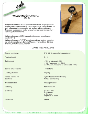 WILGOTNOŚCIOMIERZ HIT 3 Wilgotnościomierz "HIT3 " jest elektronicznym przyrządem do pomiaru wilgotności drewna. Jego zasadniczą cechą jest to, że cały wilgotnościomierz mieści się w elektrodzie młotkowej. Przyrząd wyposażony jest w układy kompensacji temperatury i wyboru gatunku drewna. Wilgotnościomierz HIT3 zastąpił dotychczas produkowany model HIT2 Wilgotnościomierz "HIT2" został nagrodzony złotym medalem na Międzynarodowym Salonie Maszyn i Narzędzi do Obróbki Drewna, DREMA 2002, Poznań. DANE TECHNICZNE Zakres pomiarowy 6 % 60 % wigotności bezwzg lędnej Rozdzielczość 0.1 % Dokładność +/1% (w zakresie 612% +/2% (w zakresie 13 28%) ok. 10% wart. mierzonej (w zakresie 29 6 0%) Zakres temp. d rewna 10 do 50°C Liczba gatunków 1 2 (270) Rodzaj wskaźnika Zasilanie wyświetlacz ciekłokrystaliczn y 1x 12V (bateria 23A) Trwałość baterii 1 0.000 pomiarów Gabaryty 180x80x42 mm Elektrody φ 3.5x12 mm φ 2.5x8 mm φ 2x6 mm dotykowe do oklein Producent TANEL tel.kom.: +48 504 175 823 tel./fax: (077) 436 55 02 email: [email protected] internet: www.edo.biz.pl