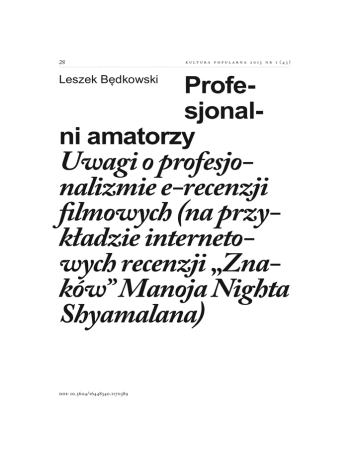 28 kultura popularna 2015 nr 1 (43) 3URIH VMRQDO QLDPDWRU]\ /HV]HN%ĊGNRZVNL Uwagi o profesjonalizmie e-recenzji filmowych (na przykładzie internetowych recenzji „Znaków” Manoja Nighta Shyamalana) DOI: 10.5604/16448340.1170389 Leszek Będkowski Profesjonalni amatorzy Podjęte tu rozważania odsyłają wprawdzie już w tytule do szerokiego zagadnienia profesjonalizmu i profesjonalizacji w dziennikarstwie, nie jest ono jednak ich zasadniczym przedmiotem. W artykule ograniczam się do rozważenia kwestii profesjonalizmu e-recenzji filmowej i spojrzenia w tym kontekście na recenzje Znaków (USA, 2002) zamieszczone na stronach serwisów internetowych poświęconych filmowi 1. Zaznaczam, że pojęcia „profesjonalizm” używam wyłącznie jako synonimu fachowości i kompetencji niekoniecznie związanych z wykonywanym zawodem czy posiadanym wykształceniem. Wynika stąd subiektywizm proponowanego namysłu nad recenzją internetową. Trudno przecież rozpatrywać jej kondycję wyłącznie w oparciu o ustalenia normatywne, niekiedy bardzo szczegółowe, odnoszące się do warsztatu recenzenta (por. Wolny-Zmorzyński, Kaliszewski, Furman, 2006: 97–99), bez uwzględnienia uwarunkowań dziennikarstwa społecznościowego, oczekiwań współczesnych odbiorców tekstów medialnych czy poziomu kompetencji komunikacyjnych społeczeństwa (funkcjonalny analfabetyzm). Również świadomość odmienności aktualizacji tekstowych abstrakcyjnego wzorca recenzji nie skłania do uszczegółowienia jej wyróżników gatunkowych, które przesądzałyby o uznaniu danego tekstu bądź nie za recenzję stricte dziennikarską. Nie tyle ze względu na cenną niepowtarzalność każdej wypowiedzi realizującej dany gatunek mowy, ile z uwagi na znaczną „strefę autorskiej wolności” (Kurek, 1996: 76) tradycyjnie przyznawaną recenzentom oraz problematyczność prób różnicowania powinności recenzenta i krytyka. Wątpliwości nie będzie budzić usytuowanie recenzji dziennikarskiej w obrębie gatunków publicystycznych (Wolny-Zmorzyński, Kaliszewski, Furman, 2006; referendum pokaże, „kogo interesuje Polska, a kogo partykularny interes”. Bauer, 2000), chociaż znajdziemy też propozycje odmienne (Wojtak, 2004), niemające wszakże wpływu na wyróżnianie typologicznych cech wzorca recenzji. Określając go, zmuszeni jesteśmy poprzestać na stwierdzeniu, że recenzją jest tekst zawierający, jako dominantę, omówienie oraz ocenę tekstu kultury objętego prawem autorskim w rozumieniu ustawy o prawie autorskim. Warto zauważyć, że w fachowych opracowaniach dotyczących gatunków dziennikarskich recenzji nie poświęca się zbyt wiele miejsca, w niektórych nie jest ona omawiana, niekiedy nawet nie wymienia się jej w załączonych indeksach czy słownikach terminów (por.: Fras, 2005; Wojtak, 2008). Przyczyną nieobecności recenzji może być uznawanie jej za społecznie mało znaczący lub dobrze rozpoznany i zarazem łatwo rozpoznawalny gatunek dziennikarskiej publicystyki. Przypomnijmy też, że umiejętność pisemnego recenzowania tekstów kultury jest kształtowana już w pierwszych latach edukacji szkolnej, zaś nowa podstawa programowa z języka polskiego jednoznacznie wiąże redagowanie recenzji z wymaganiami maturalnymi na poziomie podstawowym. Dlaczego zatem napisanie dobrej recenzji jest postrzegane jako prawdziwa sztuka? Czy uniknięcie warsztatowych błędów recenzenta, przed którymi przestrzegają autorzy hasła „recenzja” zamieszczonego w Wikipedii (skądinąd dobrze opracowanego), gwarantuje, że otrzymamy profesjonalną recenzję? Wreszcie, na ile nowe media zmieniają nasze postrzeganie abstrakcyjnego wzorca tego gatunku i pojęcie fachowości recenzji? 1 W tekście artykułu posługuję się (podanymi w kwadratowych nawiasach) inicjałami imion i nazwisk autorów cytowanych i przywoływanych e-recenzji, zgodnie z informacją podaną w nocie bibliograficznej. Odwołuję się również do recenzji internautów, zamieszczonych na stronie http://film.wp.pl/id,1987,title,Znaki,film_recenzje_internautow.html (20. 03. 2014), podając w nawiasie podpis autora i tytuł recenzji, z zachowaniem oryginalnej pisowni. 29 /HV]HN%ĊGNRZVNL± 8URG]RQ\ZURNX /LWHUDWXUR]QDZFDGRNWRU QDXNKXPDQLVW\F]Q\FK DGLXQNWZ,QVW\WXFLH )LORORJLL3ROVNLHM$NDGHPLLLP-DQD'áXJRV]D Z&]ĊVWRFKRZLH -HJR]DLQWHUHVRZDQLD EDGDZF]HWROLWHUDWXUD polska XX wieku i najQRZV]D]HV]F]HJyOQ\P XZ]JOĊGQLHQLHPOLWHUDWXU\ SRSXODUQHM]ZáDV]F]D UyĪQ\FKRGPLDQV]HURNRSRMĊWHMIDQWDVW\NL 3U]HGPLRWHPEDGDĔMHVW NRPXQLNDFMDOLWHUDFND RUD]VSRáHF]QHNRQWHNVW\ WZyUF]RĞFLOLWHUDFNLHM :NUĊJX]DLQWHUHVRZDĔ EDGDZF]\FKSR]RVWDMH WDNĪH]DJDGQLHQLH JDWXQNyZG]LHQQLNDUVNLFKRUD]SHUVZD]\MQHJRRGG]LDá\ZDQLD Z\SRZLHG]LPHGLDOQ\FK LOLWHUDWXU\QDRGELRUFyZ $XWRUPRQRJUD¿L:SRV]XNLZDQLXSUDZG\=QLHZRORQHVSRáHF]HĔVWZD ZSRZLHĞFLDFKVFLHQFH ¿FWLRQ-DQXV]D$=DMGOD, :DUV]DZD OHV]HNEHGNRZVNL#ZSSO 30 kultura popularna 2015 nr 1 (43) Powyższe uwagi i pytania w pełni odnoszą się do e-recenzji filmowej, przy czym informacji o niej możemy nie znaleźć w pracach omawiających dziennikarskie gatunki internetowe (Olszański, 2006; Wolny-Zmorzyński, Furman, 2010). Nie dziwi to o tyle, że recenzje filmów zamieszczone w sieci nie reprezentują ani nowego gatunku dziennikarskiego, ani gatunku internetowego, uwagę zwraca także przekonanie badaczy o niewielkim współcześnie znaczeniu podziału gatunków na typy ze względu na prymarne medium publikacji (Fras, 2012: 25). Niewątpliwie odmienność wielu e-recenzji dzieł filmowych od recenzji filmów drukowanych w prasie jest wyraźnie dostrzegalna, nie wynika jednak z podważenia wymienionych wcześniej ogólnych, konstytutywnych cech recenzji (omówienie i ocena dzieła) oraz przypisywanych jej celów (funkcji), które z owych cech zawsze w jakimś stopniu dają się wyprowadzić. Co więcej, e-recenzja nie unieważnia również znaczenia słowa pisanego jako najistotniejszego kodu wypowiedzi recenzenta. Pozostaje o