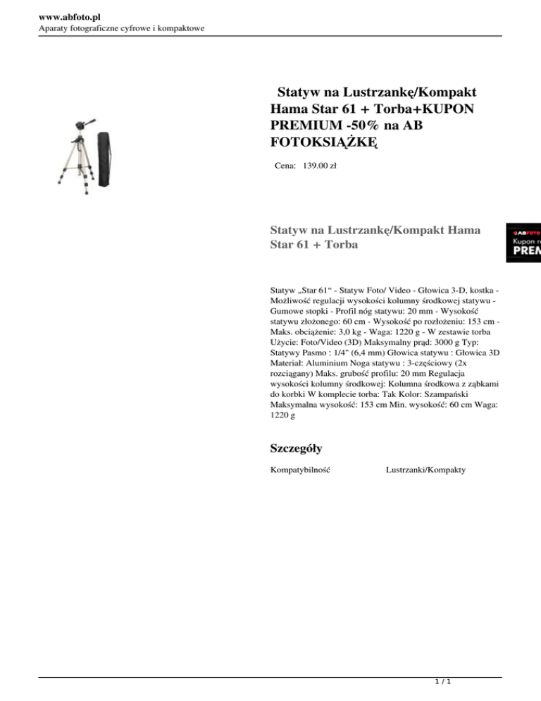 www.abfoto.pl Aparaty fotograficzne cyfrowe i kompaktowe Statyw na Lustrzankę/Kompakt Hama Star 61 + Torba+KUPON PREMIUM -50% na AB FOTOKSIĄŻKĘ Cena: 139.00 zł Statyw na Lustrzankę/Kompakt Hama Star 61 + Torba Statyw „Star 61“ - Statyw Foto/ Video - Głowica 3-D, kostka Możliwość regulacji wysokości kolumny środkowej statywu Gumowe stopki - Profil nóg statywu: 20 mm - Wysokość statywu złożonego: 60 cm - Wysokość po rozłożeniu: 153 cm Maks. obciążenie: 3,0 kg - Waga: 1220 g - W zestawie torba Użycie: Foto/Video (3D) Maksymalny prąd: 3000 g Typ: Statywy Pasmo : 1/4" (6,4 mm) Głowica statywu : Głowica 3D Materiał: Aluminium Noga statywu : 3-częściowy (2x rozciągany) Maks. grubość profilu: 20 mm Regulacja wysokości kolumny środkowej: Kolumna środkowa z ząbkami do korbki W komplecie torba: Tak Kolor: Szampański Maksymalna wysokość: 153 cm Min. wysokość: 60 cm Waga: 1220 g Szczegóły Kompatybilność Lustrzanki/Kompakty 1/1 Powered by TCPDF (www.tcpdf.org)