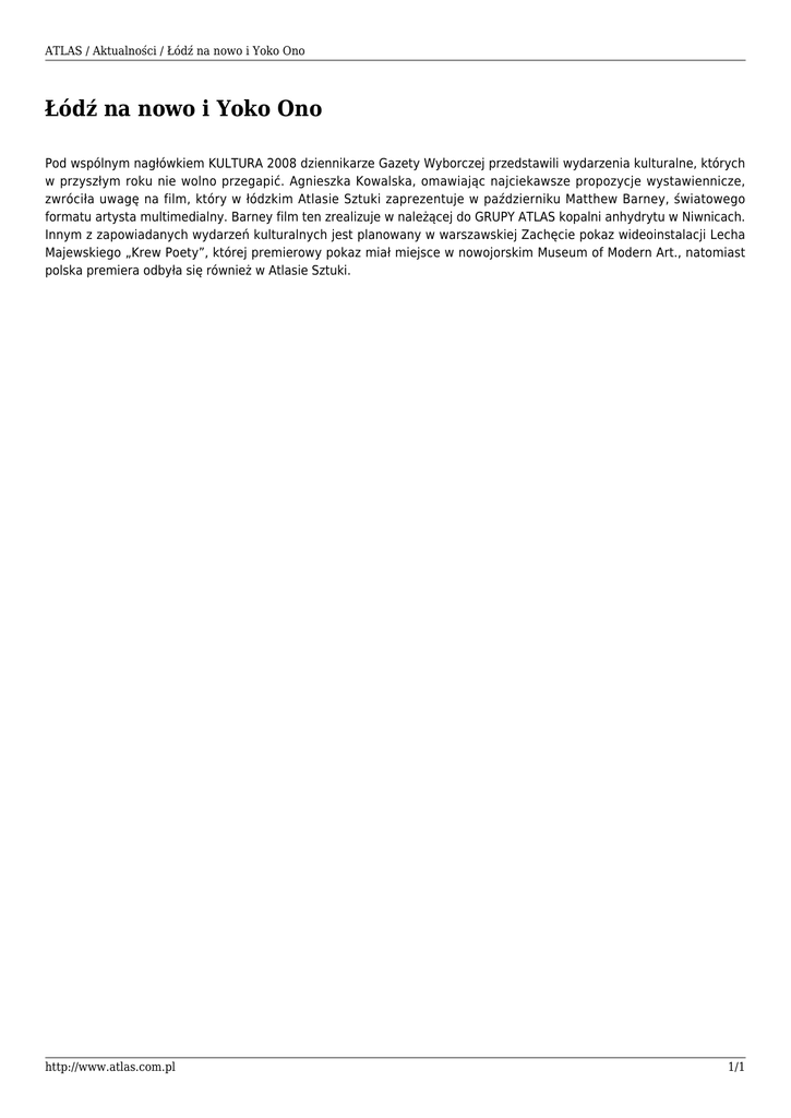 ATLAS / Aktualności / Łódź na nowo i Yoko Ono Łódź na nowo i Yoko Ono Pod wspólnym nagłówkiem KULTURA 2008 dziennikarze Gazety Wyborczej przedstawili wydarzenia kulturalne, których w przyszłym roku nie wolno przegapić. Agnieszka Kowalska, omawiając najciekawsze propozycje wystawiennicze, zwróciła uwagę na film, który w łódzkim Atlasie Sztuki zaprezentuje w październiku Matthew Barney, światowego formatu artysta multimedialny. Barney film ten zrealizuje w należącej do GRUPY ATLAS kopalni anhydrytu w Niwnicach. Innym z zapowiadanych wydarzeń kulturalnych jest planowany w warszawskiej Zachęcie pokaz wideoinstalacji Lecha Majewskiego „Krew Poety”, której premierowy pokaz miał miejsce w nowojorskim Museum of Modern Art., natomiast polska premiera odbyła się również w Atlasie Sztuki. http://www.atlas.com.pl 1/1