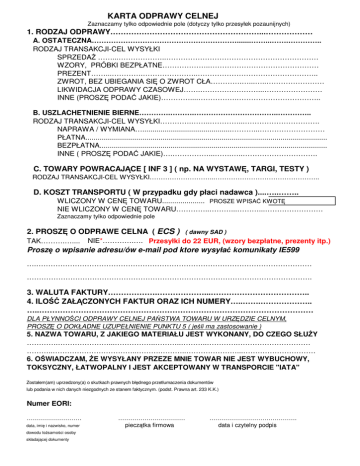 KARTA ODPRAWY CELNEJ Zaznaczamy tylko odpowiednie pole (dotyczy tylko przesyłek pozaunijnych) 1. RODZAJ ODPRAWY…………………………………………………...……………… A. OSTATECZNA…………………………………………………….......……...…….………….. RODZAJ TRANSAKCJI-CEL WYSYŁKI SPRZEDAŻ ……...………………..……………………………………………………… WZORY, PRÓBKI BEZPŁATNE………………..……………………………………… PREZENT……...………….…………………..………………………………………….. ZWROT, BEZ UBIEGANIA SIĘ O ZWROT CŁA………….…...…..…………………… LIKWIDACJA ODPRAWY CZASOWEJ…….……………………...…………………… INNE (PROSZĘ PODAĆ JAKIE)…………....…………….…………………………….. B. USZLACHETNIENIE BIERNE………….……….……………………………..………….. RODZAJ TRANSAKCJI-CEL WYSYŁKI………….……..…………...…………………………. NAPRAWA / WYMIANA…............................................………...……………………… PŁATNA....................................................................................................................... BEZPŁATNA................................................................................................................ INNE ( PROSZĘ PODAĆ JAKIE)….……………...…….…..…………………………. C. TOWARY POWRACAJĄCE [ INF 3 ] ( np. NA WYSTAWĘ, TARGI, TESTY ) RODZAJ TRANSAKCJI-CEL WYSYŁKI………………………...……………………………………….. D. KOSZT TRANSPORTU ( W przypadku gdy płaci nadawca )....…..…….. WLICZONY W CENĘ TOWARU..................... PROSZE WPISAĆ KWOTĘ NIE WLICZONY W CENĘ TOWARU…………..………...………...…………………… Zaznaczamy tylko odpowiednie pole 2. PROSZĘ O ODPRAWE CELNA ( ECS ) TAK……….….... ( dawny SAD ) NIE*………….…. Przesyłki do 22 EUR, (wzory bezpłatne, prezenty itp.) Proszę o wpisanie adresu/ów e-mail pod ktore wysyłać komunikaty IE599 ….…………………………………………………………………………………………………… ………………………………………………………………………………………………………. 3. WALUTA FAKTURY……………….………………...……………………………….. 4. ILOŚĆ ZAŁĄCZONYCH FAKTUR ORAZ ICH NUMERY…..…….……………….. …..…………………………………………………………………………………………… DLA PŁYNNOŚCI ODPRAWY CELNEJ PAŃSTWA TOWARU W URZĘDZIE CELNYM, PROSZĘ O DOKŁADNE UZUPEŁNIENIE PUNKTU 5 ( jeśli ma zastosowanie ) 5. NAZWA TOWARU, Z JAKIEGO MATERIAŁU JEST WYKONANY, DO CZEGO SŁUŻY ………….…………………...……………..………..………..………….………………………… ………..……………………………..……….………..…………………...………………………… 6. OŚWIADCZAM, ŻE WYSYŁANY PRZEZE MNIE TOWAR NIE JEST WYBUCHOWY, TOKSYCZNY, ŁATWOPALNY I JEST AKCEPTOWANY W TRANSPORCIE "IATA" Zostałem(am) uprzedzony(a) o skutkach prawnych błędnego przetłumaczenia dokumentów lub podania w nich danych niezgodnych ze stanem faktycznym. (podst. Prawna art. 233 K.K.) Numer EORI: ……………………… data, imię i nazwisko, numer dowodu tożsamości osoby składającej dokumenty …………………………… pieczątka firmowa ……………………………………. data i czytelny podpis