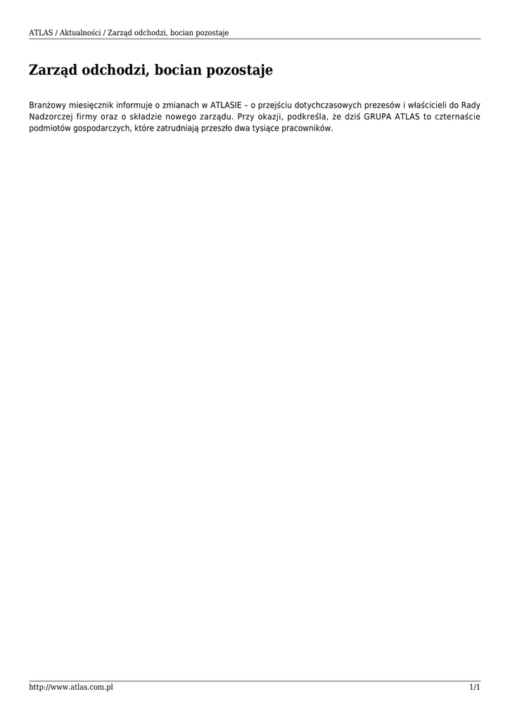 ATLAS / Aktualności / Zarząd odchodzi, bocian pozostaje Zarząd odchodzi, bocian pozostaje Branżowy miesięcznik informuje o zmianach w ATLASIE – o przejściu dotychczasowych prezesów i właścicieli do Rady Nadzorczej firmy oraz o składzie nowego zarządu. Przy okazji, podkreśla, że dziś GRUPA ATLAS to czternaście podmiotów gospodarczych, które zatrudniają przeszło dwa tysiące pracowników. http://www.atlas.com.pl 1/1