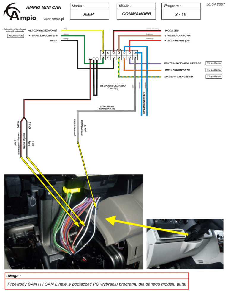 Marka : AMPIO MINI CAN JEEP Model : Program : COMMANDER 30.04.2007 2 - 10 www.ampio.pl Zainstalować i podłączyć WŁĄCZNIKI DRZWIOWE włącznik pod maską +12V PO ZAPŁONIE (15) Nie podłączać żółty czarno-czerwony zielony brązowy czarny czerwony DIODA LED MASA SYRENA ALARMOWA +12V ZASILANIE (30) CENTRALNY ZAMEK OTWÓRZ IMPULS KOMFORTU Nie podłączać MASA PO ZAŁĄCZENIU Nie podłączać czarna wtyczka pin 16 granatowo-biały biały pin 7 czarna wtyczka BLOKADA ODJAZDU (rozciąć) pin 6 biało-pomarańczowy Nie podłączać Uwaga : Przewody CAN H i CAN L należy podłączać PO wybraniu programu dla danego modelu auta!