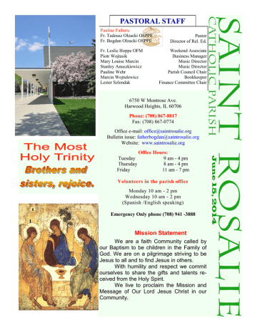 PASTORAL STAFF Pauline Fathers: Fr. Tadeusz Olzacki OSPPE Fr. Bogdan Olzacki OSPPE Fr. Leslie Hoppe OFM Piotr Wojtasik Mary Louise Marcin Stanley Anuszkiewicz Pauline Wehr Marcin Wojtulewicz Lester Szlendak Pastor Director of Rel. Ed. Weekend Associate Business Manager Music Director Music Director Parish Council Chair Bookkeeper Finance Committee Chair 6750 W Montrose Ave. Harwood Heights, IL 60706 Phone: (708) 867-8817 Fax: (708) 867-0774 Office e-mail: [email protected] Bulletin issue: [email protected] Website: www.saintrosalie.org Office Hours: 9 am - 4 pm 8 am - 4 pm 11 am - 7 pm Volunteers in the parish office Monday 10 am - 2 pm Wednesday 10 am - 2 pm (Spanish /English speaking) Emergency Only phone (708) 941 -3888 Mission Statement We are a faith Community called by our Baptism to be children in the Family of God. We are on a pilgrimage striving to be Jesus to all and to find Jesus in others. With humility and respect we commit ourselves to share the gifts and talents received from the Holy Spirit. We live to proclaim the Mission and Message of Our Lord Jesus Christ in our Community. June 15, 2014 Tuesday Thursday Friday St. Rosalie As a community, let us pray for all those who serve our Country Kurt Beyer SPEC. 1st CLASS, ARMY Darryl Guzman PFC ARMY Ryan James Bigoness SGT USMC Michael Rivera ARMY John Velez US AIR FORCE Brian Talarico LCPL USMC Aurora Talarico……...LCPL USMC Matt Skiba Airborne Infantryman Benjamin Juhasz S/SGT USMC May God protect them and return them safely to their families. *** Do You Dream of being a Teacher? St. Rosalie Religious Education is looking for dedicated adults and teens to teach and aide on Sunday mornings for 2014-2015 session. If you are interested please contact Fr. Bogdan Olzacki or Maria Jacobsen at 708-867-8817. 2 WEEKLY COLLECTION The Stewardship Report for Friendly reminders Please arrive June 8, 2014 on time and stay for the entire Mass (“Only one Weekly Offertory: $4,419.35 person left the Last Supper Weekly Offertory Budgeted: early ... ”), genuflect toward $6,000.00 the Blessed Sacrament, join in Weekly Difference: the singing, listen to the read-$1,580.65 For Retired. Priests ing, prepare properly for holy $1,869.00 Communion and avoid “chitThank you for your generos- chat which distracts others ity & all you do for Saint who are connecting with God Rosalie Parish in your through prayer before Mass.” bequests. BAPTISMS: Baptisms are celebrated on the first Sunday of the month. Parents are required to participate in the preparation meeting before the date is scheduled. Please call the office for an appointment. Required Documents: Birth certificate of the child, proof of catholic parish membership (for at least 6 months) for both parents as well as sponsors. WEDDINGS: The Archdiocese of Chicago requires arrangements for weddings be made 6 months in advance. Please call the office for an appointment. Required Documents: Baptismal certificates for the engaged, proof of membership to a catholic parish (for at least 6 months) for both bride and groom, proof of completion of Pre-Cana Program. SACRAMENT OF THE SICK Please call the office to make arrangements. Our priest visits the sick on the first Friday of the month or as needed. A Prayer for Father's Day http://catholicfire.blogspot.com/2012/06/prayer-for-fathers-day.html Saturday 4:00 pm Vigil Mass in English Sunday 7:30 am & 10:30 am In English 9:00 am and 12:00 pm In Polish DAILY MASSES 7:30 am In English followed by Rosary 7:00 pm - In Polish on Fridays Modlitwa za ojców Błogosław, Boże, ojcom, wszystkim ojcom - i młodym, i starym. Błogosław młodemu ojcu, który po raz pierwszy trzyma swoje dziecko w ramionach. Daj mu silę, aby mógł zaspokoić potrzeby dziecka, ale przede wszystkim daj mu miłość, aby mógł nią wypełnić głodne jego serce. Daj mu czas i chęć, aby stał się przyjacielem swojego dziecka. Daj mu mądrość, cierpliwość, sprawiedliwość w wychowywaniu. Uczyń go bohaterem w oczach dziecka. W ten sposób słowo "ojciec" będzie zawsze dla niego symbolizowało człowieka prawego i tego, który potrafi wszystko. Boże, błogosław także ojcom starszych dzieci, które według nich - nie spełniły ich nadziei. Ojcom, którzy są zmęczeni pracą dla swych dzieci, którym one wydają się bezmyślne, niewdzięczne, krytyczne, buntownicze. Błogosław tym ojcom; Boże, pociesz ich. Pozostań z każdym ojcem wtedy, kiedy przychodzi czas pożegnania z synem czy córką. Kiedy dziecko opuszcza dom rodzinny, także ojcowie potrzebują wsparcia (matki nie są jedynymi osobami, które płaczą). Ty, Boże, jako nasz Ojciec Niebieski, oczywiście doskonale rozumiesz ojców. W Twej niewyczerpanej miłości (i niewyczerpanym doświadczeniu!) błogosław ojcom, wszystkim ojcom - i młodym, i starym. During the month of May: Monday thru Friday 7:00 pm - In Polish- May Devotion followed by Mass During the month of Oct.: Monday thru Friday 7:00 pm In Polish– Rosary followed by Mass SACRAMENT OF RECONCILIATION Starts at: 6:00 pm on Friday 3:00 pm on Saturday St. Rosalie God our Father, We give you thanks and praise for fathers young and old. We pray for young fathers, newly embracing their vocation; May they find courage and perseverance to balance work, family and faith in joy and sacrifice. We pray for our own Fathers around the world whose children are lost or suffering; May they know that the God of compassion walks with them in their sorrow. We pray for men who are not fathers but still mentor and guide us with fatherly love and advice. SUNDAY MASSES ADORATION OF THE MOST BLESSED SACRAMENT 5:00 pm - 7:00 pm on Friday & 6:00 pm - 7:00 pm on first Thursday of the Month http://rodzina.wiara.pl/doc/651211.Modlitwy-za-dzieci-i-za-rodzicow 3 St. Rosalie Thank you to everyone who attended our 2014 Parish Carnival last weekend! Big thanks for your support. A special thank you to all of our great Carnival workers who volunteered their time to help make th