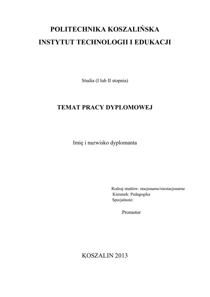 POLITECHNIKA KOSZALIŃSKA INSTYTUT TECHNOLOGII I EDUKACJI Studia (I lub II stopnia) TEMAT PRACY DYPLOMOWEJ Imię i nazwisko dyplomanta Rodzaj studiów: stacjonarne/niestacjonarne Kierunek: Pedagogika Specjalność: Promotor KOSZALIN 2013