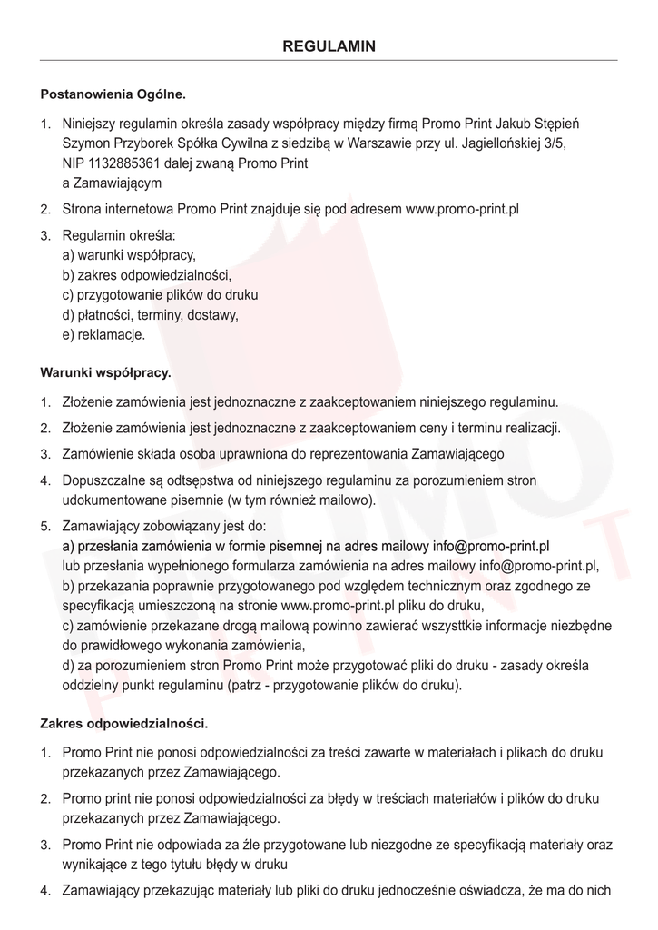 REGULAMIN Postanowienia Ogólne. 1. Niniejszy regulamin określa zasady współpracy między firmą Promo Print Jakub Stępień Szymon Przyborek Spółka Cywilna z siedzibą w Warszawie przy ul. Jagiellońskiej 3/5, NIP 1132885361 dalej zwaną Promo Print a Zamawiającym 2. Strona internetowa Promo Print znajduje się pod adresem www.promo-print.pl 3. Regulamin określa: a) warunki współpracy, b) zakres odpowiedzialności, c) przygotowanie plików do druku d) płatności, terminy, dostawy, e) reklamacje. Warunki współpracy. 1. Złożenie zamówienia jest jednoznaczne z zaakceptowaniem niniejszego regulaminu. 2. Złożenie zamówienia jest jednoznaczne z zaakceptowaniem ceny i terminu realizacji. 3. Zamówienie składa osoba uprawniona do reprezentowania Zamawiającego 4. Dopuszczalne są odtsępstwa od niniejszego regulaminu za porozumieniem stron udokumentowane pisemnie (w tym również mailowo). 5. Zamawiający zobowiązany jest do: ������������������������������������������������������������������������������� a) przesłania zamówienia w formie pisemnej na adres mailowy [email protected] lub przesłania wypełnionego formularza zamówienia na adres mailowy [email protected], b) przekazania poprawnie przygotowanego pod względem technicznym oraz zgodnego ze specyfikacją umieszczoną na stronie www.promo-print.pl pliku do druku, c) zamówienie przekazane drogą mailową powinno zawierać wszysttkie informacje niezbędne do prawidłowego wykonania zamówienia, d) za porozumieniem stron Promo Print może przygotować pliki do druku - zasady określa oddzielny punkt regulaminu (patrz - przygotowanie plików do druku). Zakres odpowiedzialności. 1. Promo Print nie ponosi odpowiedzialności za treści zawarte w materiałach i plikach do druku przekazanych przez Zamawiającego. 2. Promo print nie ponosi odpowiedzialności za błędy w treściach materiałów i plików do druku przekazanych przez Zamawiającego. 3. Promo Print nie odpowiada za źle przygotowane lub niezgodne ze specyfikacją materiały oraz wynikające z tego tytułu błędy w druku 4. Zamawiający przekazując materiały lub pliki do druku jednocześnie oświadcza, że ma do nich pełne prawa autorskie. 5. Promo Print nie ponosi odpowiedzialności za opóżnienia firm kurierskich 6. Promo Print nie ponosi odpowiedzialności za opóżnienia w realizacji spowodowane klęskami żywiołowymi oraz siłami wyższymi. Przygotowanie plików do druku 1. Poprawne przygotowanie plików do druku określa specyfikacja techniczna zamieszczona na stronie internetowej Promo Print. 2. Za porozumieniem stron Promo Print może przygotować plik do druku 3. Promo Print przygotowuje plik do druku na podstawie materiałów przesłanych przez Zamawiającego, jego wytycznych lub ogólnych ustaleń udokumentowanych pisemnie (w tym również mailowo). 4. Zamawiający akceptuje przygotowany przez Promo Print plik do druku jednoczesnie oświadczając, że spełnia jego oczekiwania i biorąc na siebie pełną odpowiedzialność za treści i wszelkiego rodzaju błędy. 5. Promo Print nie bierze na siebie odpowiedzialności za nieprawidłową realizację zlecenia powstałą w wyniku przygotowania pliku do druku niezgodnego ze specyfikacją zamieszczoną na stronie internetowej Promo Print. Płatności, terminy, dostawy. 1. Płatność realizowana jest na podstawie faktury pro forma, faktury gotówkowej, faktury z odroczonym terminem płatności. 2. Płatność można realizować w następujący sposób: ������������������������ a) gotówką przy odbiorze b) przelewem bankowym na konto Promo Print 3. Zamawiający jest zobowiązany do opłacenia zlecenia lub wpłacenia zaliczki przed przystąpieniem do realizacji zlecenia przez Promo Print 4. Promo Print zastrzego sobie prawo do odmowy realizacji zlecenia w przypadku nie spełnienia powyższego punktu. 5. Przy długofalowej współpracy możliwe jest realizowanie płatności gotówką przy odbiorze zrealizowanego zlecenia na podstawie faktury gotówkowej lub płatności przelewem na podstawie faktury z odroczonym terminem płatności na mocy indywidualnych ustaleń między Zamawiającym a Promo Print udokumentowanych pisemnie (w tym również mailowo) 6. Termin realizacji zlecenia ustalany jest indywidualnie do każdego zamówienia. 7. Termin realizacji liczony jest w dniach roboczych odpowiednio: od momentu złożenia prawidłowego zamówienia, dostarczenia prawidłowo przygotowanych plików do druku, akcpetacji plików przygotowanych przez Promo Print, zaksięgowania wpłaty na koncie bankowym Promo Print lub przesłaniu potwierdzenia przelewu. 8. Promo Print nie ponosi odpowiedzialności za opóźnienia w realizacji zlecenia wynikające z winy Zamawiającego. 9. Dostawy realizowane są w dni robocze w godz. 8-16. 10. Na podstawie indywidualnych ustaleń dostawy mogą być realizowane w innych terminach. 11. Dostawy są realizowane bezpośrednio przez Promo Print oraz we współpracy z firmami kurierskimi. 12. Dostawy realizowane przez zewnętrzne firmy kurierskiej objęte są osobnymi regulaminami dostępnymi na stronach przewoźnika. 13. Promo Print nie odpowiada za wszlkie szkody powstałe z winy firm kurierskich. Reklamacje. 1. Reklamację składa Zamawiający 2. Reklamacji podlega towar uszkodzony lub niezgodny z zamówieniem 3. Reklamacji nie podlega ilość zmawianego towaru jeśli mieści się w +-3% między ilością zamówioną a otrzymaną. 4. Reklamacji nie obejmują szkody spowodowane przez firmy kurierskie, ale Promo Print dokłada wszelkich starań aby szkody te zostały zrekompensowane przez przewoźnika jeśli: ��� a) Odbiorca ��������������������������������������������������