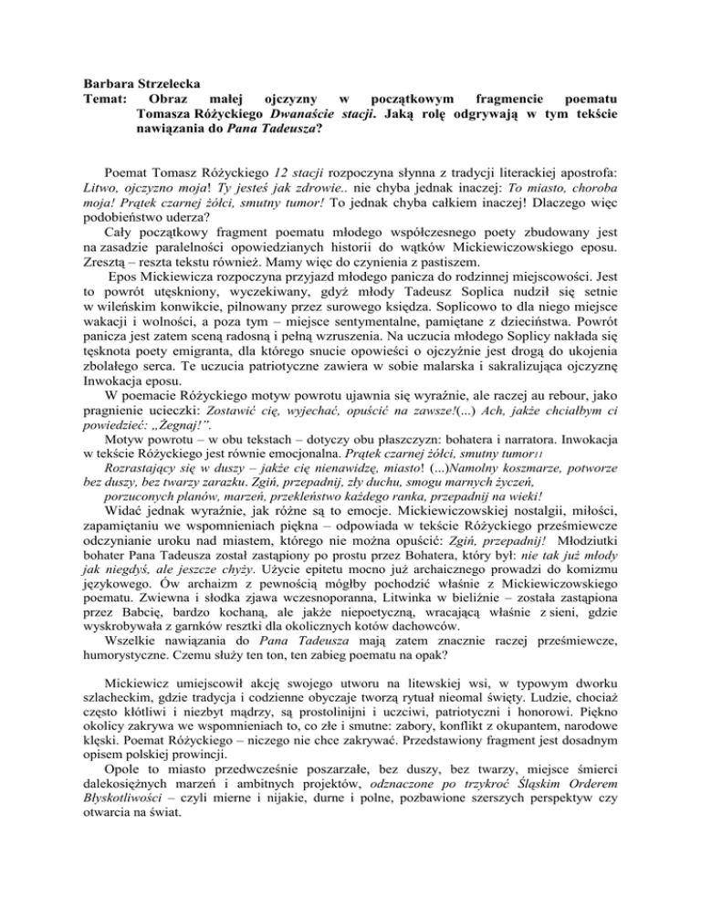 Barbara Strzelecka Temat: Obraz małej ojczyzny w początkowym fragmencie poematu Tomasza RóŜyckiego Dwanaście stacji. Jaką rolę odgrywają w tym tekście nawiązania do Pana Tadeusza? Poemat Tomasz RóŜyckiego 12 stacji rozpoczyna słynna z tradycji literackiej apostrofa: Litwo, ojczyzno moja! Ty jesteś jak zdrowie.. nie chyba jednak inaczej: To miasto, choroba moja! Prątek czarnej Ŝółci, smutny tumor! To jednak chyba całkiem inaczej! Dlaczego więc podobieństwo uderza? Cały początkowy fragment poematu młodego współczesnego poety zbudowany jest na zasadzie paralelności opowiedzianych historii do wątków Mickiewiczowskiego eposu. Zresztą – reszta tekstu równieŜ. Mamy więc do czynienia z pastiszem. Epos Mickiewicza rozpoczyna przyjazd młodego panicza do rodzinnej miejscowości. Jest to powrót utęskniony, wyczekiwany, gdyŜ młody Tadeusz Soplica nudził się setnie w wileńskim konwikcie, pilnowany przez surowego księdza. Soplicowo to dla niego miejsce wakacji i wolności, a poza tym – miejsce sentymentalne, pamiętane z dzieciństwa. Powrót panicza jest zatem sceną radosną i pełną wzruszenia. Na uczucia młodego Soplicy nakłada się tęsknota poety emigranta, dla którego snucie opowieści o ojczyźnie jest drogą do ukojenia zbolałego serca. Te uczucia patriotyczne zawiera w sobie malarska i sakralizująca ojczyznę Inwokacja eposu. W poemacie RóŜyckiego motyw powrotu ujawnia się wyraźnie, ale raczej au rebour, jako pragnienie ucieczki: Zostawić cię, wyjechać, opuścić na zawsze!(...) Ach, jakŜe chciałbym ci powiedzieć: „śegnaj!”. Motyw powrotu – w obu tekstach – dotyczy obu płaszczyzn: bohatera i narratora. Inwokacja w tekście RóŜyckiego jest równie emocjonalna. Prątek czarnej Ŝółci, smutny tumor11 Rozrastający się w duszy – jakŜe cię nienawidzę, miasto! (...)Namolny koszmarze, potworze bez duszy, bez twarzy zarazku. Zgiń, przepadnij, zły duchu, smogu marnych Ŝyczeń, porzuconych planów, marzeń, przekleństwo kaŜdego ranka, przepadnij na wieki! Widać jednak wyraźnie, jak róŜne są to emocje. Mickiewiczowskiej nostalgii, miłości, zapamiętaniu we wspomnieniach piękna – odpowiada w tekście RóŜyckiego prześmiewcze odczynianie uroku nad miastem, którego nie moŜna opuścić: Zgiń, przepadnij! Młodziutki bohater Pana Tadeusza został zastąpiony po prostu przez Bohatera, który był: nie tak juŜ młody jak niegdyś, ale jeszcze chyŜy. UŜycie epitetu mocno juŜ archaicznego prowadzi do komizmu językowego. Ów archaizm z pewnością mógłby pochodzić właśnie z Mickiewiczowskiego poematu. Zwiewna i słodka zjawa wczesnoporanna, Litwinka w bieliźnie – została zastąpiona przez Babcię, bardzo kochaną, ale jakŜe niepoetyczną, wracającą właśnie z sieni, gdzie wyskrobywała z garnków resztki dla okolicznych kotów dachowców. Wszelkie nawiązania do Pana Tadeusza mają zatem znacznie raczej prześmiewcze, humorystyczne. Czemu słuŜy ten ton, ten zabieg poematu na opak? Mickiewicz umiejscowił akcję swojego utworu na litewskiej wsi, w typowym dworku szlacheckim, gdzie tradycja i codzienne obyczaje tworzą rytuał nieomal święty. Ludzie, chociaŜ często kłótliwi i niezbyt mądrzy, są prostolinijni i uczciwi, patriotyczni i honorowi. Piękno okolicy zakrywa we wspomnieniach to, co złe i smutne: zabory, konflikt z okupantem, narodowe klęski. Poemat RóŜyckiego – niczego nie chce zakrywać. Przedstawiony fragment jest dosadnym opisem polskiej prowincji. Opole to miasto przedwcześnie poszarzałe, bez duszy, bez twarzy, miejsce śmierci dalekosięŜnych marzeń i ambitnych projektów, odznaczone po trzykroć Śląskim Orderem Błyskotliwości – czyli mierne i nijakie, durne i polne, pozbawione szerszych perspektyw czy otwarcia na świat. Niemnowi i jego czystym wodom odpowiada rzeka w Opolu: o barwie sinobrunatnej, z pięknym rtęciowym poblaskiem, z pianami detergentu i mazutu. Arkadyjski opis Soplicowa zastępuje okropny widok na papierkowe lasy okalające Opole, zamienione w naturalne ubikacje. Opole – choć dziura to niewielka – nie ma w sobie nic z uroku naturalnego, to miasto przemysłowe, zanieczyszczone i szare. Poemat RóŜyckiego nie jest jednak potępieniem ani krajobrazu, ani ludzi. Wręcz przeciwnie, to tekst równie sentymentalny, co poemat Mickiewicza. Przybycie Bohatera w odwiedziny do Babci to jeden z najradośniejszych dla niego momentów. Bo Babcia – to instytucja ciepła, dobroci i miłości, to chodząca opieka oraz modlitwa. To serce i czułość, którą obdarzony wnuk czuje się lepszy. Z pobytów u babci przechowuje w pamięci tysiące wspomnień, jak choćby te o lepieniu pierogów, o smakołykach wkładanych na poŜegnanie ukradkiem do kieszeni (czasem to moŜe być ryba!). Dom babci to miejsce zabaw i odkryć, jak to o ciele człowieka i pozycjach gimnastycznych ze starej poniemieckiej ksiąŜki. Poza babcią są jeszcze ciotki i stryjowie oraz dalsi znajomi, równie prości, jak ich soplicowskie odpowiedniki, równie serdeczni matka, bracia krewni, sąsiedzi dobrzy. Bohater RóŜyckiego, który wolał wybrać karierę intelektualną, przybywa na tę okropną opolską prowincję bez poczucia wyŜszości i bez niechęci. Zachował w sercu miłość do świata i ludzi, gdyŜ zasadą scalającą ten świat małej ojczyzny jest właśnie bliskość, serdeczność, pomocność. I nic to nie szkodzi, Ŝe pomidory hoduje się tu w pojemnikach po margarynie. Widok przemyślności gospodyni, która wykorzystuje kubki po jogurcie, znajduje drugie zastosowanie dla odpadów i surowców wtórnych – wywołuje w nim po prostu wzruszenie. Mała ojczyzna, choć niepiękna, jest kochana. Poemat wieszcza – teŜ oparty był na humorze. Tradycja odczytywania i nauczania szkolnego obdarła go, niestety, z dowcipu, zostawiając tylko napuszony patriotyzm. Czy RóŜycki próbuje odświeŜyć ów komizm Pana Tadeusza? Raczej nie, gdyŜ akcenty humorystyczne umi
