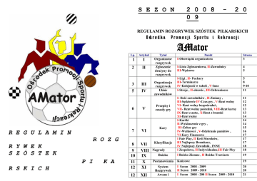 S E Z O N 2 0 0 8 0 9 - 2 0 REGULAMIN ROZGRYWEK SZÓSTEK PIŁKARSKICH Ośrodka Promocji Sportu i Rekreacji AMator Lp. R E G U L A M I N Artykuł Tytuł 1 I 2 II Organizator rozgrywek Zgłoszenie druŜyny do rozgrywek 3 III 5 IV 6 V 7 VI 8 9 10 11 12 VII VIII IX X XI 12 XII R O Z G R Y W E K S Z Ó S T E K P I R S K I C H K A Organizacja rozgrywek Ubiór zawodników Przepisy i zasady gry Kary Klasyfikacje Nagrody Boisko Postanowienia System Rozgrywek Awans i Punkt Strona I-Obowiązki organizatora 3 I-Lista Zgłoszeniowa, II-Zawodnicy III-Wpisowe 4 5 I-Ligi , II- Puchary III-Terminarze IV-Kolejność w tabeli , V-Inne I-Stroje , II-obuwie , III-Ochraniacze 5 8 9-10 11 I- Ilość zawodników , II-Zmiany , III-Sędziowie IV-Czas gry , V-Rzut wolny VI- Rzut wolny bezpośredni , VII- Rzut wolny pośredni, VIII-Rzut karny IX-Rzut z autu , X-Rzut z bramki XI-Rzut roŜny I-Kartki II-Wykluczenie z gry , III-Zakaz gry IV-Walkower , V-Odebranie punktów , VI-Kary Finansowe I Fair Play, II Król Strzelców, III Najlepszy Bramkarz, IV Najlepszy Zawodnik , INNE I Zespołowe, II Indywidualne,III Fair Pley 11 12 12 13 13 14 14 14 15 16 17 17 17 18 18 I Boisko Ziemne , II Boisko Trawiaste 19 Końcowe 19 I Sezon 2008 - 2009 II Sezon 2009 - 2010 I Sezon 2008 - 200 II Sezon 2009 - 2010 20 20 21 nadzoruje prawidłowy przebieg rozgrywek i zgodność ich przebiegu z niniejszym regulaminem. Spadek STLSP OPSiR -1– Super TOYA Liga Szóstek Piłkarskich Ośrodka Promocji Sportu i Rekreacji AMator ( rozgrywki na sztucznej trawie ) LSP OPSiR – Liga Szóstek Piłkarskich Ośrodka Promocji Sportu i Rekreacji AMator ( rozgrywki na boiskach ziemnych) LZSP OPSiR – Liga Zakładowa Szóstek Piłkarskich Ośrodka Promocji Sportu i Rekreacji Amator ( rozgrywki na sztucznej trawie ) LBSP OPSiR – Liga Biznesu Szóstek Piłkarskich Ośrodka Promocji Sportu i Rekreacji Amator ( rozgrywki na sztucznej trawie ) LFSP OPSiR – Liga Firm Szóstek Piłkarskich Ośrodka Promocji Sportu i Rekreacji Amator ( rozgrywki na sztucznej trawie ) ŁLMSP OPSiR – Łódzka Liga Mediów Szóstek Piłkarskich Ośrodka Promocji Sportu i Rekreacji AMator ( rozgrywki na sztucznej trawie ) -2- Artykuł I Organizator rozgrywek Organizatorem rozgrywek jest: Ośrodek Promocji Sportu i Rekreacji AMator, który Obowiązki organizatora: 1. Opracowuje terminarz rozgrywek. 2. Weryfikuje wyniki spotkań . 3. Dokonuje obsady sędziowskiej. 4. Rozpatruje protesty zgłoszone przez druŜyny w trakcie rozgrywek. 5. Prowadzi ewidencję zawodników oraz statystykę rozgrywek. 6. Zapewnia szatnie z prysznicami. 7. Ubezpieczenie rozgrywek. 8. Zapewniaj piłki do gry. 9. Organizuje spotkania z druŜynami przed kaŜdą rundą : - Jesień przedostatni lub ostatni poniedziałek sierpnia - Wiosna drugi lub trzeci poniedziałek marca ( dokładne daty zostaną podane na stronie WWW.opsir.pl ). OBECNOŚĆ PRZEDSTAWICIELI DRUśYNY NA SPOTKANIU PRZED ROZGRYWKAMI JEST OBOWIAZKOWA. BRAK REPREZENTANTA DRUśYNY WYKLUCZA JĄ Z ROZGRYWEK. Artykuł II Zgłoszenie druŜyny do rozgrywek I Lista Zgłoszenie. 1. Listę zgłoszeniowa zawiera : a- dokładną nazwę druŜyny. b- listę zawodników / max 25 zawodników , (…… ) zawierającą: imię i nazwisko zawodnika PESEL lub datę urodzenia, informacje, w jakiej druŜynie grał w poprzednim sezonie oraz informacje o udziale zawodnika w rozgrywkach PZPN (w przypadku nie posiadania nr PESEL, datę urodzenia i nr dokumentu ). c- nazwisko, imię, kontakt telefoniczny i adres email osoby odpowiedzialnej za druŜynę. 2. Lista zgłoszeniowa zostaje złoŜona u organizatora na spotkaniu przed rozpoczęciem rozgrywek. 3. Zmianę zawodnika dokonuje się poprzez wykreślenie starego i wpisanie nowego zawodnika w protokole meczowym. a- zespoły mogą dokonywać zmian zawodników do 4 kolejki od końca rundy rewanŜowej b- suma wszystkich zawodników zgłoszonych w rundzie nie morze przekroczyć 25 graczy bez limitu zmian w rundzie. c- zawodnik danej ligi wykreślony z listy po 4 kolejce nie morze być zgłoszony do innej druŜyny tej samej ligi. d- zawodnik, który zostanie wykreślony z listy danego zespołu nie morze do końca rundy być ponownie zgłoszony w tej druŜynie. 4. W przerwie między rozgrywkami moŜna dokonać nieograniczoną ilość zmian. -35. Do 4 kolejki ten sam zawodnik moŜe grać w róŜnych zespołach tej samej klasy rozgrywkowej, ale tylko w jednej druŜynie w tej samej kolejce. W przypadku rozegrania meczu w więcej niŜ jednej druŜynie zespól, którym zawodnik rozegrał następny mecz zostaje ukarany walkowerem a zawodnik moŜe być ukarany dyskwalifikacją od 1 do 4 meczy 6. Jeśli więcej niŜ jedna druŜyna zgłosi tego samego zawodnika w tej samej klasie rozgrywkowej to jest on przypisany do tego zespołu, w którym rozegra pierwszy mecz po czwartej kolejce. 7. Ten sam zawodnik moŜe grać w więcej niŜ jednym zespole, ale w róŜnych klasach rozgrywkowych. 8. Zawodnik zgłoszony w więcej niŜ jednej druŜynie w meczach Pucharowych moŜe grać tylko w jednej z nich. Jest zawodnikiem tej druŜyny w której pierwszej rozegrał mecz pucharowy. 9. Zawodnik zgłoszony w OPSiR nie moŜe grać w przypadku baraŜy w druŜynie z poza ośrodka. 10. Zawodnicy niepełnoletni tj. między 16 a 18 rokiem Ŝycia mogą uczestniczyć w rozgrywkach na podstawie pisemnej zgody rodziców lub prawnych opiekunów, dołączonej do listy zgłoszeniowej. W wyjątkowych sytuacjach po zwróceniu się do organizatora z prośbą na piśmie moŜe on wyrazić zgodę na grę młodszych zawodników a- za pierwszym razem mecz zostaje odwołany (bez konsekwencji walkoweru) i przełoŜony na inny termin druŜyna zostaje obciąŜona kosztami przełoŜenia meczu. b- następnie mecz zostaje odwołany a zespół zostaje ukarany. 4. DruŜyny ponadto muszą wpłacić przed końcem rozgrywek zaliczkę) na poczet następnej rundy. (100 zł rozgrywki LSP OPSiR 500 zł pozostałe ) 5. W przypadku braku powyŜszej wpłaty organizator przyjmuje ze , dru