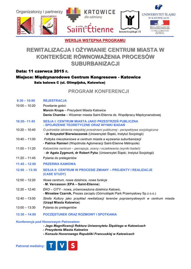 O Orrggaanniizzaattoorrzzyy ii ppaarrttnneerrzzyy -------------------------------------------------------------------------------------------------------------------------------------------------------------------- WERSJA WSTĘPNA PROGRAMU R RE EW WIITTA ALLIIZZA AC CJJA A II O OŻŻY YW WIIA AN NIIE EC CE EN NTTR RU UM MM MIIA AS STTA AW W K KO ON NTTE EK KŚ ŚC CIIE ER RÓ ÓW WN NO OW WA AŻŻE EN NIIA AP PR RO OC CE ES SÓ ÓW W S SU UB BU UR RB BA AN NIIZZA AC CJJII Data: 11 czerwca 2015 r. Miejsce: Międzynarodowe Centrum Kongresowe - Katowice Sala balowa C (ul. Olimpijska, Katowice) PROGRAM KONFERENCJI 9:30 – 10:00 REJESTRACJA 10:00 – 10:20 Powitanie gości: Marcin Krupa – Prezydent Miasta Katowice Denis Chambe – Wicemer miasta Saint-Etienne ds. Współpracy Międzynarodowej 10:20– 11:45 SESJA I: CENTRUM MIASTA JAKO PRZESTRZEŃ PUBLICZNA - SPOJRZENIE TEORETYCZNE ORAZ WYNIKI BADAŃ O potrzebie istnienia miejskiej przestrzeni publicznej - perspektywa socjologiczna - dr Krzysztof Bierwiaczonek (Uniwersytet Śląski, Instytut Socjologii) 10:20 – 10:40 10:40 – 11:00 Polityka mieszkaniowa w centrum miasta a wyzwania suburbanizacji - Patrice Rainieri (Wspólnota Aglomeracji Saint-Etienne Métropole) 11:00 – 11:20 Katowickie centrum – percepcja, oceny i oczekiwania (wyniki badań) - dr Agata Zygmunt, dr Robert Pyka (Uniwersytet Śląski, Instytut Socjologii) 11:20 – 11:45 Pytania do prelegentów 11:45 – 12:00 PRZERWA KAWOWA 12:00 – 13:30 SESJA II: CENTRUM W PROCESIE ZMIANY – PROJEKTY I REALIZACJE (CASE STUDY) 12:00 – 12:20 Nowe centrum, nowe dzielnice, nowe funkcje - M. Vercasson (EPA – Saint-Etienne) 12:20 – 12:40 EKO – CITY - nowa, zrównoważona dzielnica Katowic, - Mirosław Czarnik, Prezes zarządu (Górnośląski Park Przemysłowy Sp.z o.o.) 12:40 – 13:00 Strefa Kultury jako przykład rewitalizacji terenów poprzemysłowych w centrum miasta (Urząd Miasta Katowice) 13:00 – 13:30 Pytania do prelegentów 13:30 – 14:00 POCZĘSTUNEK ORAZ ROZMOWY I SPOTKANIA Konferencja pod Honorowym Patronatem: - Jego Magnificencji Rektora Uniwersytetu Śląskiego w Katowicach - Prezydenta Miasta Katowice - Konsula Honorowego Republiki Francuskiej w Katowicach Patronat medialny: O Orrggaanniizzaattoorrzzyy ii ppaarrttnneerrzzyy -------------------------------------------------------------------------------------------------------------------------------------------------------------------- KONTEKST I PROBLEMATYKA KONFERENCJI Przyciąganie mieszkańców do centrum miasta, jako kluczowej miejskiej przestrzeni publicznej, miejsca spotkań, wymiany i ekspresji, ale także życia, kiedy strategię ożywiania centrum łączy się z właściwą polityką mieszkaniową, stanowi upowszechniający się w dużych europejskich miastach trend rozwojowy. Strategia ta może także korespondować z dążeniem do ograniczenia żywiołowej suburbanizacji, a tym samym ochrony niezabudowanych zielonych terenów podmiejskich. Uczynienie z centrum miasta przestrzeni życia mieszkańców nie jest jednak zadaniem łatwym, szczególnie w tych miastach, których specyficzny rozwój nie sprzyjał wykształceniu tradycyjnego rynku miejskiego. Miasta partnerskie, Katowice i Saint-Etienne, realizują obecnie szereg projektów mających na celu ożywienie centralnych obszarów miasta poprzez nadanie im nowych funkcji. W przypadku Saint-Etienne postawiono sobie za cel ożywienie rynku poprzez poszerzenie przestrzeni pieszych, wsparcie drobnego handlu oraz nową ofertę mieszkaniową. Jednocześnie obrano strategię rozwoju zorientowanych funkcjonalnie dzielnic centralnych, w tym dzielnicy biznesowej czy dzielnicy kreatywności i designu. Katowice obrały podobny kierunek strefowego rozwoju centralnych przestrzeni miejskich, czego przykładem może być strefa kultury, mieszcząca szereg powiązanych funkcjonalnie obiektów koncentrujących ofertę kulturalną miasta. W obszarze ścisłego centrum udanym przykładem ożywiania przestrzeni publicznych wydaje się być ulica Mariacka. Obecnie jednak miasto staje przed ogromnym wyzwaniem, jakim jest oddanie do użytku mieszkańców „nowego rynku” i jego przekształcenie w żywą przestrzeń publiczną. Trudno ten cel osiągnąć, nie znając preferencji mieszkańców w zakresie funkcji, obiektów i atrakcji, jakie rynek powinien oferować jego użytkownikom. Wiedzę taką mogą dostarczyć badania przeprowadzane przez pracowników Instytutu Socjologii Uniwersytetu Śląskiego, których pierwsze wyniki zostaną przedstawione na konferencji.