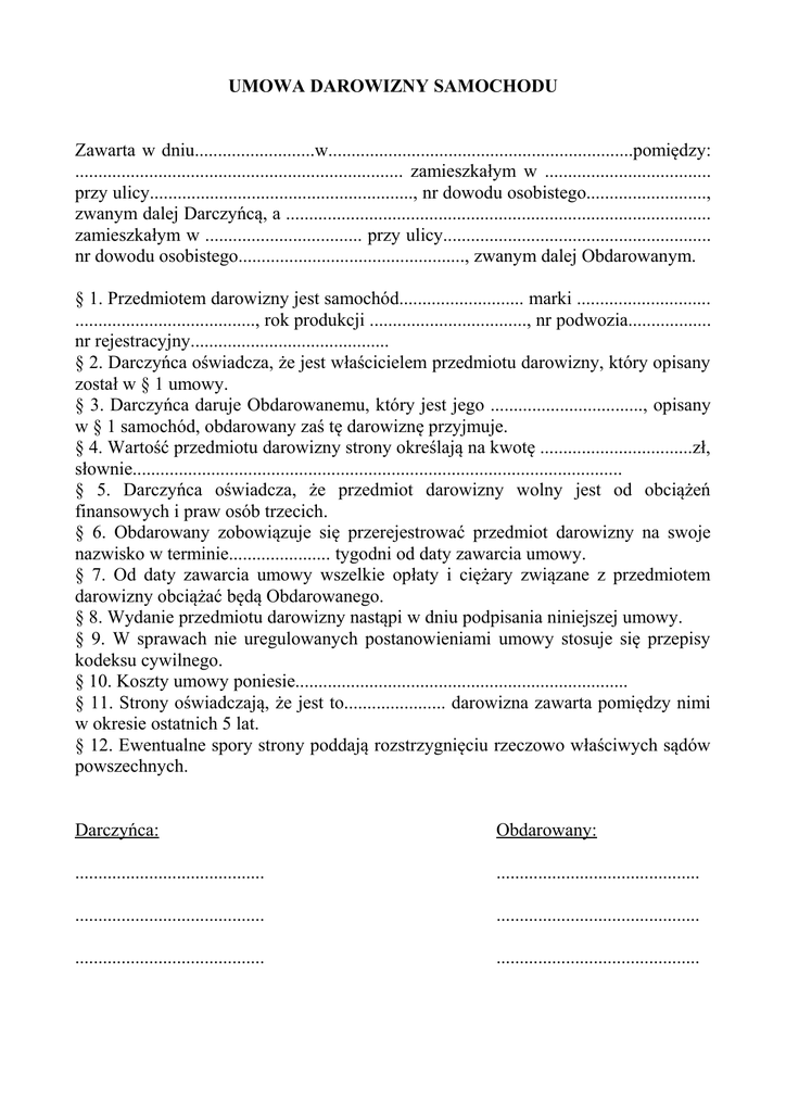 UMOWA DAROWIZNY SAMOCHODU Zawarta w dniu..........................w..................................................................pomiędzy: ....................................................................... zamieszkałym w .................................... przy ulicy........................................................., nr dowodu osobistego.........................., zwanym dalej Darczyńcą, a ............................................................................................ zamieszkałym w .................................. przy ulicy.......................................................... nr dowodu osobistego................................................., zwanym dalej Obdarowanym. § 1. Przedmiotem darowizny jest samochód........................... marki ............................. ......................................., rok produkcji .................................., nr podwozia.................. nr rejestracyjny........................................... § 2. Darczyńca oświadcza, że jest właścicielem przedmiotu darowizny, który opisany został w § 1 umowy. § 3. Darczyńca daruje Obdarowanemu, który jest jego ................................., opisany w § 1 samochód, obdarowany zaś tę darowiznę przyjmuje. § 4. Wartość przedmiotu darowizny strony określają na kwotę .................................zł, słownie.......................................................................................................... § 5. Darczyńca oświadcza, że przedmiot darowizny wolny jest od obciążeń finansowych i praw osób trzecich. § 6. Obdarowany zobowiązuje się przerejestrować przedmiot darowizny na swoje nazwisko w terminie...................... tygodni od daty zawarcia umowy. § 7. Od daty zawarcia umowy wszelkie opłaty i ciężary związane z przedmiotem darowizny obciążać będą Obdarowanego. § 8. Wydanie przedmiotu darowizny nastąpi w dniu podpisania niniejszej umowy. § 9. W sprawach nie uregulowanych postanowieniami umowy stosuje się przepisy kodeksu cywilnego. § 10. Koszty umowy poniesie........................................................................ § 11. Strony oświadczają, że jest to...................... darowizna zawarta pomiędzy nimi w okresie ostatnich 5 lat. § 12. Ewentualne spory strony poddają rozstrzygnięciu rzeczowo właściwych sądów powszechnych. Darczyńca: Obdarowany: ......................................... ............................................ ......................................... ............................................ ......................................... ............................................