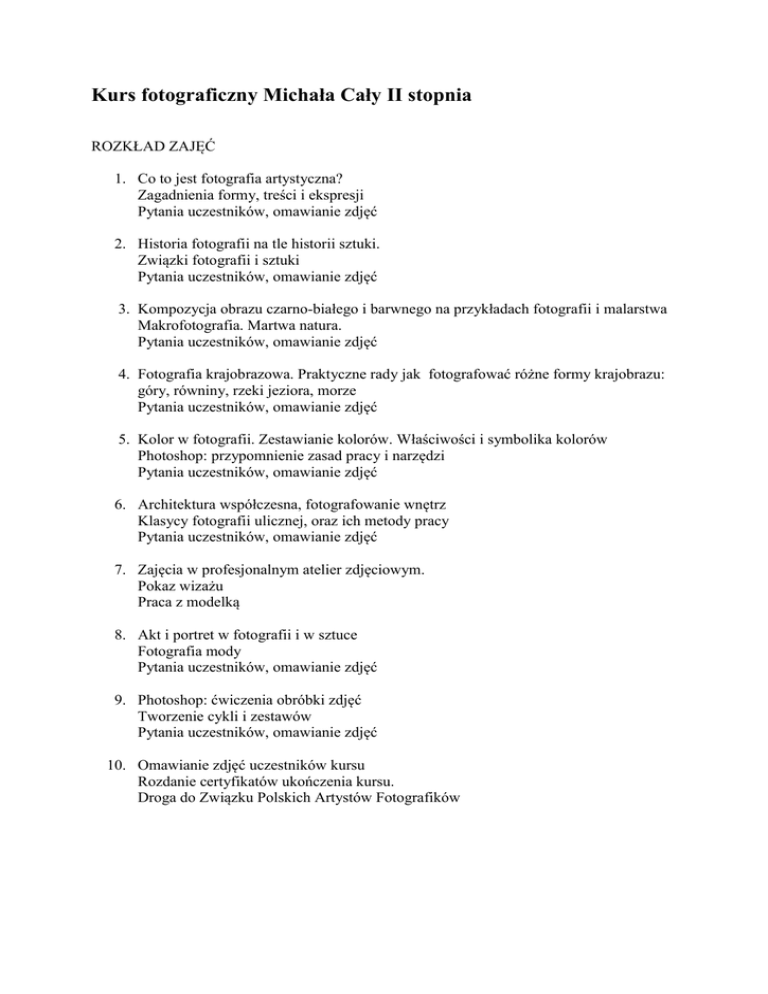 Kurs fotograficzny Michała Cały II stopnia ROZKŁAD ZAJĘĆ 1. Co to jest fotografia artystyczna? Zagadnienia formy, treści i ekspresji Pytania uczestników, omawianie zdjęć 2. Historia fotografii na tle historii sztuki. Związki fotografii i sztuki Pytania uczestników, omawianie zdjęć 3. Kompozycja obrazu czarno-białego i barwnego na przykładach fotografii i malarstwa Makrofotografia. Martwa natura. Pytania uczestników, omawianie zdjęć 4. Fotografia krajobrazowa. Praktyczne rady jak fotografować różne formy krajobrazu: góry, równiny, rzeki jeziora, morze Pytania uczestników, omawianie zdjęć 5. Kolor w fotografii. Zestawianie kolorów. Właściwości i symbolika kolorów Photoshop: przypomnienie zasad pracy i narzędzi Pytania uczestników, omawianie zdjęć 6. Architektura współczesna, fotografowanie wnętrz Klasycy fotografii ulicznej, oraz ich metody pracy Pytania uczestników, omawianie zdjęć 7. Zajęcia w profesjonalnym atelier zdjęciowym. Pokaz wizażu Praca z modelką 8. Akt i portret w fotografii i w sztuce Fotografia mody Pytania uczestników, omawianie zdjęć 9. Photoshop: ćwiczenia obróbki zdjęć Tworzenie cykli i zestawów Pytania uczestników, omawianie zdjęć 10. Omawianie zdjęć uczestników kursu Rozdanie certyfikatów ukończenia kursu. Droga do Związku Polskich Artystów Fotografików